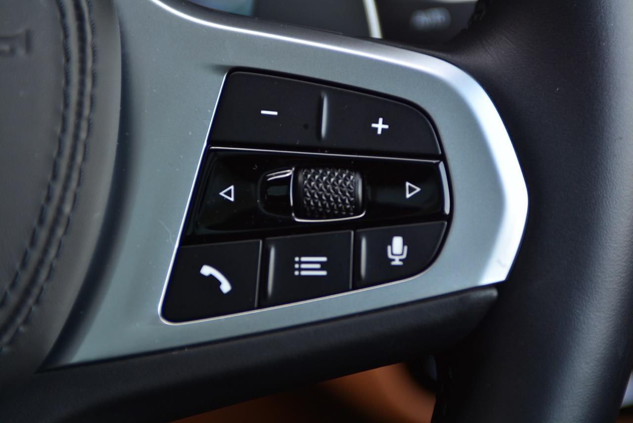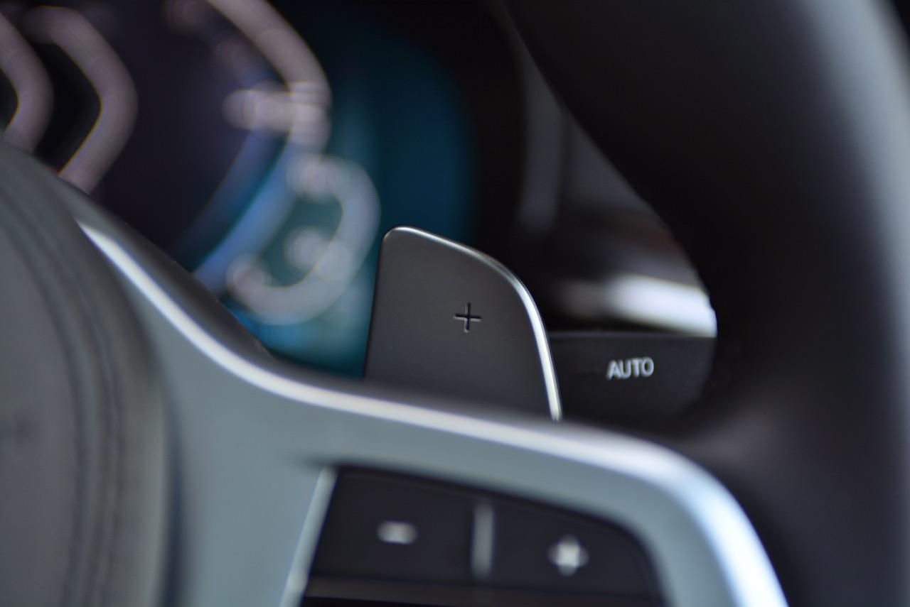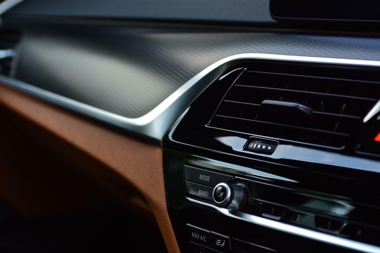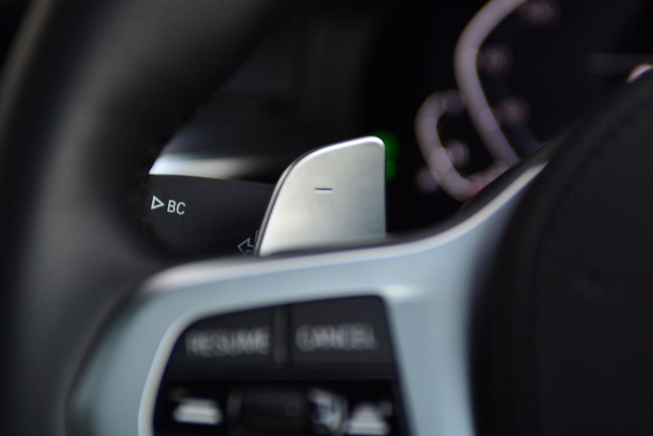 พวงมาลัย M-Sport แบบสามก้าน ทำจากวัสดุเกรดสูง ไม่ว่าจะเป็นหนังแท้ที่ใช้หุ้มรอบวงที่ค่อนข้างอวบอ้วนทำให้จับได้อย่างถนัดมือ ก้านวงติดตั้งสวิตช์สั่งงานต่างๆ ของระบบเครื่องเสียง การเลือกดูข้อมูลในจอภาพ MID รับหรือวางสายโทรศัพท์แบบบลูทูธ ปุ่มควบคุมปรับตั้งความเร็วอัตโนมัติ Cruise Control และที่ขาดไม่ได้สำหรับ Series-5 เวอร์ชั่น M-Sport ก็คือแป้นเปลี่ยนตำแหน่งเกียร์หลังพวงมาลัยหรือ Paddle Shift ใน 530e นั้นขนาดของแป้นเปลี่ยนเกียร์รวมถึงวัสดุที่ใช้ทำตัวแป้นนั้นจัดออกมาได้สวยงามน่าใช้งาน แทบจะคล้ายกับ Paddle ของ BMW M5 กันเลยทีเดียว พวงมาลัยปรับไฟฟ้าได้ 4 ทิศทางครอบคลุมท่านั่งและสรีระของคนขับทั้งหมดไม่ว่าจะอ้วนเตี้ยสูงโย่งหรือมีหุ่นแบบนายแบบนางแบบก็ปรับและขับได้อย่างถนัดรัดกุม ที่ชอบก็คือ พวงมาลัยจะยกตัวเมื่อดับเครื่องยนต์แล้วเปิดประตู เพื่อเปิดพื้นที่ออกจากห้องโดยสาร ฟังก์ชั่นประตูดูด ช่วยเพิ่มความสบายไม่ต้องออกแรงปิดประตูเหมือนรุ่นเก่า