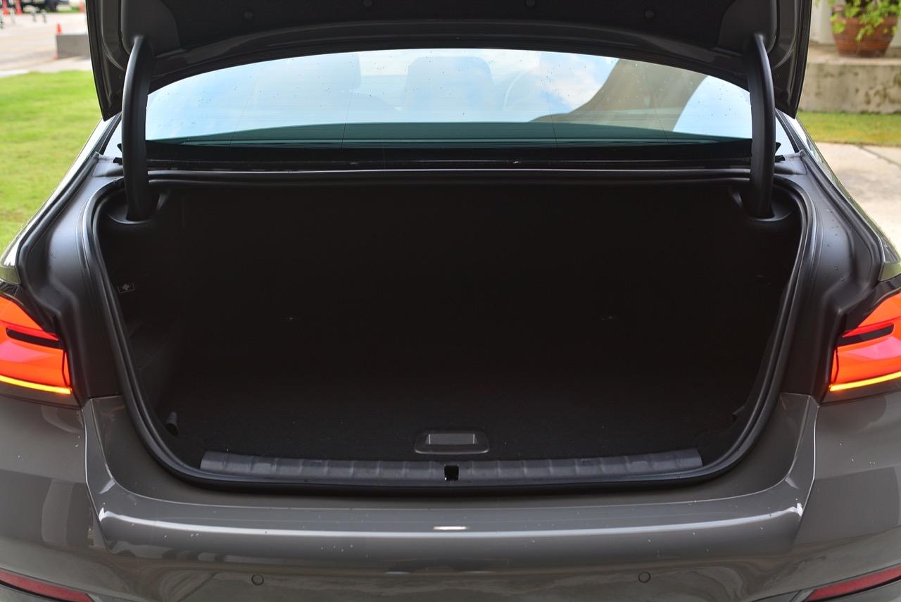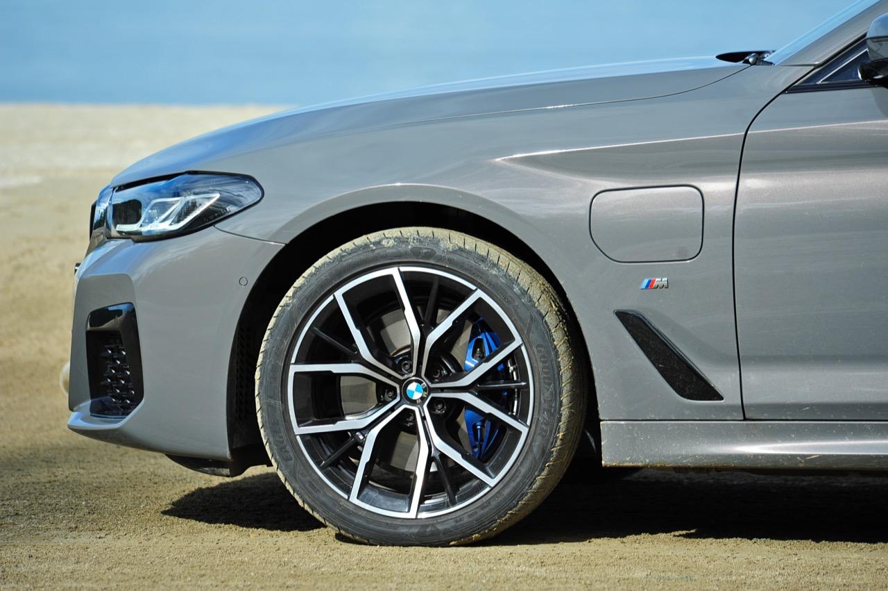 มาดูที่งานสีกันบ้าง BMW 530e M Sport คันทดสอบ พ่นสีตัวถังใหม่ ด้วยสีเทาสุดสวย Bernina Grey Amber Effect รวมถึงสีน้ำเงิน Phytonic Blue ใน BMW520d M Sport ที่เคยทดสอบไปแล้วเมื่อช่วงต้นปี มิติตัวถังของ BMW 530e M-Sport มีความกว้าง 1,869 มิลลิเมตร ยาว 4,936 มิลลิเมตร และสูง 1,483 มิลลิเมตร ความยาวฐานล้อวัดจากดุมหน้าไปหลัง 2,975 มิลลิเมตร ความกว้างล้อหน้า 1,604 มิลลิเมตร หลัง 1,631 มิลลิเมตร ระยะห่างจากพื้นถนนถึงใต้ท้องรถ 150 มิลลิเมตร ความจุถังเชื้อเพลิง 46 ลิตร น้ำหนักตัวรถทั้งคันอยู่ที่ 1,770 กิโลกรัม ล้ออัลลอย M ลายใหม่ล่าสุด แบบห้าก้านคู่ ล้างทำความสะอาดได้ง่ายพอสมควร โดยเฉพาะการล้วงเข้าไปเช็ดถูคาร์ลิปเปอร์เบรก M สีน้ำเงิน ล้อ M ขอบ 19 นิ้ว ห่อรัดด้วยยาง Goodyear Eagle F1 run flat ยางหน้าขนาด 245/40 R19 ส่วนยางหลังซึ่งรับหน้าที่ขับเคลื่อน ใส่ยางไซล์ 275/35 R19