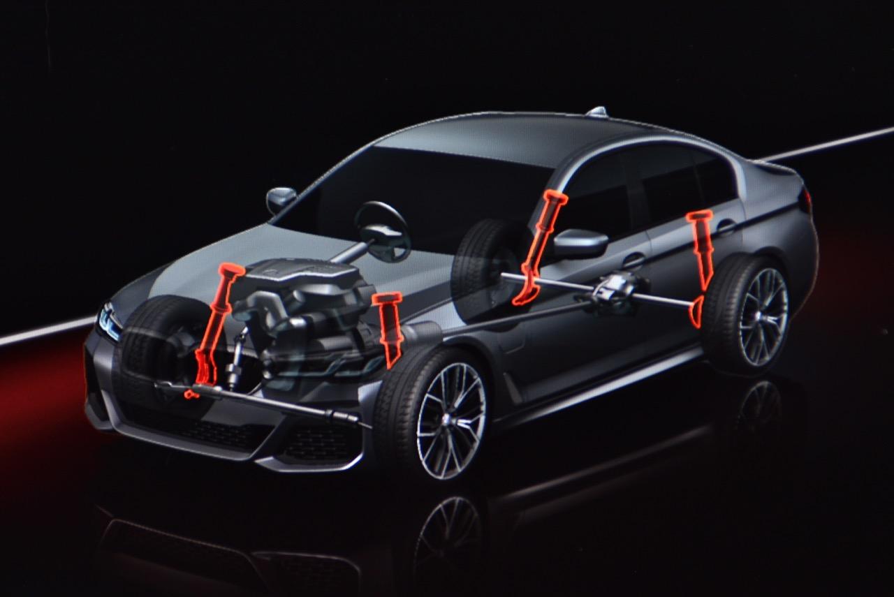 ระบบรองรับหรือช่วงล่างของ BMW 530e LCI ด้านหน้าแบบดับเบิลวิชโบน สปริง โช้คอัพและกันโคลง ส่วนด้านหลังเป็นแบบมัลติลิงก์ สปริง โช้คอัพและกันโคลง พร้อมโช้คอัพไฟฟ้า Adaptive Suspension ปีกนกและแขนยึดทำจากอะลูมินั่มอัลลอยทั้งหน้าและหลัง ทำให้น้ำหนักใต้สปริงลดลง ส่งผลให้ช่วงล่างทำงานเต็มประสิทธิภาพ โดยมีการปรับการทำงานของโช้คอัพให้ส่งถ่ายความนิ่มนวลได้มากกว่า 530eรุ่นก่อนปรับโฉม ยางของ 530e เป็นยางรันแฟลต ล้ออัลลอยลาย M ขนาด 19 นิ้ว พร้อมยางสปอร์ต ล้อหน้าไซส์ 245/40 R19 ล้อหลังซึ่งเป็นล้อขับเคลื่อนยัดยางใหญ่ขึ้นมาอีกนิดที่ไซส์ 275/35 R19 เป็นยางยี่ห้อ Goodyear รุ่น Eagle f1 ที่มีประสิทธิภาพการใช้งานดีพอสมควร เหมาะกับผิวถนนที่มีความหลากหลายในประเทศไทย