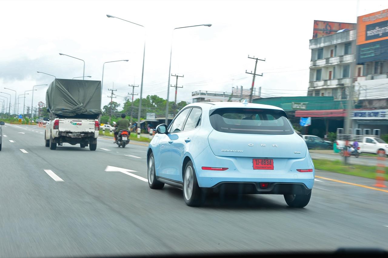 วัสดุภายในห้องโดยสารให้สัมผัสนุ่ม ไล่จากแดชบอร์ดคอนโซล แผงประตู เบาะโดยสาร ORA ใช้วัสดุที่มีคุณภาพในการตกแต่งภายในด้วยดีไซน์ที่สวยงาม มีสัมผัสที่นุ่มนวล ให้ความรู้สึกสบาย ยืดหยุ่นและสัมผัสที่นิ่มใช้ได้ เบาะที่นั่งออกแบบตามหลักสรีรศาสตร์ ตกแต่งอย่างประณีต เบาะที่นั่งปรับไฟฟ้าพร้อมฟังก์ชัน Welcome Seat ช่วยให้คนสามารถเข้า-ออกจากรถได้อย่างง่าย เมื่อดับเครื่องยนต์เปิดประตูคนขับ เบาะของคนขับจะเลื่อนถอยหลังเพื่อเปิดพื้นที่ในการเข้า-ออกให้กว้างขึ้น ระบบเบาะนวดไฟฟ้า เพื่อผ่อนคลายความเมื่อยล้าของผู้ขับ ฟังก์ชันนี้ผมไม่ได้ลอง เนื่องจากต้องรีบเร่งขับทดสอบ จากกรุงเทพฯ ไปยังฉะเชิงเทรา แล้ววกกลับ ท่ามกลางสายฝนที่โปรยปรายลงมาทั้งวัน หาช่วงเวลาที่ผ่อนคลายไม่ค่อยจะได้ ถนนสุวินทวงศ์ยังคงอุดมไปด้วยรถที่วิ่งกันเกือบจะเต็มทุกช่องทาง การเฝ้าจับอาการขณะวิ่งของเจ้าแมวบนผิวถนนที่ค่อนข้างลื่นทำให้ฟังก์ชันนวดไม่ได้ถูกเปิดใช้งาน ส่วนหลังคาพาโนรามิคซันรูฟ เพิ่มพื้นที่แสงสว่าง และเปิดมุมมองรับชมวิวทิวทัศน์ได้ แต่เอาเข้าจริงๆ กระจกหลังคาไฟฟ้านั้นมีไว้เพื่อความเท่มากกว่าจะใช้งานกันจริงๆ จังๆ อากาศในประเทศไทยไม่ได้เย็นสบายตลอดทั้งปี ส่วนใหญ่จะร้อนจัดและมีฝนตกหนัก Panoramic Roof กระจกหลังคาไฟฟ้าจึงมีไว้แค่เท่เท่านั้น ส่วนฟังก์ชันอินเทอร์เน็ตเพื่อความบันเทิงในรถยนต์ การเชื่อมต่อกับแอปพลิเคชัน ฟังเพลง วิดีโอ ต้องกดสั่งงานที่หน้าจอ หรือสั่งงานด้วยเสียง ต้องเข้าออกจากฟังก์ชันที่หน้าจอ การออกแบบซอฟต์แวร์ที่ควบรวมการใช้งานอันหลากหลาย ต้องใช้เวลาอยู่กับระบบเพื่อสร้างความคุ้นชินในการใช้งานกันพอสมควร สำหรับระบบ Cockpit Cleaning System พร้อมระบบกรองอากาศ PM2.5 ช่วยเปิดการไหลเวียนของอากาศจากภายนอกจากระยะไกลเพื่อระบายอากาศ โดยอัตโนมัติ ช่วยลดปริมาณฝุ่น PM2.5 เมื่อเข้าสู่ห้องโดยสาร เบาะหลังออกแบบให้พับได้ เพื่อเพิ่มพื้นที่ในการบรรทุกสัมภาระได้สูงสุด 858 ลิตร เกียร์ระบบ Electronic Shifter เพื่อลดขนาดพื้นที่คอนโซลกลาง ระบบชาร์จไร้สาย (Wireless Charging) ไม่ได้ลอง เพราะโทรศัพท์ของผมยังคงเป็น iPhone รุ่นพระเจ้าเหาที่ไม่ค่อยจะเข้ากับเทคโนโลยีของการชาร์จแบบใหม่