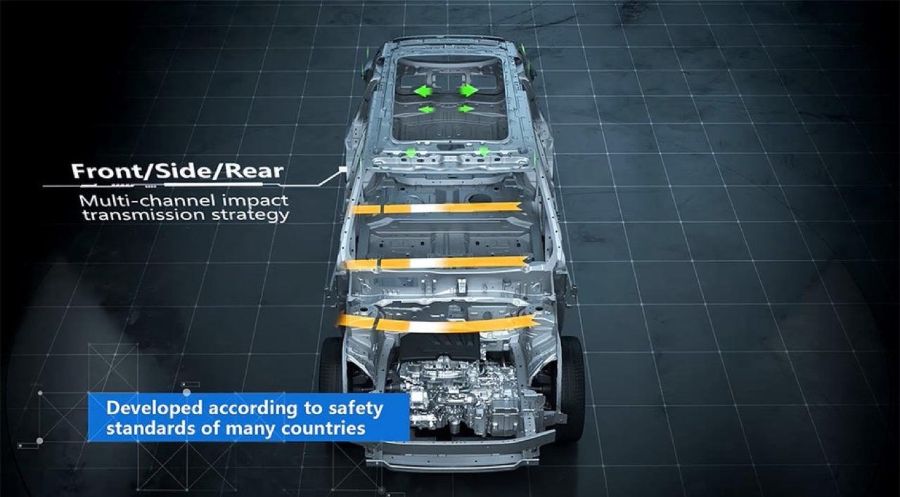 เหล็กขึ้นรูปร้อนที่มีความแข็งแรงสูงเป็นพิเศษที่สามารถต้านทานแรงดึงได้ 1,520 Mpa รวมไปถึงเหล็กกล้าความแข็งแรงสูง 65% และเหล็กเทอร์โมฟอร์ม 8 ชิ้น ทำหน้าที่ดูดซับและลดแรงกระแทก