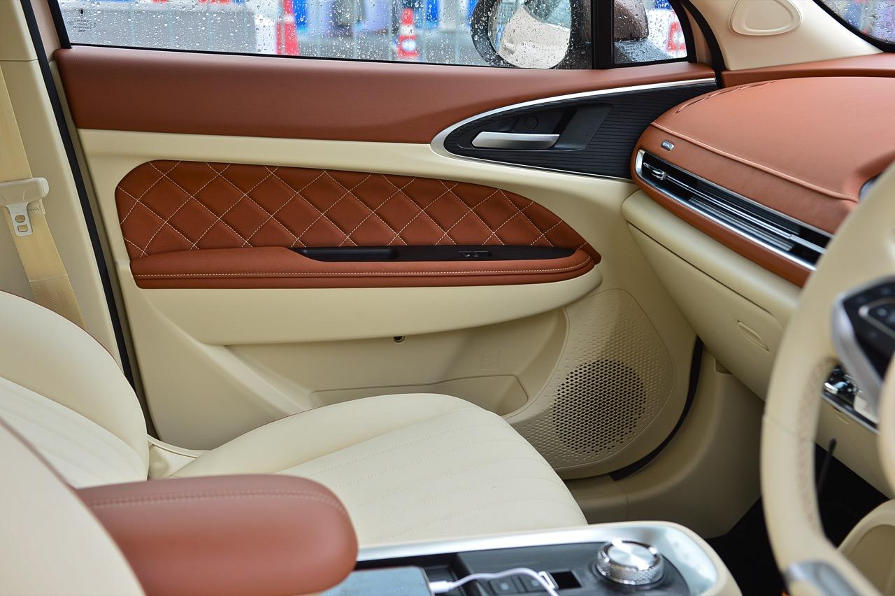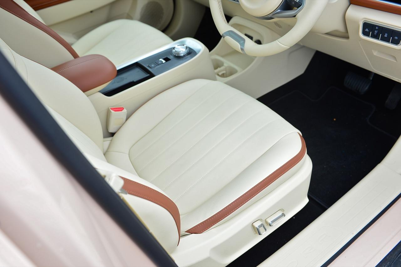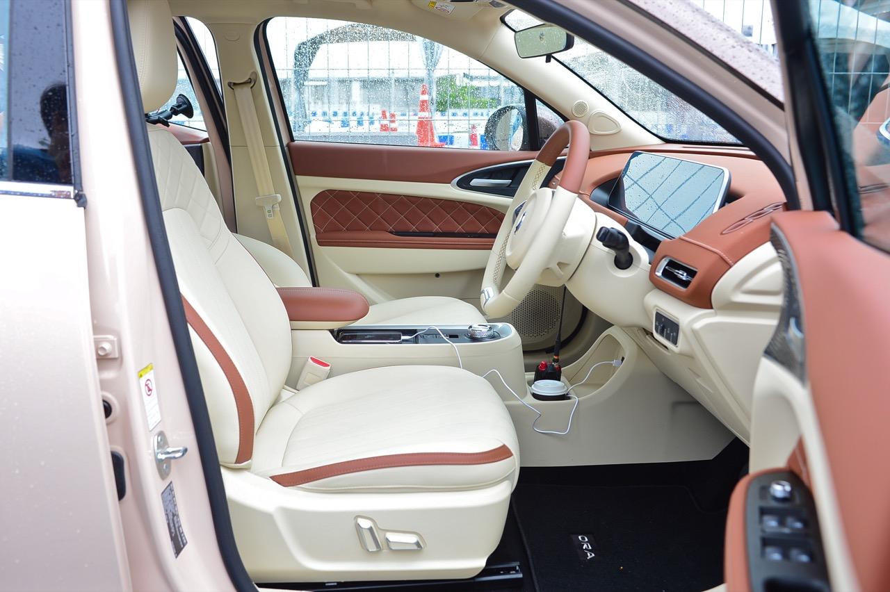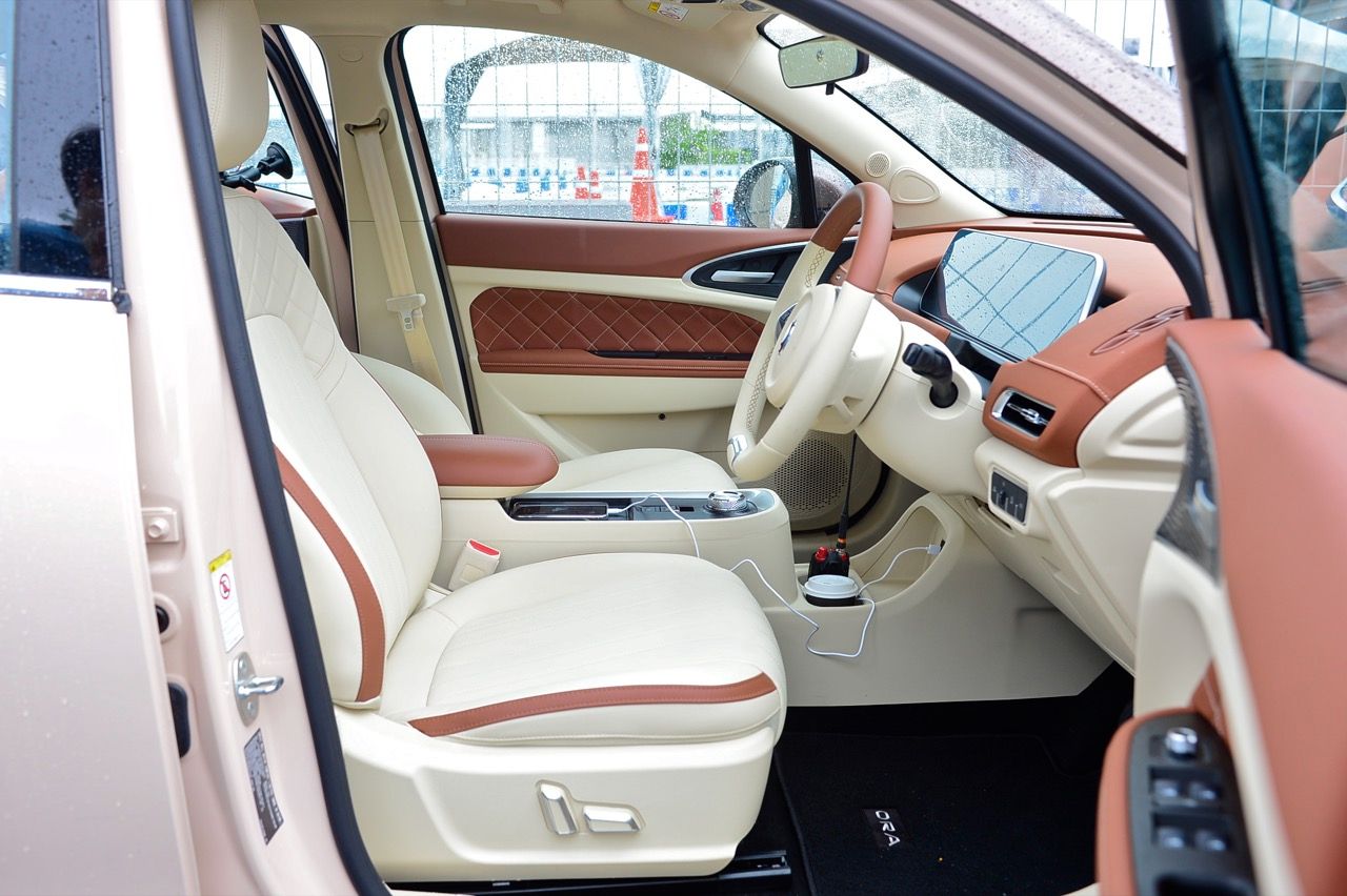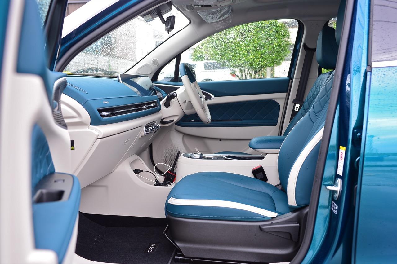 การออกแบบภายในของ ORA Good Cat รุ่น 500 Ultra คันทดสอบสีเขียว ต้องยอมรับว่าทำออกมาได้อย่างโดดเด่น จุดที่ทำได้ดีก็คือ วัสดุพวกหนังสังเคราะห์ที่ใช้ห่อหุ้มชิ้นงานต่างๆ ไม่ว่าจะเป็นแดชบอร์ด คอนโซล เบาะ แผงประตู ผ้าบุหลังคา พรมปูพื้น และพลาสติกภายใน เป็นของที่มีคุณภาพ ถูกนำมาจัดวางผ่านงานดีไซน์จากนักตกแต่งภายในของ GWM ด้วยความต้องการที่จะสร้างความแตกต่างด้านความหรูหราให้มากกว่ารถญี่ปุ่น การทำตัวคล้ายกับภายในของ MG HS ที่ทำให้ลูกค้าหลายคนติดใจ ด้วยการออกแบบที่ทันสมัย งานประกอบภายในประณีตใช้ได้ โดยเฉพาะรอยต่อต่างๆ งานตัดเย็บ และโทนสีที่เลือกเฉดมาให้ตัดกันอย่างจงใจ โทนสีภายในของ ORA Goodcat รุ่น 500 Ultra มีให้เลือกสองโทนและขึ้นอยู่กับสีของตัวถังภายนอก ถ้าเลือกแมวเขียวหลังคาขาว คุณจะได้ภายในสีเขียวสลับเทา พร้อมงานออกแบบและตัดเย็บแนว Luxury ส่วนคนที่ชอบเจ้าเหมียวสีครีมหลังคาโทนสีเข้ม จะได้ภายในสีเบสผสมกับเฉดสีน้ำตาล เย็บเดินตะเข็บด้วยด้ายสีขาว เฉดสีกับวัสดุที่ดูดี โดยเฉพาะเกรดของพลาสติกนั้นดีกว่ารถญี่ปุ่นบางยี่ห้อ อาจยากต่อการดูแลรักษาให้ใหม่อยู่เสมอแต่สวยงามโดนใจ บ่งบอกถึงความตั้งใจในการผลิต เพื่อทำให้ภายในของเจ้าแมวมีความน่าใช้งาน ร่วมสมัย และสร้างแรงจูงใจของคนที่กำลังเล็งรถไฟฟ้าให้หลงรักแมวแสนดีตัวนี้อย่างโงหัวไม่ขึ้น! จุดที่ชอบก็คือ หนังสังเคราะห์ที่ใช้หุ้มแดชบอร์ดและคอนโซลซึ่งให้ผิวสัมผัสคล้ายๆ กับผ้าไมโครไฟเบอร์หรือหนังกลับ Alcantara เบาะคนขับปรับไฟฟ้า แต่ไม่มีฟังก์ชันยกเบาะส่วนหน้าเพื่อรองต้นขา ส่วนเบาะคนนั่งหน้าในรุ่นสูงสุดยังใช้การปรับมือเพื่อลดต้นทุน