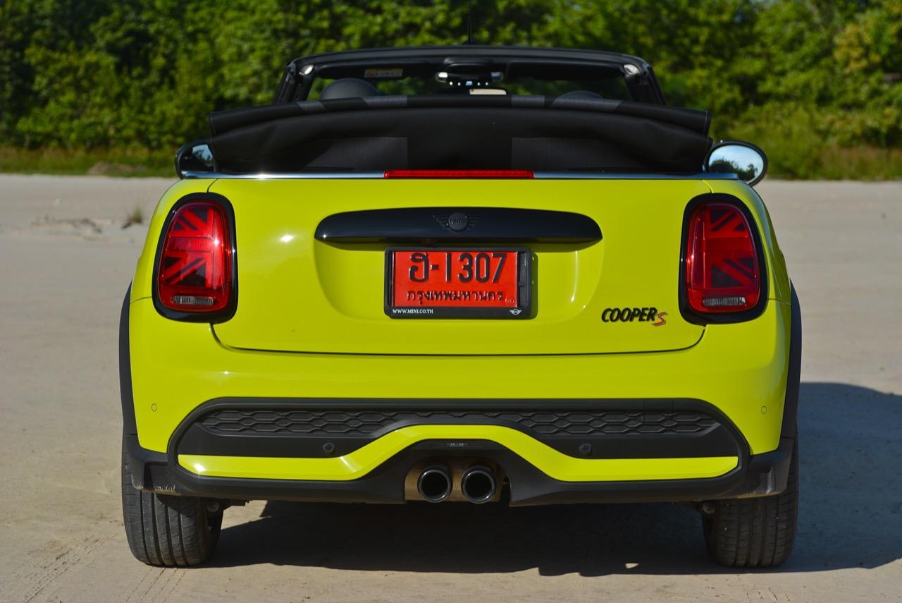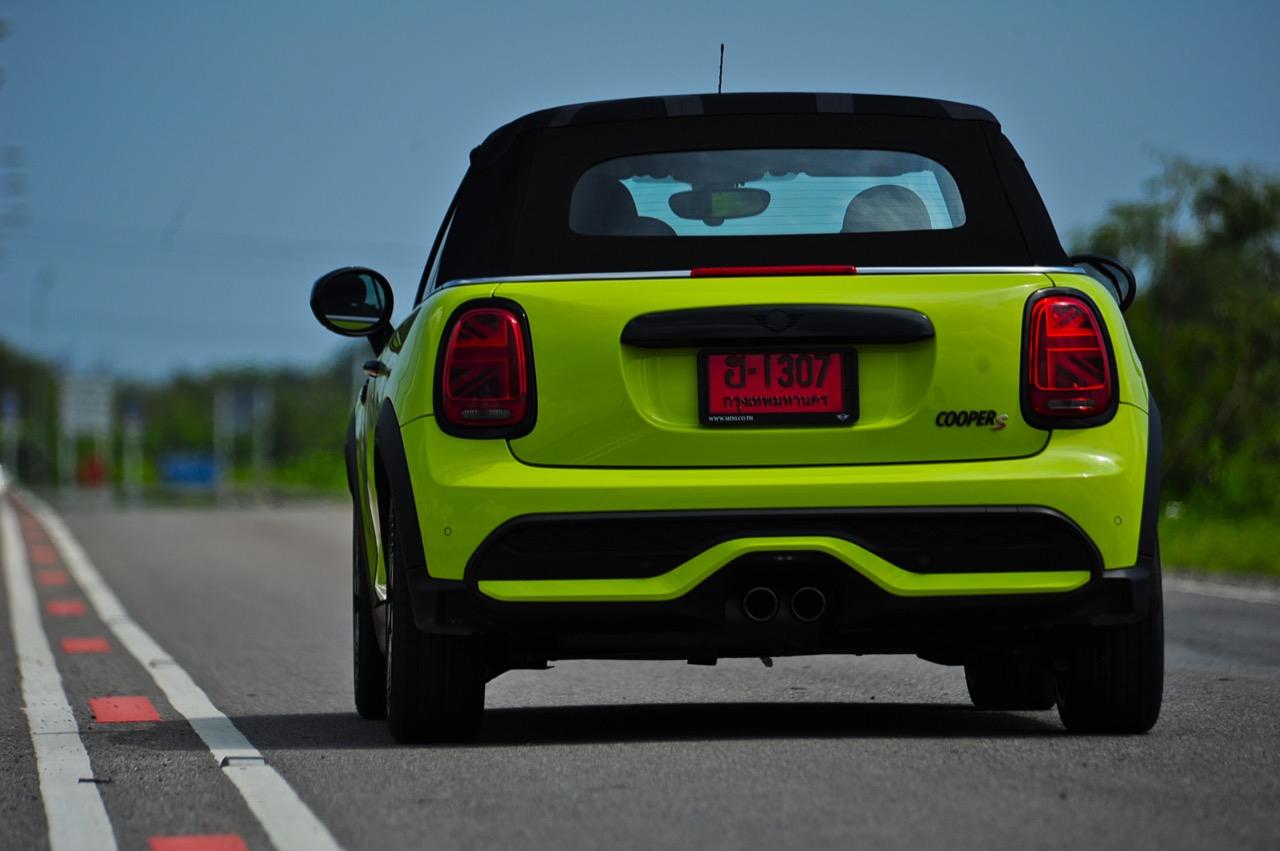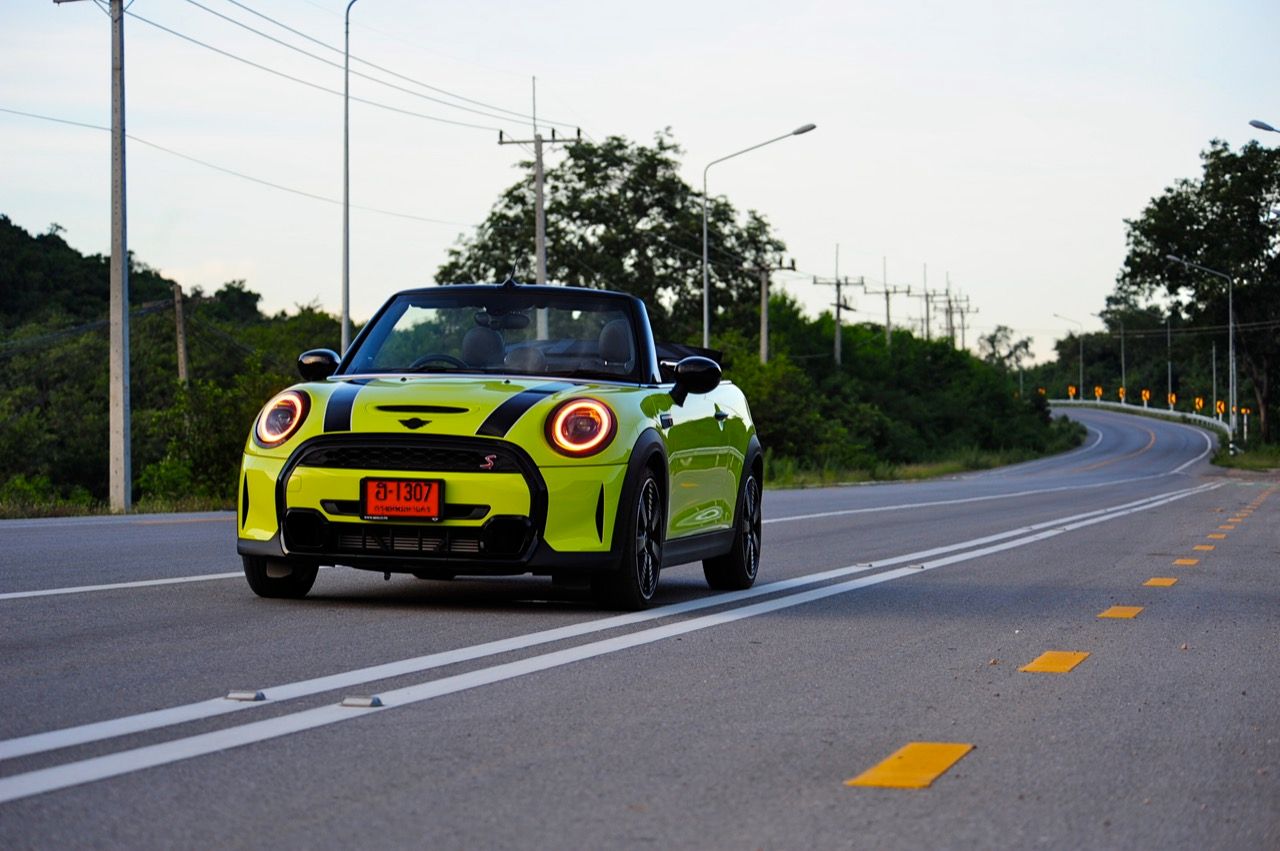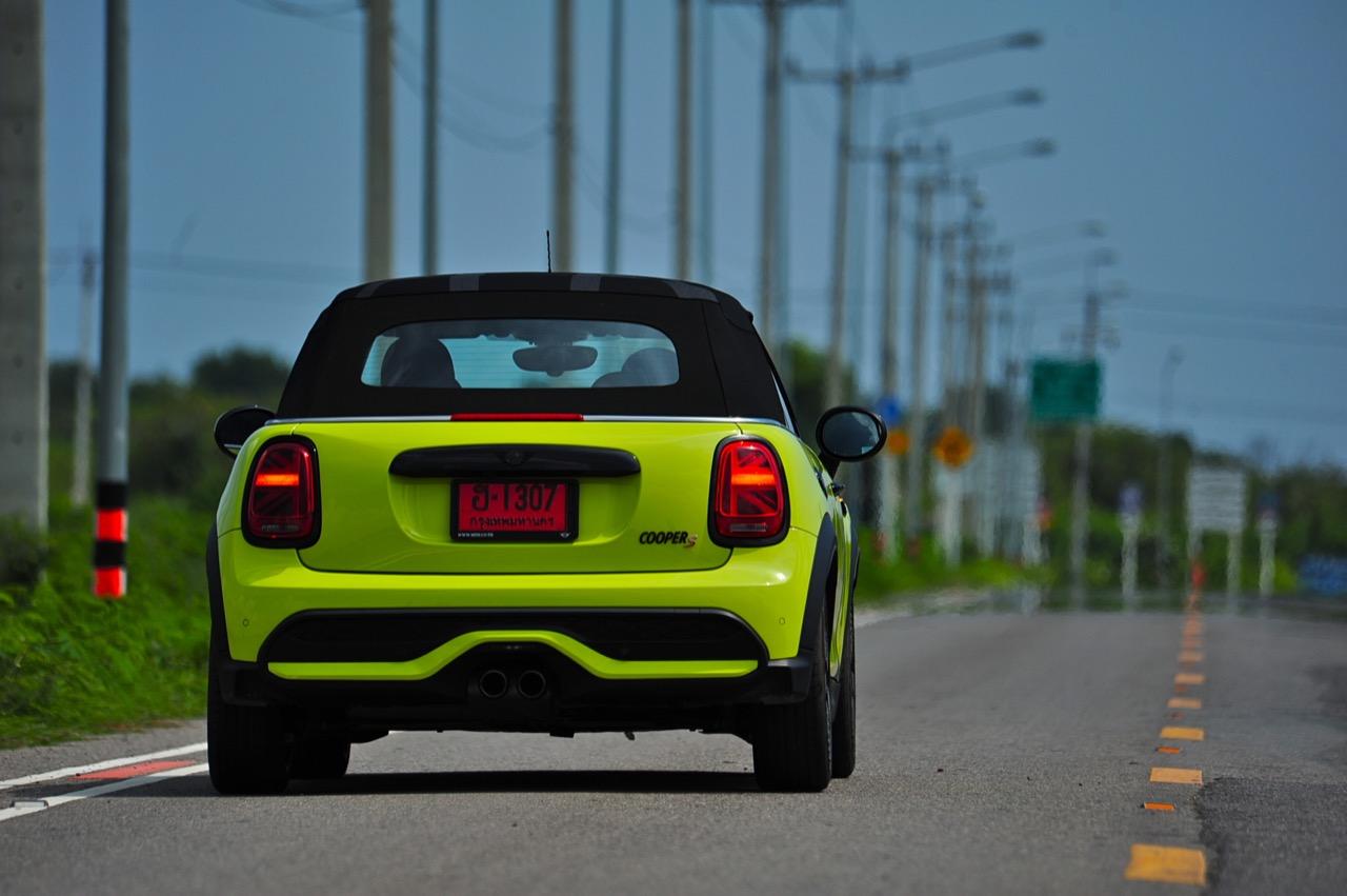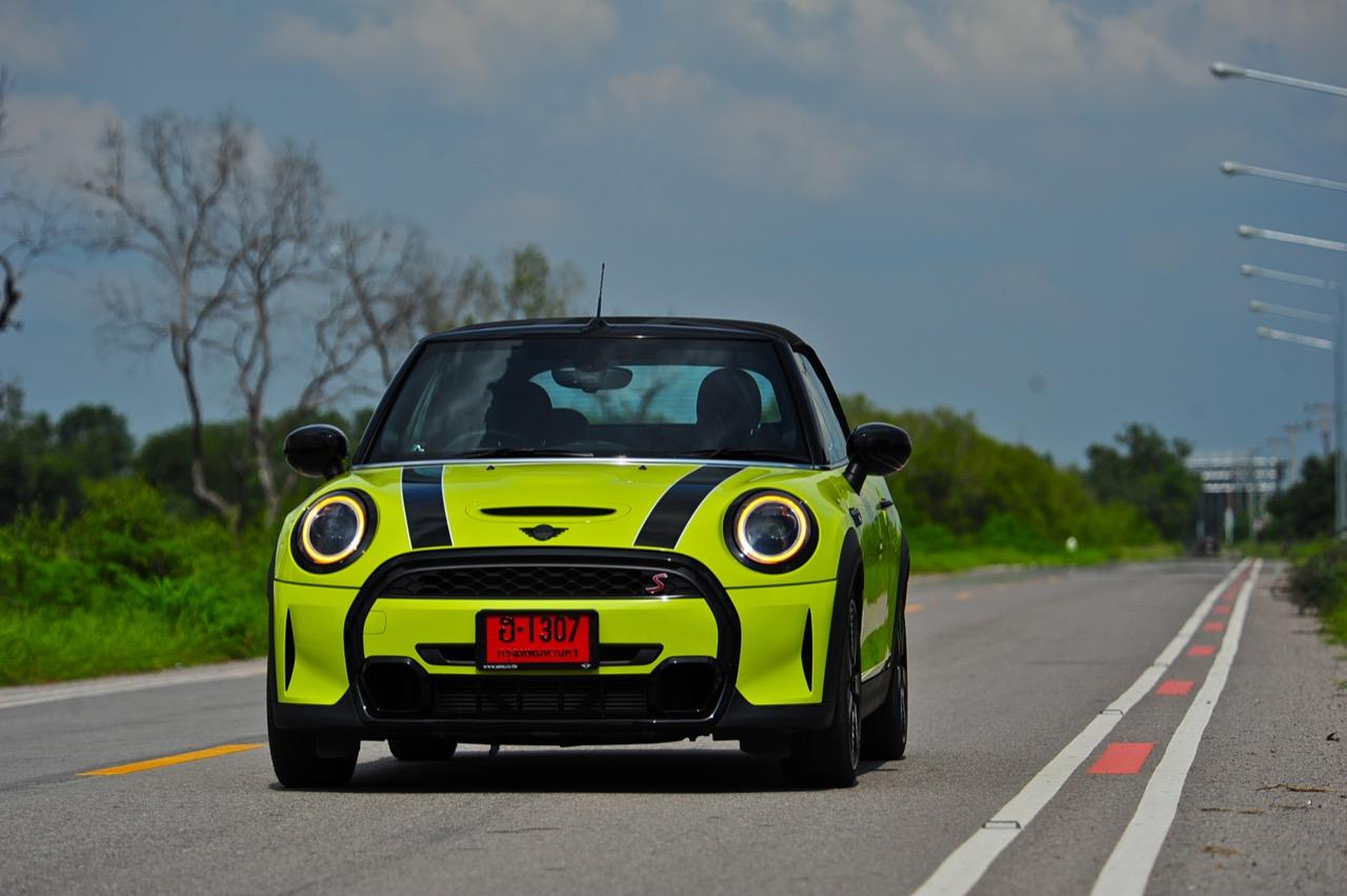 MINI Cooper S LCI Converetible ขยับเดินและก้าวไปไกลลิบเมื่อเทียบกับรุ่นแรก หลังคาผ้าใบความหนาสองชั้น สกรีนธงชาติอังกฤษที่ดูแนวจัดไปนิด สีเหลืองสว่างสดใสเข้ากันได้ดีกับรูปทรงเปิดหลังคา การพับเก็บหรือกางออกใช้เวลาแค่ 18 วินาที คุณสามารถขับมันที่ย่านความเร็วต่ำ (มากๆ) เพื่อพับเก็บ หรือกางออกในวันที่มีอากาศดี ซึ่งมีอยู่แค่ไม่กี่วันในประเทศไทย โหมดสูงสุดหรือ Sport Mode นั้น เมื่อขับเร็วดันไม่เหมาะกับการขับแบบเปิดหลังคา และแม้จะปิดหลังคา เสียงลมปะทะกับตัวถังพร้อมเสียงยางบดไปบนผิวถนนก็จะดังให้ได้ยินอย่างชัดเจน แม้จะวิ่งที่ความเร็วต่ำก็ยังได้ยินอยู่เหมือนเดิม การขับแบบไหลไปเรื่อยๆ ใช้ความเร็วไม่เกิน 80 กิโลเมตรต่อชั่วโมง พร้อมกับพับหลังคาเก็บในช่วงลมหนาวมาเยือนแบบนี้ สร้างความรู้สึกโรแมนติกที่มีความแตกต่างจากการขับรถทั่วไป อาการต่างๆ ค่อนข้างเป็นกลาง ไม่ว่าจะหักเข้าโค้งอย่างรวดเร็วหรือกระโจนผ่านคอสะพาน รวมถึงการเบรกหนักๆ เจ้า MINI Cooper S LCI Converetible ก็ยังทรงตัวได้ดี อัตราเร่งจาก 0-100 ใน 7.1 วินาที ส่วนความเร็วสูงสุดสามารถทะยานไปได้ถึง 230 กิโลเมตรต่อชั่วโมง เป็นรถเล็กที่มีความเร็วปลายคันเร่งเอาเรื่องเลยทีเดียว