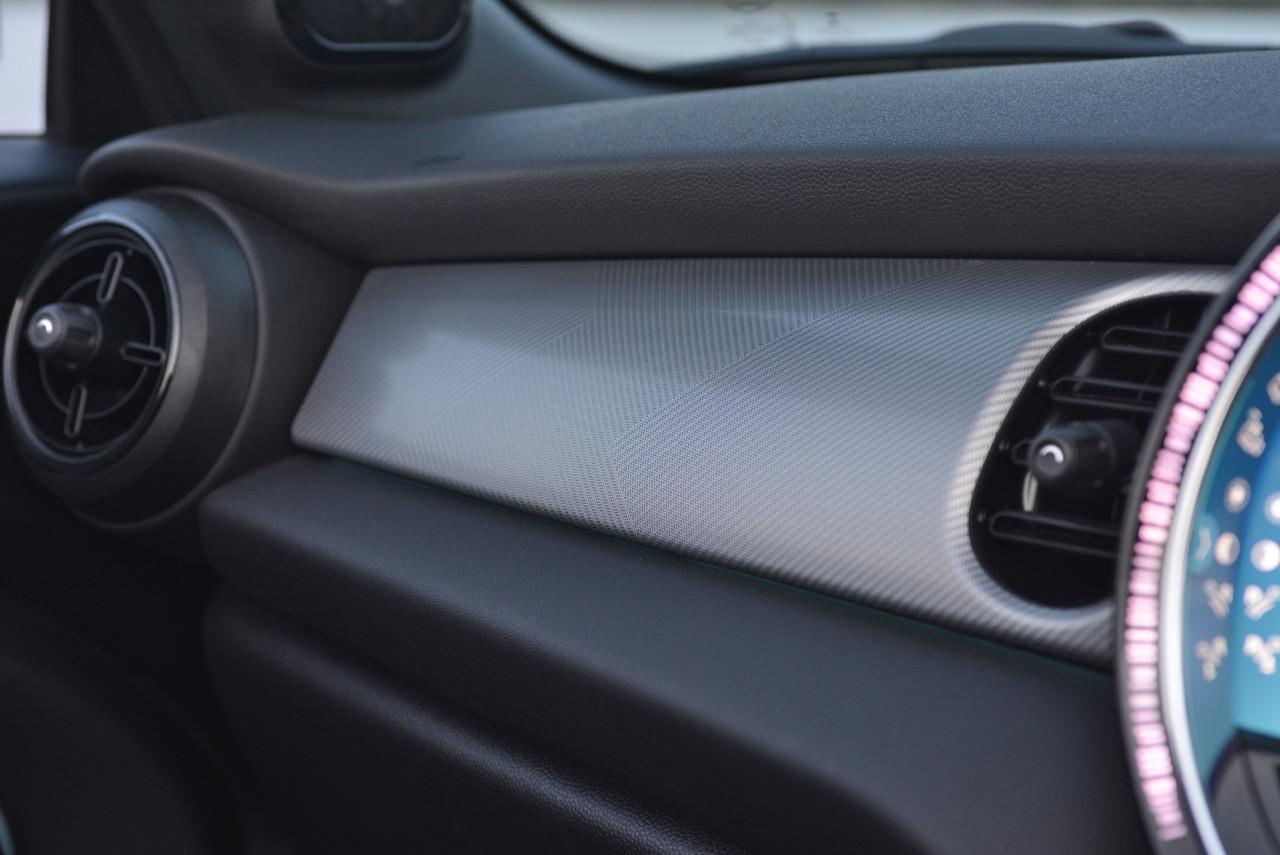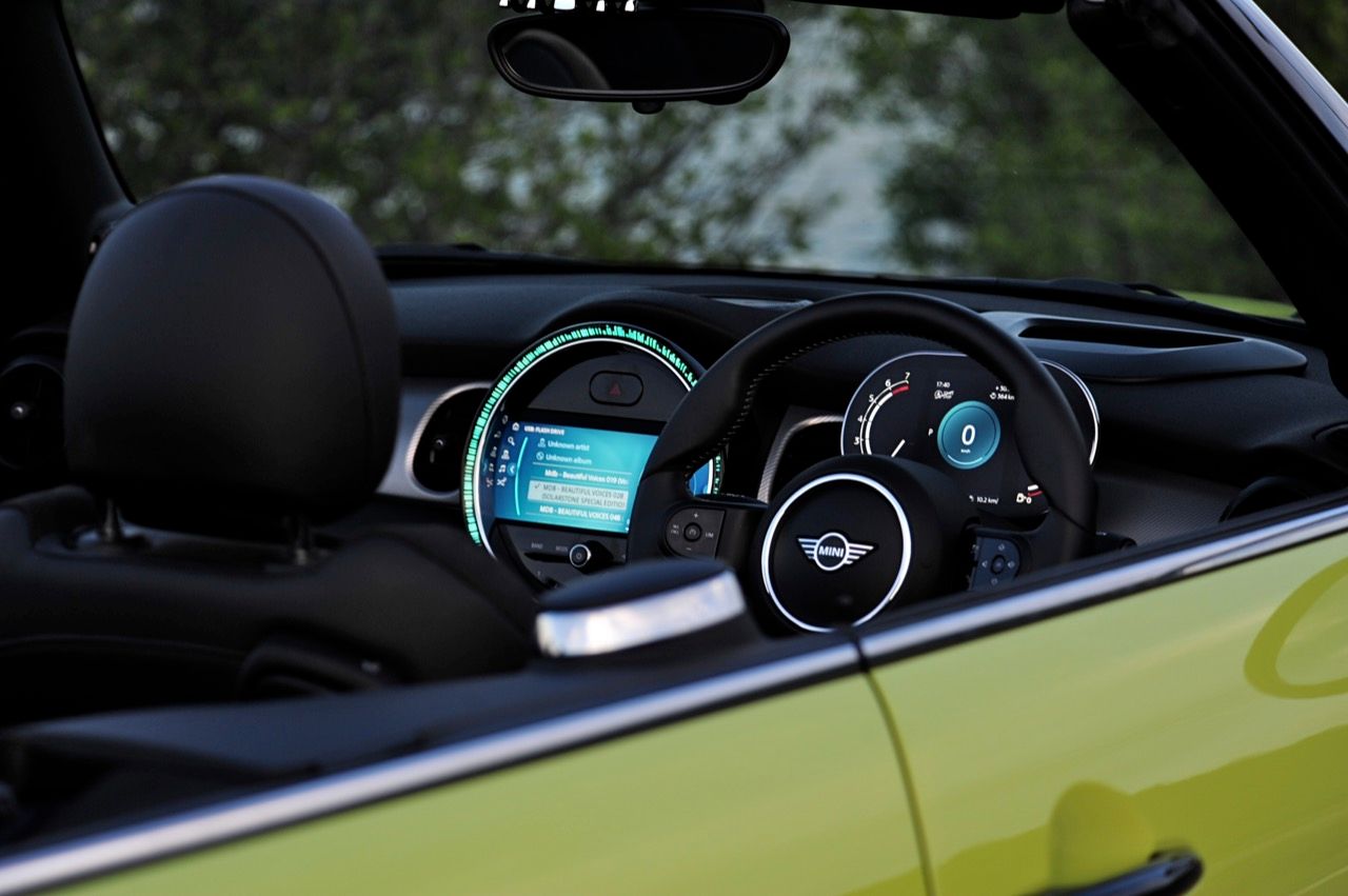 รูปแบบใหม่ งานตกแต่งภายในของ MINI ใน Cooper S รุ่นเปิดประทุน Convertible เน้นความทันสมัย มาพร้อมหน้าจอแสดงผลใหม่ ฟังก์ชันการใช้งานในระบบอินโฟเทนเมนท์ใหม่หมด คอนเซปต์การสั่งงานแบบใหม่ จุดที่ทำได้ดีก็คือ ความกว้างที่เพิ่มขึ้นมอบพื้นที่ใช้สอยส่วนหน้าที่ทำให้ไม่รุ้สึกอึดอัดแม้ตัวถังจะมีขนาดเล็ก เบาะนั่งทั้งสี่ตำแหน่ง ที่นั่งด้านหน้าปรับตำแหน่งได้ครอบคลุมทุกสรีระของผู้ขับ และเพิ่มพื้นที่เบาะโดยสารด้านหลังมากกว่าเดิมถึง 23 มิลลิเมตร แม้ขนาดตัวถังจะเล็กแต่ภายในที่ถูกขยับขยายพื้นที่ใช้สอยช่วยสร้างความรู้สึกโปร่งโล่งให้ผู้โดยสารตอนหน้า ส่วนเบาะหลัง แม้จะปรับพื้นที่ใหม่แต่ยังเล็กเกินไปสำหรับการนั่งโดยสาร เบาะหลังพับแยกได้แบบ 60:40 สำหรับช่องเก็บสัมภาระที่กระโปรงหลังเพิ่มความจุ 51 ลิตร รวมเป็น 211 ลิตร เพิ่มพื้นที่เพื่อรองรับการบรรทุกสัมภาระ หัวใจสำคัญของการออกแบบใหม่ล่าสุดก็คือ หน้าจอแสดงผล ที่จัดฟังก์ชันการใช้งานใหม่หมด รวมถึงกราฟิกแสดงผลก็ปรับใหม่ทั้งหมด บนแผงหน้าปัดบริเวณแกนพวงมาลัย ด้วยหน้าปัด TFT ขนาด 5.5 นิ้ว ที่ถูกใช้เป็นครั้งแรกใน Cooper SE เป็นจอภาพมาตรวัดแสดงผลความเร็วอัตราเร่ง รอบเครื่องยนต์ มาตรวัดปริมาณน้ำมันเชื้อเพลิง ตัวเลขความเร็วแบบดิจิตอลที่อ่านค่าได้ง่ายจากความคมชัด
