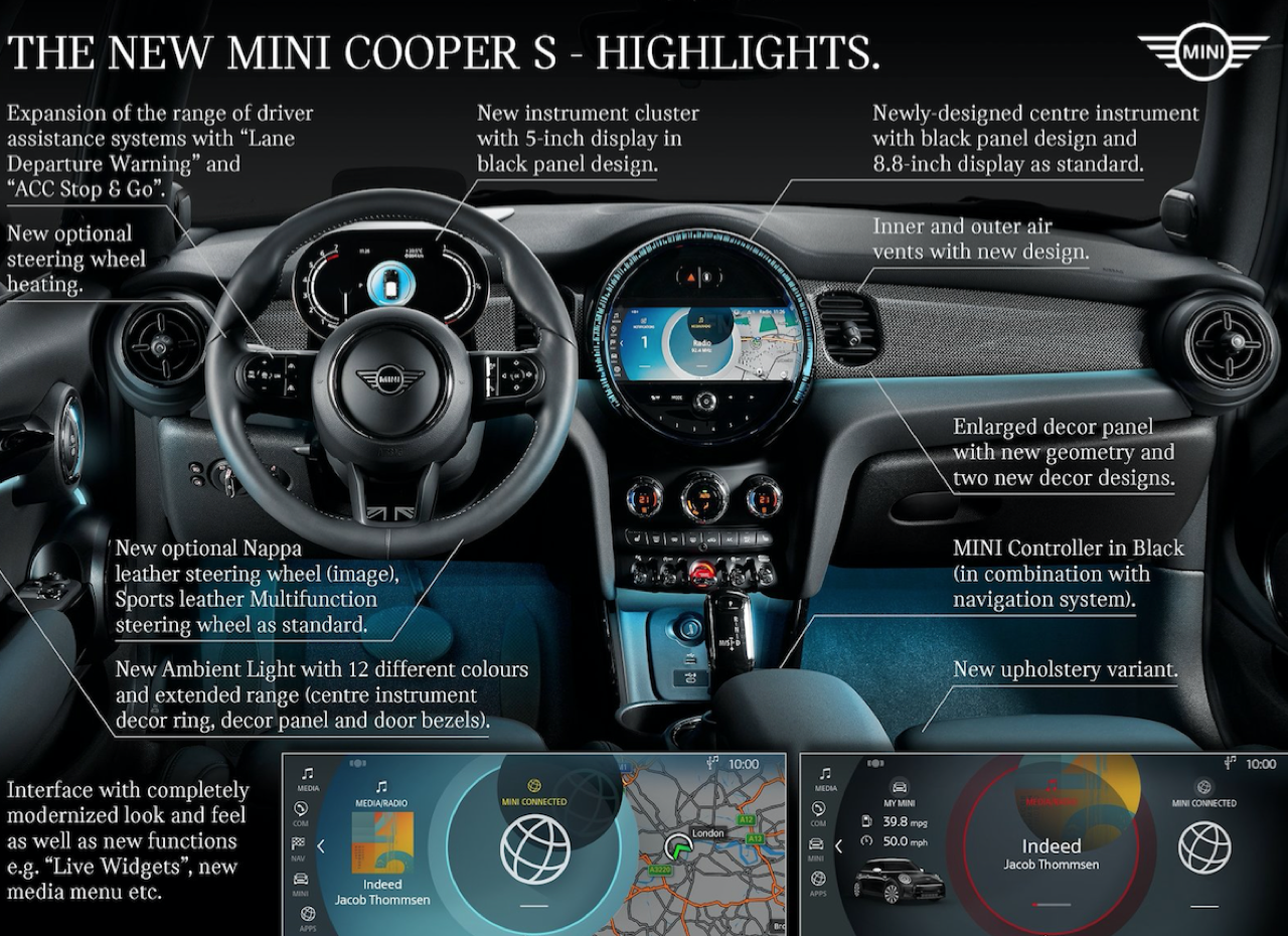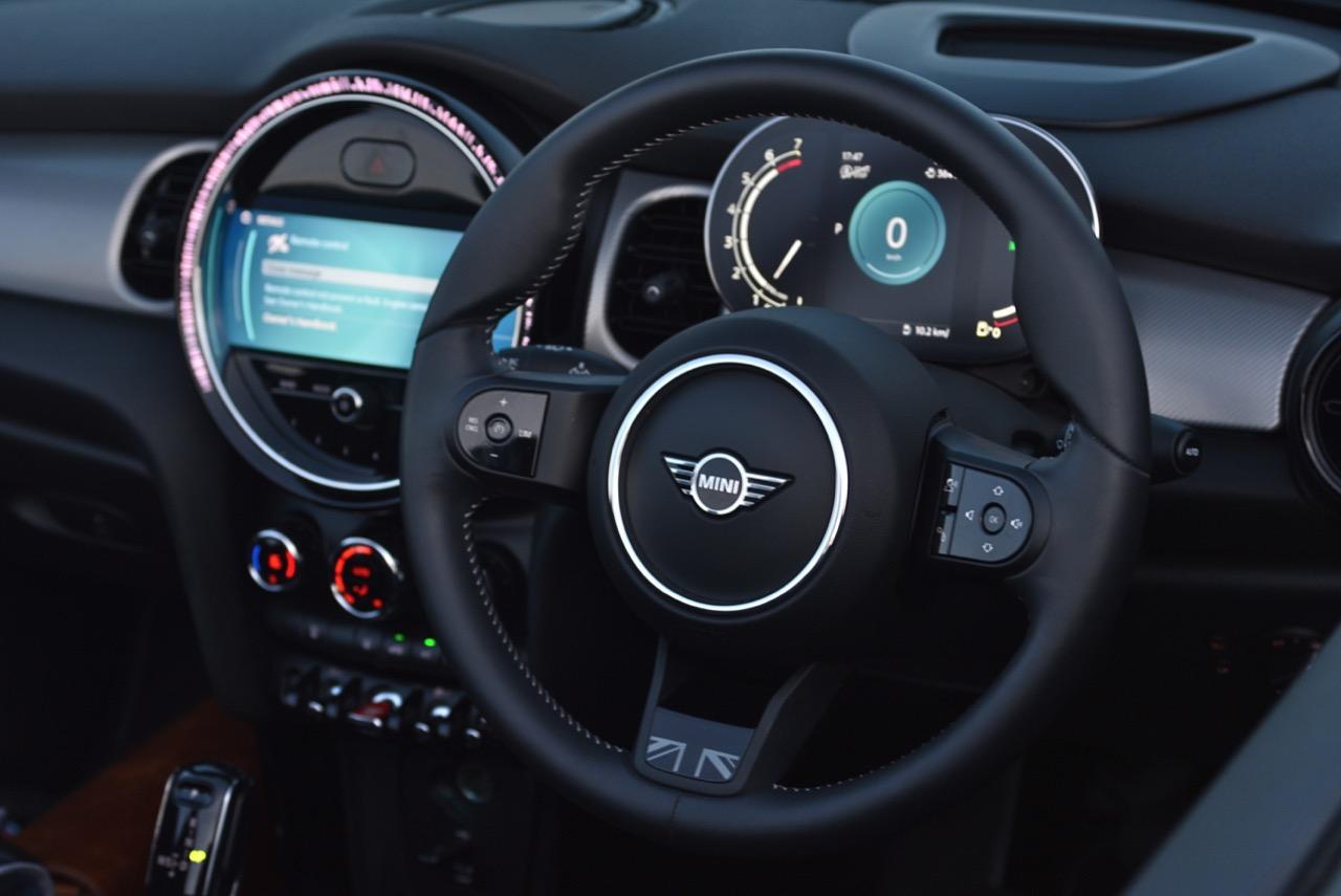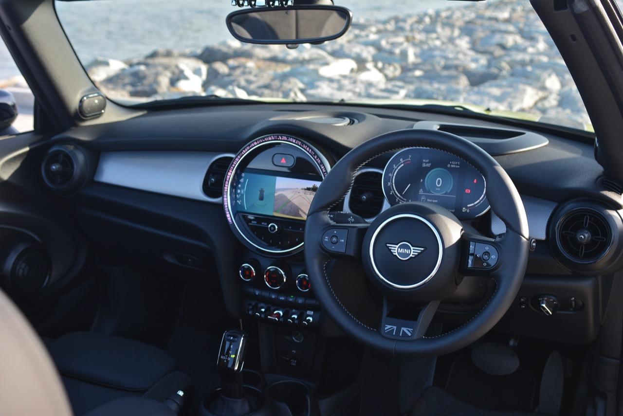 MINI Cooper S Convertibles ใหม่ ติดตั้งฟีเจอร์และรูปแบบฟังก์ชันการใช้งานใหม่ โดยเน้นไปที่ระบบ Infotainment และ Digitalization เมื่อเข้าไปใน Cockpit ของ Convertible ผู้ขับและผู้โดยสารจะสังเกตเห็นหน้าจอ 8.8 นิ้ว ที่ฝังอยู่ด้านในของชุดแดชบอร์ดแบบใหม่ การออกแบบแผงหน้าปัดส่วนกลางที่หันมาใช้จอแสดงผลมาตรวัด TFT 5 นิ้ว ปัจจุบันกลายเป็นจอภาพมาตรวัดแบบมาตรฐานในทุกรุ่น ผสมผสานกับรูปแบบ ที่ให้ความรู้สึกทันสมัย จอกลางที่กำหนดค่าได้อย่างหลากหลาย โทนสีที่มีให้เลือก 2 แบบ (Lounge & Sport) สำหรับ Sirius Satellite Radio เป็นอุปกรณ์มาตรฐานสำหรับ MINI ทุกรุ่นในรุ่นปี 2022 ให้บรรยากาศภายในใหม่และมีรูปแบบที่ร่วมสมัย ด้วย MINI Ambient Light ใหม่ที่มี 6 สีแตกต่างกัน ซึ่งเข้าคู่กันอย่างลงตัวกับโหมดขับเคลื่อน 3 รูปแบบ พวงมาลัยออกแบบใหม่ยังมาพร้อมกับปุ่มมัลติฟังก์ชัน ปุ่มต่างๆ ที่ติดตั้งออกแบบให้มีพื้นผิวเรียบ ใช้สีดำเปียโนแบล็ค รวมถึงการออกแบบใหม่สำหรับก้านวงในพวงมาลัยแบบสปอร์ตที่หุ้มด้วยหนังเป็นอุปกรณ์มาตรฐาน MINI Hatch 3 Door Cooper S และ Convertibles ติดตั้งระบบความปลอดภัยใหม่ ด้วยระบบ Driving Assistant เป็นอุปกรณ์มาตรฐานสำหรับ MINI ทั้งหมดในประเทศไทย การควบรวม Lane Departure Warning ซึ่งสามารถแจ้งเตือนคนขับผ่านการสั่นสะเทือนของพวงมาลัย ผู้ขับยังได้ระบบควบคุมความเร็วอัตโนมัติแบบแอ็คทีฟ ซึ่งขณะนี้สามารถทำงานได้แบบ Stop&Go (เฉพาะกับรุ่นเกียร์อัตโนมัติและเกียร์คลัตช์คู่)