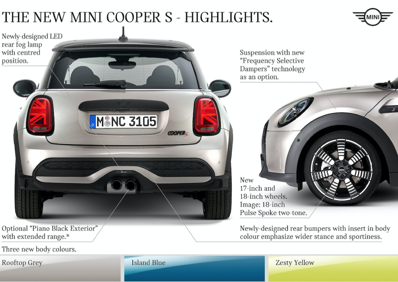 กันชนหลังใหม่ มีการปรับเปลี่ยนรูปลักษณ์ของกันชนและรายละเอียดของงานตกแต่ง ส่งผลทำให้ MINI LCI มีรูปทรงที่กว้างขึ้น เพื่อเน้นจุดยืนและความสปอร์ตของรถรุ่นเปิดประทุน กันชนด้านหลังใช้กราฟิกหกเหลี่ยมจากส่วนหน้า ขณะที่ระบบไอเสียท่อไอเสียคู่ที่เป็นเอกลักษณ์ ได้รับการใส่กรอบเพื่อเอฟเฟกต์ที่แสดงให้เห็นถึงความซับซ้อนของงานดีไซน์ MINI Cooper S Hardtops และ Convertibles ออกแบบด้านข้างและซุ้มล้อใหม่หมด ล้อใหม่ขนาด 18” Pulse Spoke 2-tone นอกจากสีภายนอกใหม่สามสี ได้แก่ Island Blue, Rooftop Grey และ Zesty Yellow แล้ว MINI เปิดประทุนรุ่นใหม่ยังมาพร้อมหลังคาผ้าความหนาสองชั้นที่มีความทนทาน การไล่สีแบบ Soul Blue, Pearly Aqua และ Jet Black ร่วมกับฝาครอบกระจกสีดำ เป็นคุณลักษณะเฉพาะในอุตสาหกรรมยานยนต์ภายใต้ร่มเงาของ BMW Group เทคโนโลยีการพ่นสีที่เป็นนวัตกรรมใหม่ในโรงงาน Plant Oxford