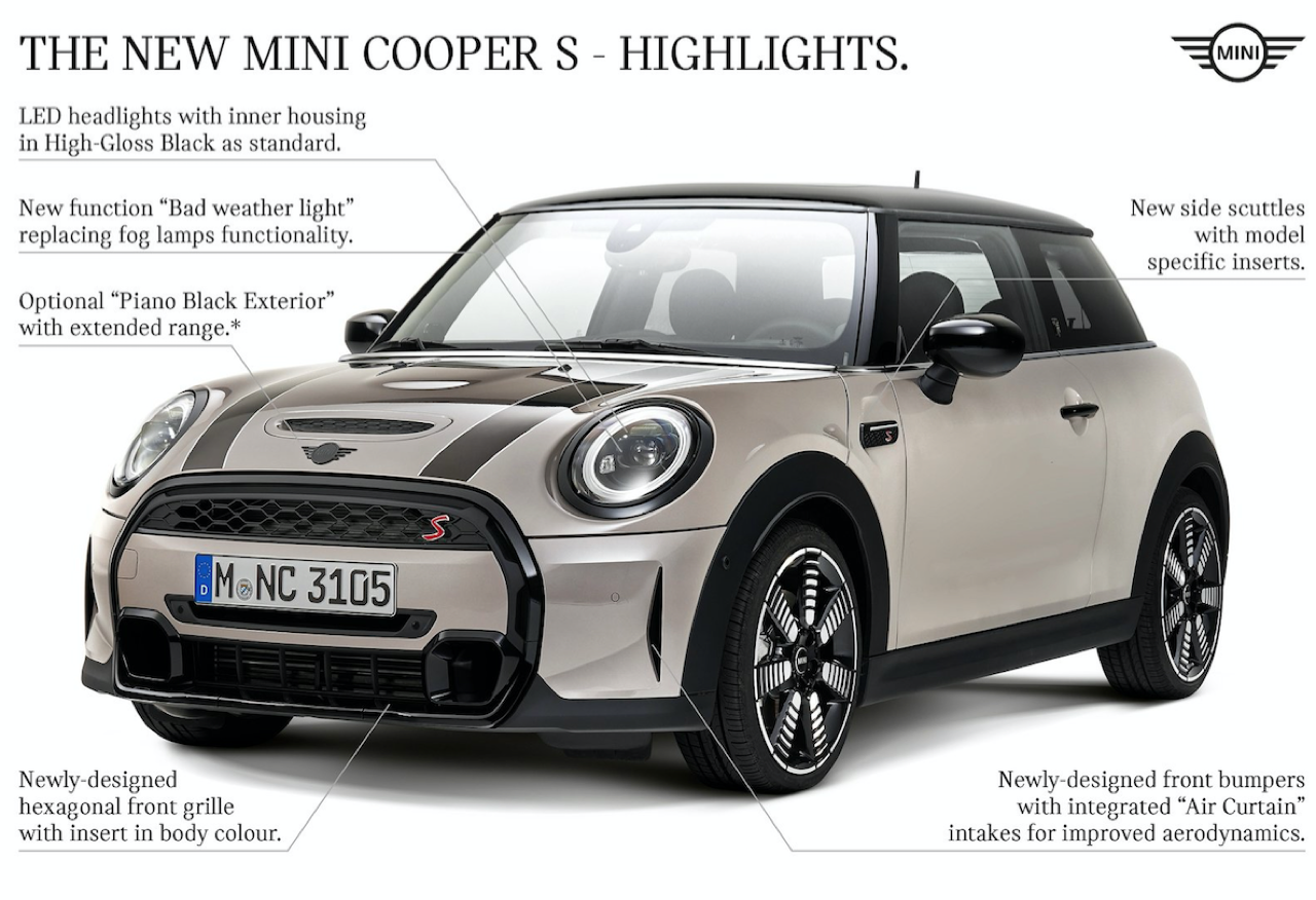 ไฟหน้า Adaptive LED ประสิทธิภาพสูง ให้กำลังในการส่องสว่างไกลกว่าเดิม สำหรับรถรุ่นใหม่มีการออกแบบไฟหรี่และไฟเลี้ยวที่ทันสมัย รวมถึงไฟสัญญาณ LED และส่วนแทรกเฉพาะรุ่น ไฟหน้า LED แบบมาตรฐาน ประกอบเข้ากับไฟท้ายแบบ LED Union Jack อันเป็นเอกลักษณ์ ซึ่งจะรวมอยู่ใน MINI Hardtop และ Convertible รุ่นใหม่ทุกคัน สำหรับคนที่แสวงหาความเฉพาะตัวและสไตล์ ภายนอกตกแต่งด้วยพลาสติกสีดำเงา Piano Black ที่มือจับประตู ฝาถังน้ำมัน ช่องรับอากาศกันนหน้า กรอบกระจกมองข้าง กรอบไฟท้าย (Cooper S/JCW) ปลายท่อไอเสีย (Cooper/Cooper S) โลโก้ MINI และป้ายรุ่น (Cooper/Cooper S /Cooper SE) สีดำ ไฟหน้าแบบใหม่พร้อมระบบส่องสว่างอัตโนมัติ Adaptive LED ไฟหน้ากลมโตมาพร้อมไฟหรี่กลางวัน Daytime Running Light และไฟเลี้ยว LED กระจังหน้าและกันชนหน้าแบบใหม่ในโฉม LCI ถูกเรียกว่าลุงหนวด จากทรงของกระจังและกันชนที่คล้ายหนวด ระบบไฟแบบ Adaptive LED ใน MINI Cooper S Convertible LCI ปรับตามทิศทางการหมุนของพวงมาลัย ผนวกระบบไฟส่องสว่างขณะเลี้ยวโค้ง (Cornering light) และระบบปรับการทำงานไฟสูงอัตโนมัติ (Matrix high beam) โดยขณะเข้าโค้ง จะเปิดไฟส่องตามทิศทางของรถอัตโนมัติ พร้อมควบคุมการทำงานของไฟสูงอัตโนมัติตามสภาวะการจราจรขณะขับขี่ที่ความเร็วมากกว่า 70 กิโลเมตรต่อชั่วโมงขึ้นไป ระบบไฟหน้า LED จึงแบ่งออกเป็นสี่ส่วน ซึ่งแต่ละส่วนทำงานอย่างอิสระ นอกจากนี้ ระบบปรับการทำงานไฟสูงอัตโนมัติ (Matrix high beam) ยังช่วยลดการรบกวนสายตาแก่รถยนต์คันอื่น กล้องหน้าของรถจะตรวจจับรถที่ขับสวนมา หรือรถยนต์ด้านหน้า ระบบจะปรับไฟสูงเป็นไฟต่ำโดยอัตโนมัติ กันชนหน้าเวอร์ชั่น LCI ติดตั้งไฟตัดหมอกกลมๆ เข้ากันกับไฟหน้า ฝากระโปรงออกแบบสคูปรับอากาศเข้าไประบายความร้อนในห้องเครื่อง แก้มข้างติดตั้แถบสัญลักษณ์ S พร้อมหลอดไฟเลี้ยว LED อยู่ภายใน สีเหลืองคาดสติกเกอร์สีดำ มือจับประตูสีดำ รวมถึงชิ้นงานตกแต่งภายนอกสีดำที่ตัดกับสีเหลืองได้อย่างลงตัวไฟท้ายลายธงยูเนียนแจ็คเป็นมาตรฐานสำหรับทุกรุ่น ไฟท้ายลายธงยูเนียนแจ็คของรถมินิอันเป็นเอกลักษณ์ และเป็นอุปกรณ์มาตรฐานสำหรับ MINI Hatch 3 ประตู และ MINI Convertible ลวดลายที่ได้รับแรงบันดาลใจจากธงชาติอังกฤษ โทนสีเข้มขึ้น พร้อมระบบไฟ LED ทั้งหมด ยกเว้นไฟถอยจอด
