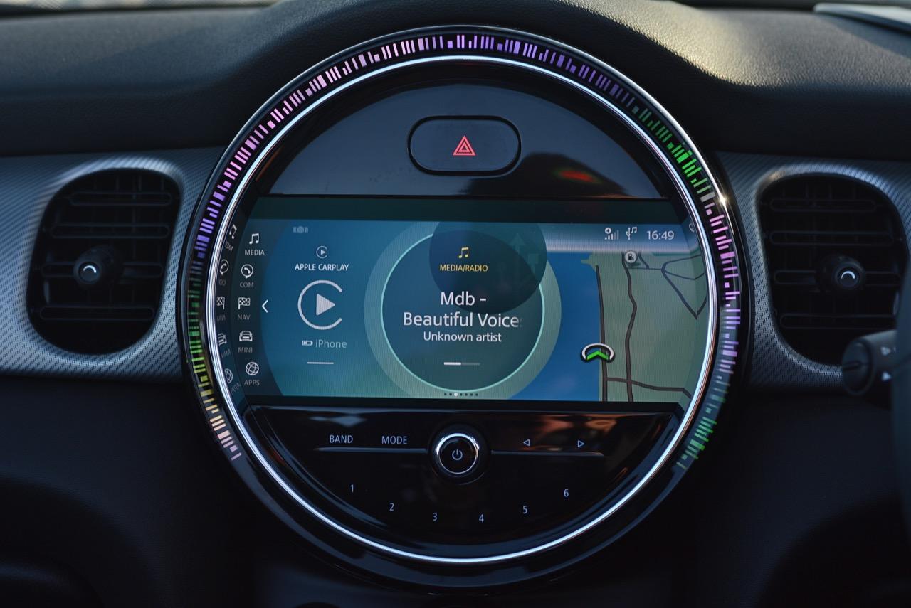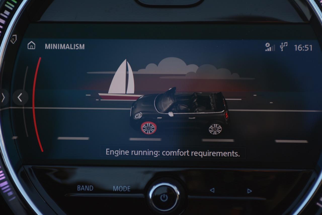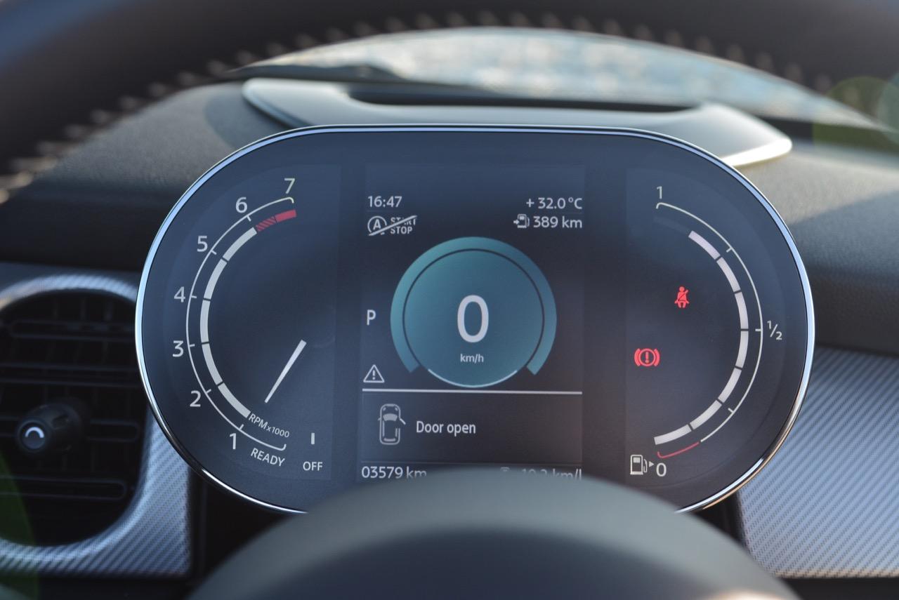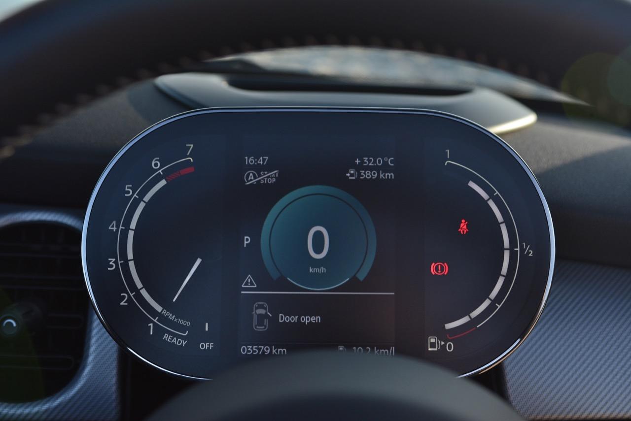 มาตรวัดความเร็วและวัดรอบแบบใหม่ อ่านค่าได้ง่าย การปรับปรุงในตำแหน่งของช่องบอกปริมาณเชื้อเพลิงมีความชัดเจนมากกว่าเดิม จอแสดงผลกลาง สั่งงานด้วยการควบคุมผ่านแป้น controller หรือใช้นิ้วแตะที่หน้าจอเพื่อสั่งงานในระบบสัมผัส หน้าจอล้อมกรอบด้วยหลอด LED ในรูปแบบที่ถูกเติมเต็มด้วยสีสันเร้าใจ จอแสดงผลกลางพร้อมด้วยกราฟิกแบบใหม่ ใช้แสงจากหลอด LED ทำหน้าที่บอกสถานะการทำงานของเครื่องยนต์และการปรับตั้งต่างๆ ด้วยสัญลักษณ์แสงสีต่างๆ จอภาพตรงกลางยังเป็นมอนิเตอร์ของกล้องมองหลัง พร้อมเซนเซอร์ที่ใช้ในการกะระยะถอยหลัง คอยส่งสัญญาณเสียงแจ้งเตือนคนขับเมื่อถอยเข้าใกล้กับวัตถุกีดขวาง สำหรับหน้าจอแสดงผลส่วนกลางที่เป็นเอกลักษณ์ของ MINI ยังได้รับการออกแบบให้เจ้าของรถสามารถเลือกการแสดงผลในฟังก์ชั่นต่างๆ ได้อย่างหลากหลาย เป็นของเล่นที่ออกแบบให้ใช้งานได้ง่ายๆ โดย MINI Cooper S Convertible มาพร้อมหน้าจอสีสั่งงานด้วยระบบสัมผัสขนาด 8.8 นิ้ว แสดงผลที่เกี่ยวกับฟังก์ชั่นกับสภาวะการปรับตั้งระบบต่างๆ ของรถ สาระความบันเทิง และการเชื่อมต่อ MINI Connected สำหรับฟังก์ชั่นดังกล่าวมีระบบควบคุม MINI Touch Controller ที่ทำงานโดยใช้ระบบสัมผัสปลายนิ้วลงไปบนแป้นควบคุม เพื่อให้ผู้ขับขี่สามารถป้อนข้อมูลได้จากการเขียนด้วยนิ้วมือลงบนปุ่ม Controller ได้โดยตรง ในตำแหน่งของ MINI Touch Controller กราฟิกที่สวยงามของฟังก์ชั่นต่างๆ ช่วยเพิ่มความน่าใช้ขึ้นมาอีกนิด