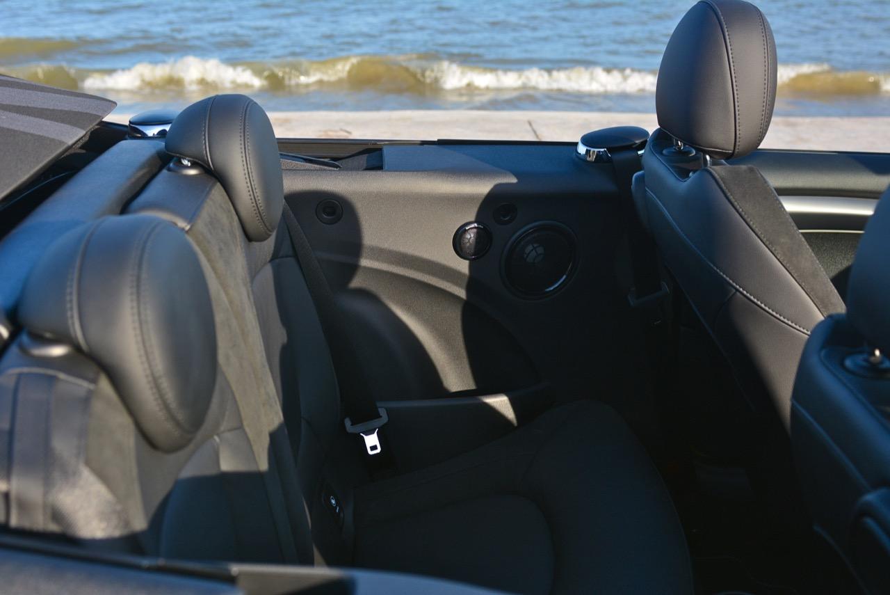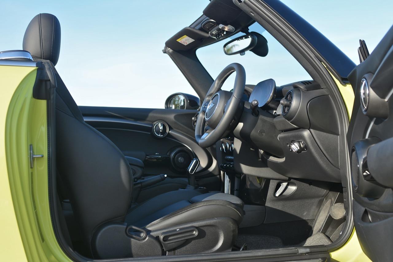 คุณภาพของห้องโดยสารใน MINI Cooper S Convertible LCI มีความลงตัว จากการปรับปรุงเปลี่ยนแปลงและการจัดวางที่ลงตัว สวิตช์เปิดปิดกระจกบานประตูบริเวณแผงประตูทำให้ใช้งานได้สะดวกขึ้น แป้นควบคุมที่ใช้ระบบสัมผัส พร้อมกราฟิกใหม่ ออกแบบโดย BMW Group ทำให้เข้าและออกจากเมนูต่างๆ ได้ง่ายขึ้น อย่างที่บอกว่าเบาะหลังยังคงคับแคบเหมือนเดิม และเหมาะกับเด็กตัวเล็กๆ มากกว่า โดยเฉพาะเบาะหลังของรุ่นเปิดประทุน Cooper S Convertible แต่เบาะคู่หน้ามีพื้นที่บริเวณไหล่เพิ่มขึ้นซึ่งจะทำให้เวลานั่งหรือขับนั้นรู้สึกโปร่งโล่งพอสมควร อุปกรณ์ที่เจ้าของรถจะต้องยึดจับไปตลอดการขับขี่ก็คือพวงมาลัย วงพวงมาลัยแบบใหม่ของ Cooper S Convertible พวงมาลัยไฟฟ้าแบบใหม่มีขนาดที่พอดี ทำงานขึ้นตรงกับโหมดของการขับเคลื่อน 3 รูปแบบ (Green mode / Mid Mode / Sport Mode) ก้านวงของพวงมาลัยติดตั้งสวิตช์มัลติฟังก์ชั่นสั่งงานระบบเครื่องเสียงและระบบโทรศัพท์แบบบลูทูธ ไม่มีแป้นเปลี่ยนตำแหน่งเกียร์ Paddle Shift มาให้ถ้าอยากได้คงต้องขยับไปที่ Cooper JCW พวงมาลัยหุ้มด้วยหนังแท้เย็บเดินตะเข็บด้วยด้ายสีขาว สัญลักษณ์ธงอังกฤษอยู่ที่ก้านวงด้านล่าง