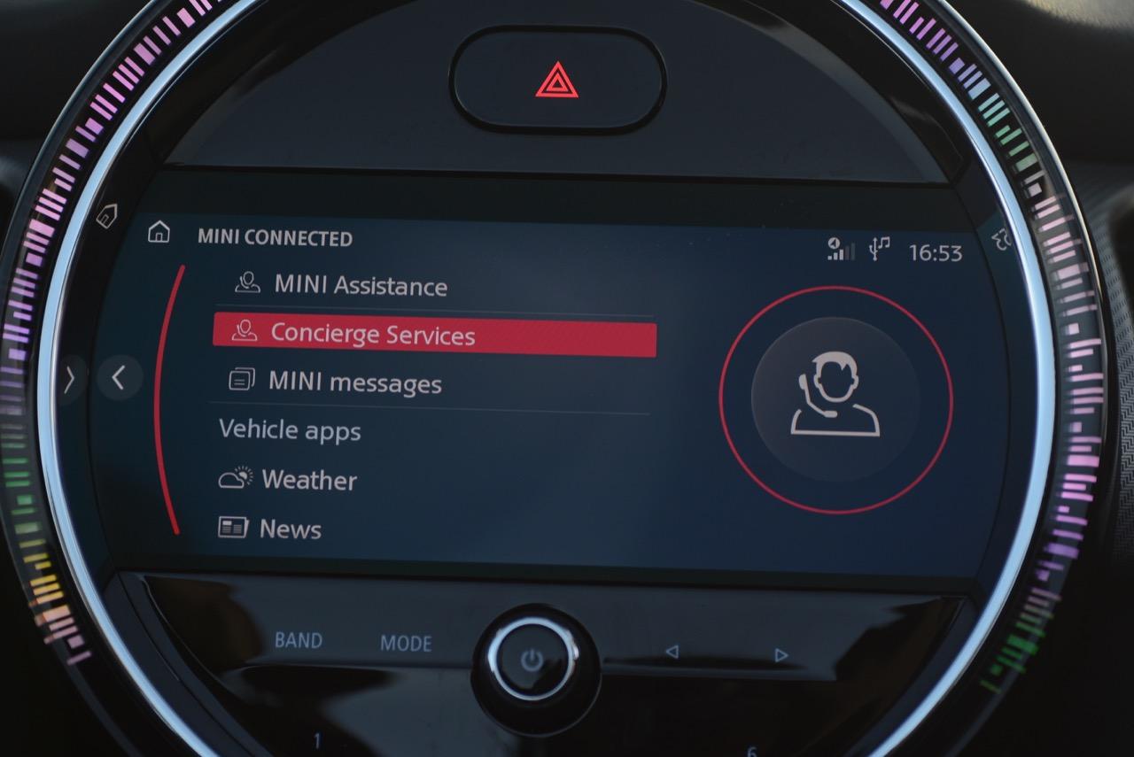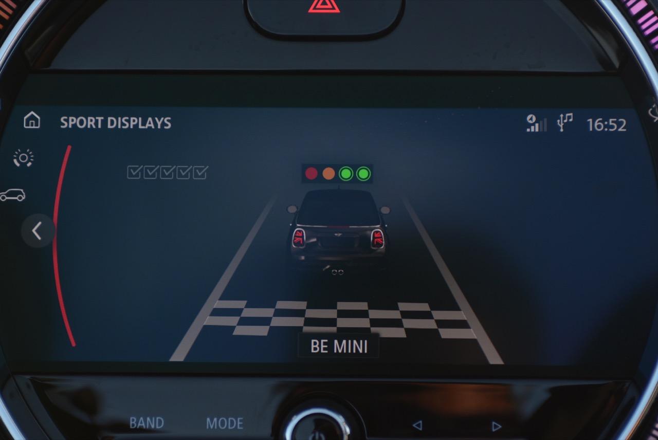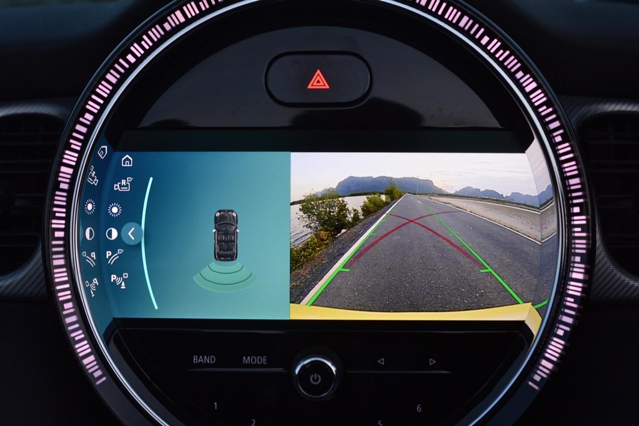เทคโนโลยีหลอด LED แบบใหม่ล่าสุด ที่สามารถเปลี่ยนสีไฟรอบวงแหวนหน้าปัด แสดงผลตามสถานะ ไม่ว่าจะเป็นการขับขี่บนถนน หรือการทำงานของฟังก์ชั่นต่างๆ ตามความพึงพอใจของผู้ขับ เช่น ขณะระบบควบคุมระยะการจอด (PDC) ทำงาน วงแหวนไฟเรืองแสงแบบ LED ที่เป็นลูกเล่นใหม่ของ New MINI จะแสดงระยะห่างระหว่างรถกับสิ่งกีดขวางด้านหลังรถด้วยกล้องมองหลังพร้อมเส้นระนาบกะระยะ และสัญญาณเสียงเมื่อขับถอยหลังเข้าไปใกล้กับวัตถุกีดขวาง การแสดงผลของเส้น LED ตามสถานะในสีต่างๆ ตามระยะใกล้-ไกลกับสิ่งกีดขวางหลังรถ ได้แก่ สีเขียว เหลือง หรือแดง นอกเหนือจากการแสดงผลกราฟิกบนหน้าจอ รวมถึงการเปลี่ยนโหมดการขับขี่ที่สามารถเห็นได้จากสีต่างๆ ได้แก่ สีเขียว สีส้ม หรือสีแดง หน้าจอแบบใหม่ล่าสุดของ New MINI ยังแสดงไฟสถานะสำหรับแนะนำเส้นทางของระบบแผนที่นำทาง MINI Navigation ใน MINI Cooper S F56 ซึ่งเมื่อรถเข้าใกล้จุดหมายปลายทางมากขึ้น แถบไฟบนวงแหวนก็จะลดน้อยลงตามไปด้วย โดยเทคโนโลยีแผนที่นำทาง MINI Navigation มีการปรับปรุงรายละเอียดของแผนที่แบบดิจิตอลพร้อมเข็มทิศที่เพิ่มเข้ามาให้เพื่อความสะดวกในการใช้งาน