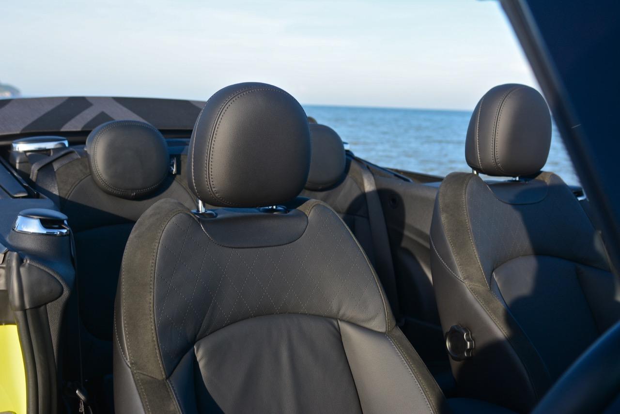 MINI Cooper S Convertible F57 LCI มีเบาะหนังแท้สีดำ เย็บสลับกับหนังแบบไมโครไฟเบอร์ Alcantara ตัวเบาะรองด้วยวัสดุที่ให้ความนุนิ่มนวลน่านั่ง เบาะสามารถปรับให้ท่านั่งขับต่ำเตี้ยติดพื้นแบบสปอร์ต เบาะคนนั่งและคนขับยังคงใช้การปรับเบาะด้วยมือล้วนๆ ผ่านกลไกการปรับเบาะสำหรับการเลื่อนเดินหน้า ถอยหลัง หรือยกขึ้นลงออกมาในแนวดิบๆ ส่วนพวงมาลัยแบบใหม่นั้นปรับได้สี่ทิศทาง ตำแหน่งของการนั่งใน MINI Cooper S เวอร์ชั่นปรับโฉมให้สัมผัสที่พอดิบพอดีสำหรับคนที่มีรูปร่างปกติ เบาะแบบสปอร์ตหุ้มหนังแท้ออกแบบให้โอบรัดแผ่นหลัง ทำให้รู้สึกถึงความกระชับยามนั่ง การออกแบบใหม่ในบางจุดโดยยังคงการจัดวางแบบเดิม ทำให้ห้องโดยสารของ Cooper S Convertible กว้างขึ้นเล็กน้อย ทรงของตัวรถที่สั้นและมีฐานล้อไม่ยาวเกินไป ทำให้ความรู้สึกไม่ว่าจะขับช้าหรือขับเร็ว ล้วนแล้วแต่ตอบสนองออกมาในแนวคล่องตัวว่องไว เหมาะกับการซอกแซกไปบนถนนเส้นเล็กๆ ในเมือง