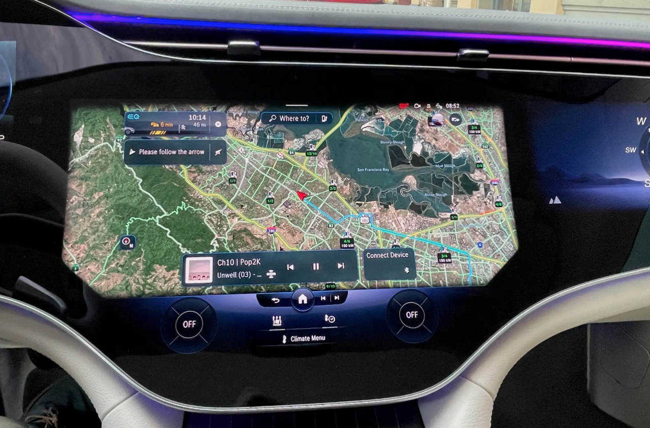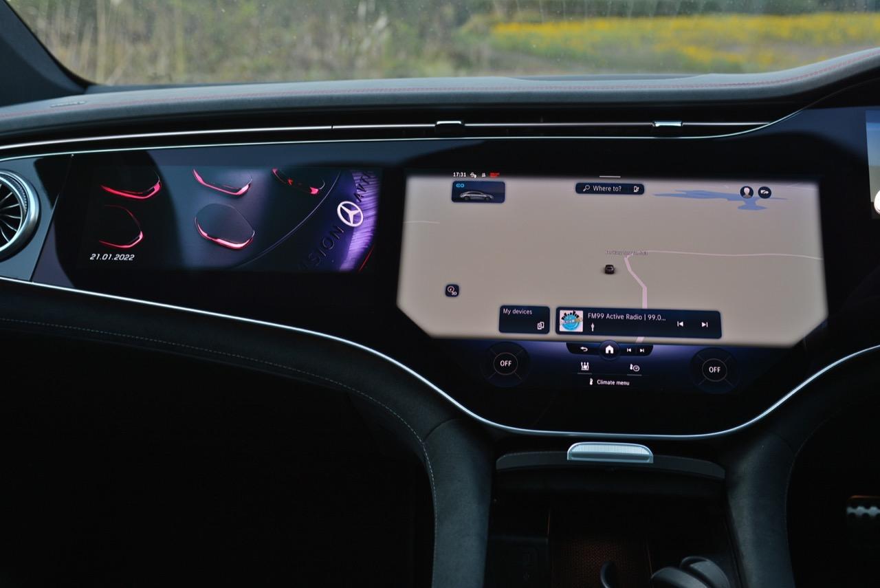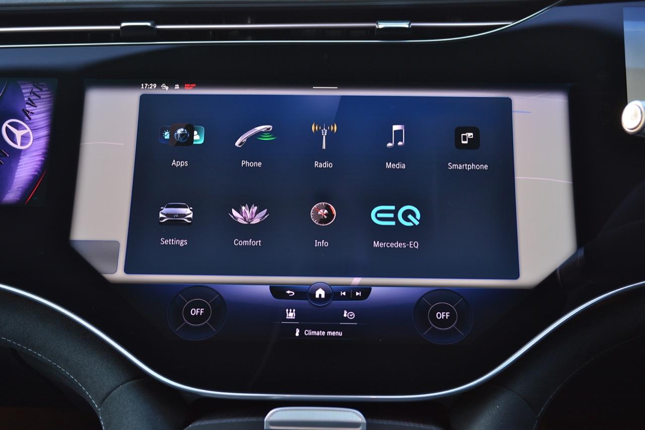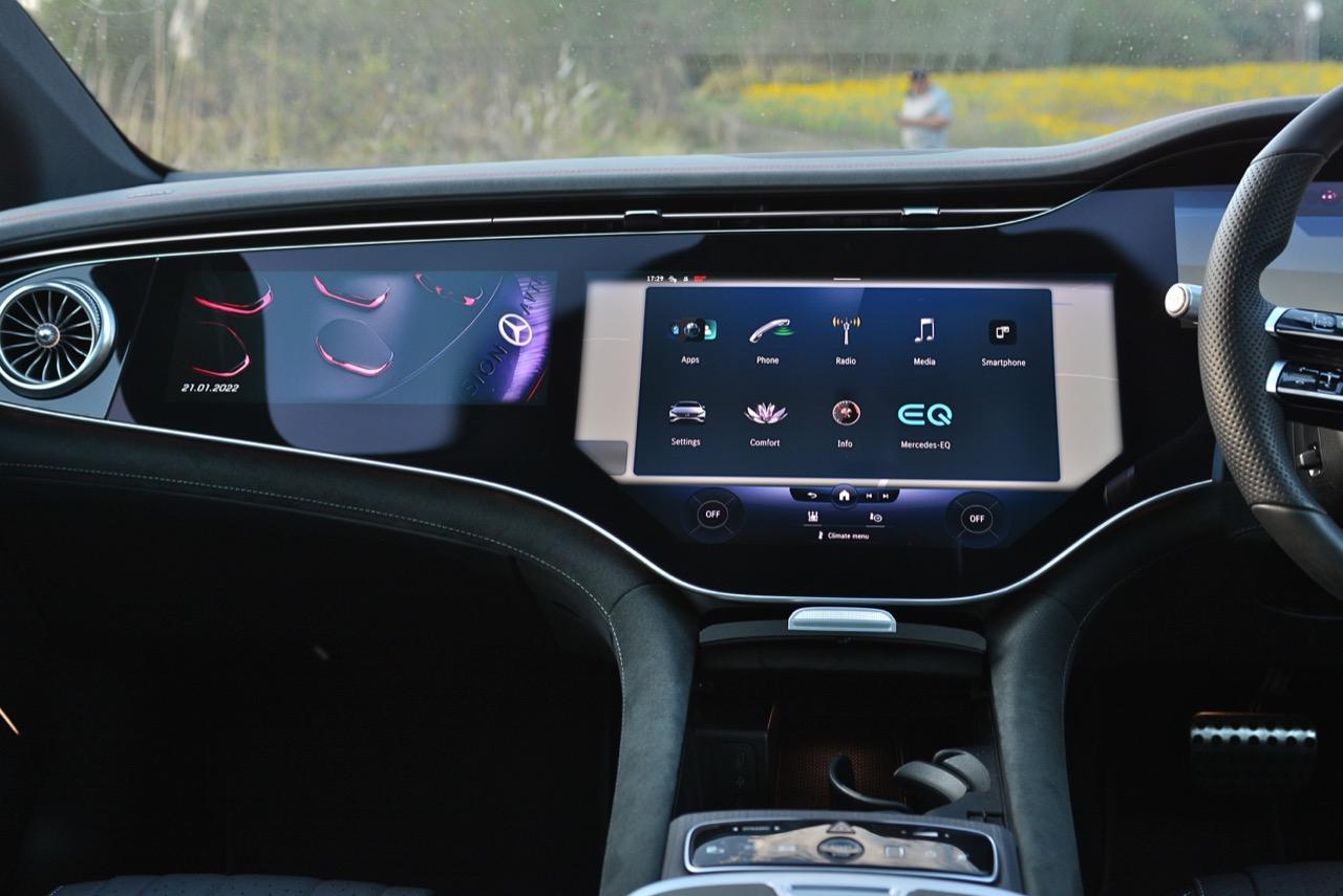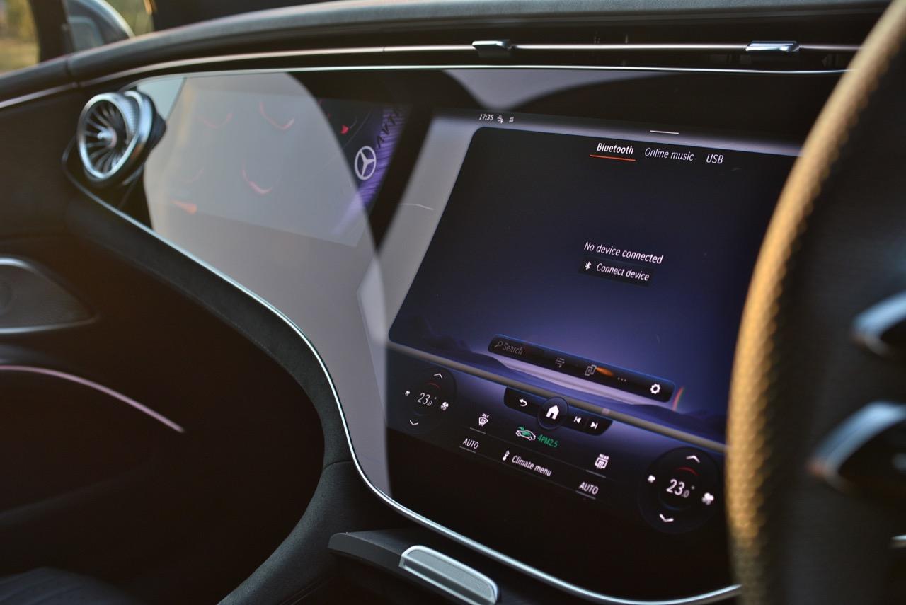 รถทดสอบติดตั้งจอภาพ Hyperscreen แทนที่แผงหน้าปัดทั้งหมดด้วยแผงกระจก Gorilla Glass ขนาด 56 นิ้วขนาดใหญ่ที่มีจอแสดงผลสามแบบแยกกัน: แผงมาตรวัดขนาด 12.3 นิ้ว, หน้าจอสัมผัส OLED ส่วนกลางขนาด 17.7 นิ้ว และหน้าจอสัมผัส OLED ขนาด 12.3 นิ้วที่ด้านหน้าผู้โดยสารตอนหน้า หากแสงตกกระทบกระจกโดยตรง จะเห็นแสงสะท้อนเล็กน้อยและมองเห็นช่องว่างระหว่างหน้าจอได้ แต่การออกแบบให้รอยต่อในจอภาพ Hyperscreen เป็นหนึ่งในคุณสมบัติที่โดดเด่นของ EQS และเป็นสิ่งที่มหัศจรรย์อย่างแท้จริง การออกแบบระบบปฏิบัติการ MBUX ไม่ว่าคุณจะเปิดเมนู แอพ หรือการตั้งค่าใด หน้าจอหลักก็อยู่ห่างออกไปเพียงแค่แตะสั่งงานครั้งเดียว และระบบควบคุมสภาพอากาศภายในห้องโดยสาร จะอยู่ในแถบที่ฐานของหน้าจอเสมอ แผนที่การนำทางขนาดใหญ่ ทำหน้าที่เป็นหน้าจอหลัก โดยมีวิดเจ็ตลอยตัวจำนวนหนึ่งปรากฏขึ้นที่มุมต่างๆ ขึ้นอยู่กับว่าคุณเปิดอะไรไว้ เช่น ดนตรีหรือเครื่องนวดที่นั่ง คุณลักษณะการนำทางที่เติมความเป็นจริงของ Mercedes นั้นยอดเยี่ยมบนจอภาพ Hyperscreen มันสามารถแสดงหน้าด้วยมุมมองของกล้องด้านหน้า ควบคู่ไปกับแผนที่จากบนลงล่างพร้อมการแจ้งเตือนทิศทาง ของแถมอีกอย่างของหน้าจอตรงกลางคือจอแสดงผลที่ใหญ่ที่สุดรองรับ Apple CarPlay และ Android Auto ด้วยการเชื่อมต่อแบบไร้สาย