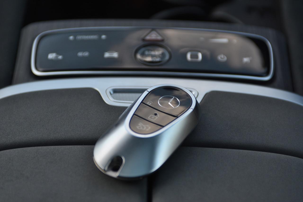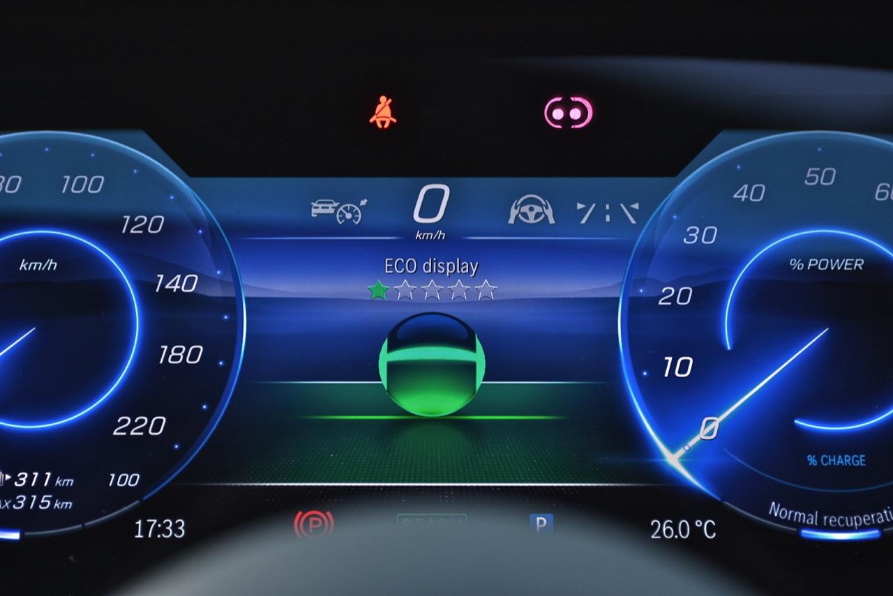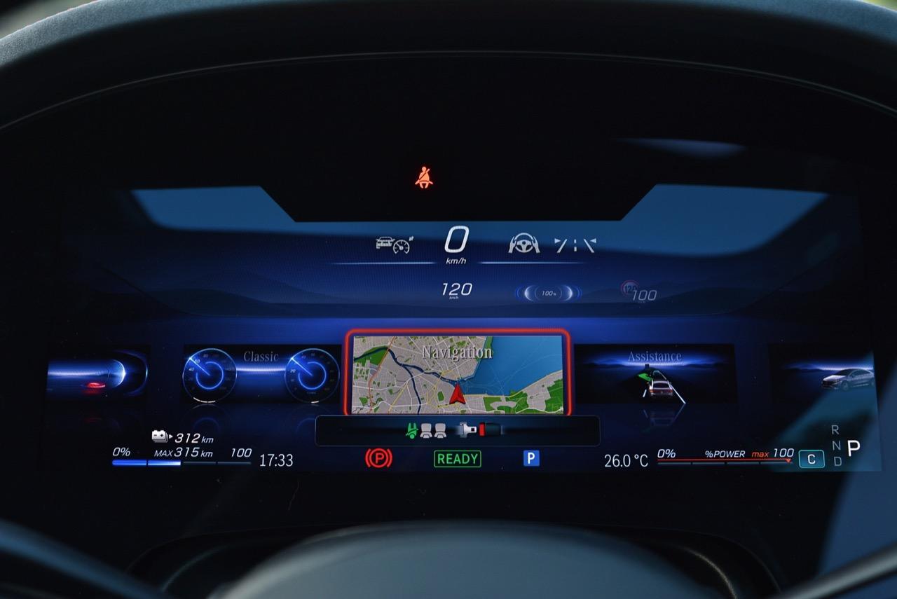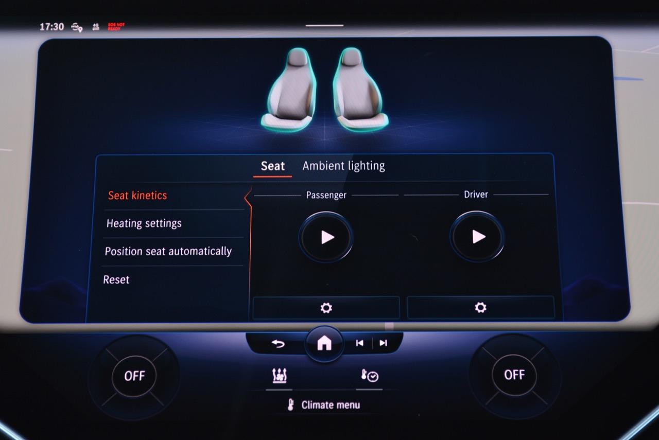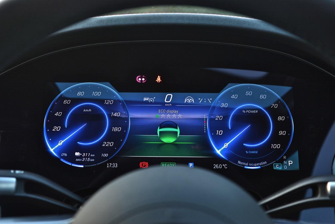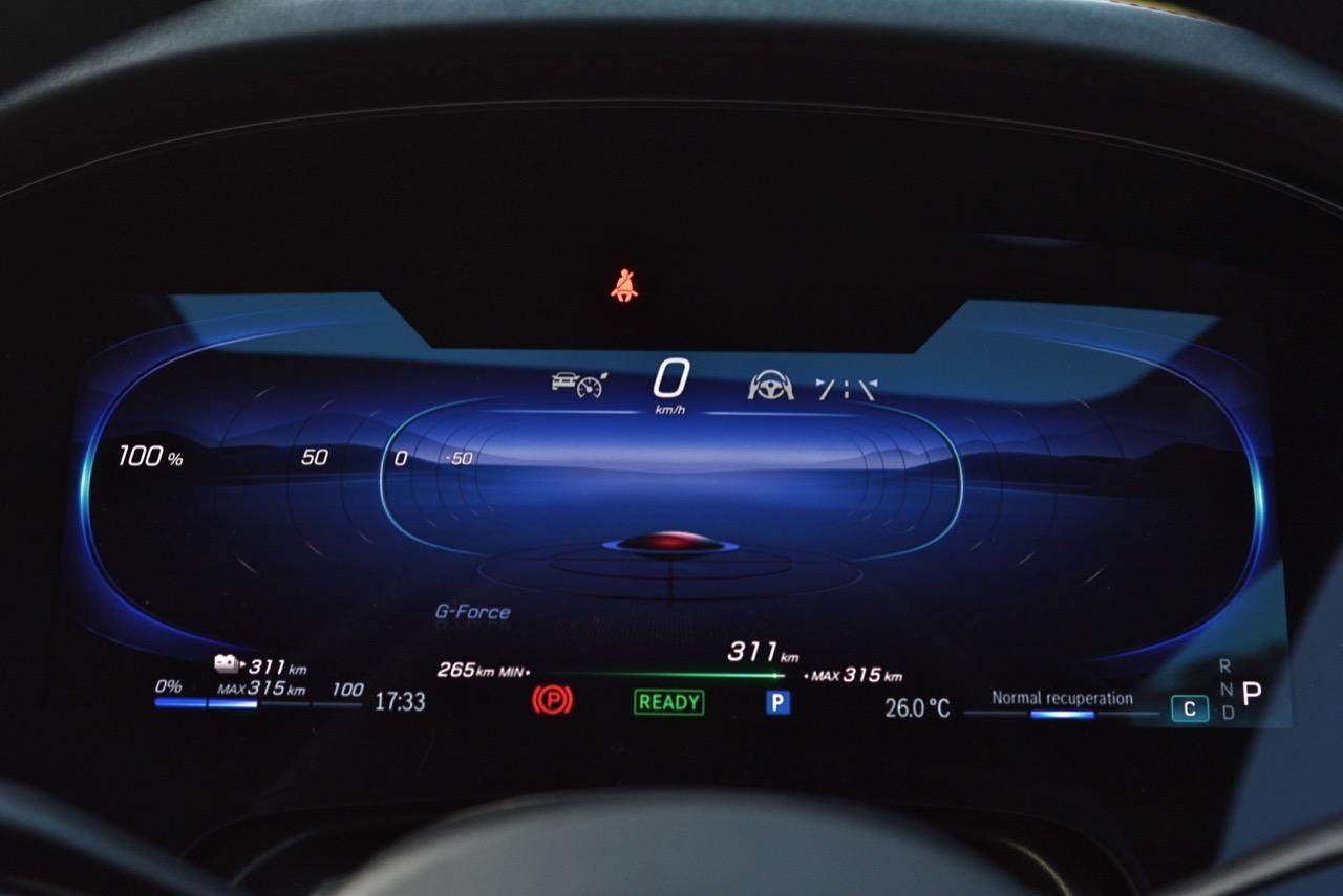 รถทดสอบติดตั้งจอภาพ Hyperscreen แทนที่แผงหน้าปัดทั้งหมดด้วยแผงกระจก Gorilla Glass ขนาด 56 นิ้วขนาดใหญ่ที่มีจอแสดงผลสามแบบแยกกัน: แผงมาตรวัดขนาด 12.3 นิ้ว, หน้าจอสัมผัส OLED ส่วนกลางขนาด 17.7 นิ้ว และหน้าจอสัมผัส OLED ขนาด 12.3 นิ้วที่ด้านหน้าผู้โดยสารตอนหน้า หากแสงตกกระทบกระจกโดยตรง จะเห็นแสงสะท้อนเล็กน้อยและมองเห็นช่องว่างระหว่างหน้าจอได้ แต่การออกแบบให้รอยต่อในจอภาพ Hyperscreen เป็นหนึ่งในคุณสมบัติที่โดดเด่นของ EQS และเป็นสิ่งที่มหัศจรรย์อย่างแท้จริง การออกแบบระบบปฏิบัติการ MBUX ไม่ว่าคุณจะเปิดเมนู แอพ หรือการตั้งค่าใด หน้าจอหลักก็อยู่ห่างออกไปเพียงแค่แตะสั่งงานครั้งเดียว และระบบควบคุมสภาพอากาศภายในห้องโดยสาร จะอยู่ในแถบที่ฐานของหน้าจอเสมอ แผนที่การนำทางขนาดใหญ่ ทำหน้าที่เป็นหน้าจอหลัก โดยมีวิดเจ็ตลอยตัวจำนวนหนึ่งปรากฏขึ้นที่มุมต่างๆ ขึ้นอยู่กับว่าคุณเปิดอะไรไว้ เช่น ดนตรีหรือเครื่องนวดที่นั่ง คุณลักษณะการนำทางที่เติมความเป็นจริงของ Mercedes นั้นยอดเยี่ยมบนจอภาพ Hyperscreen มันสามารถแสดงหน้าด้วยมุมมองของกล้องด้านหน้า ควบคู่ไปกับแผนที่จากบนลงล่างพร้อมการแจ้งเตือนทิศทาง ของแถมอีกอย่างของหน้าจอตรงกลางคือจอแสดงผลที่ใหญ่ที่สุดรองรับ Apple CarPlay และ Android Auto ด้วยการเชื่อมต่อแบบไร้สาย