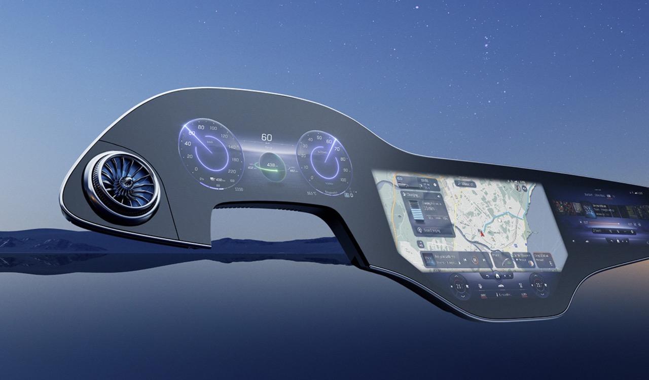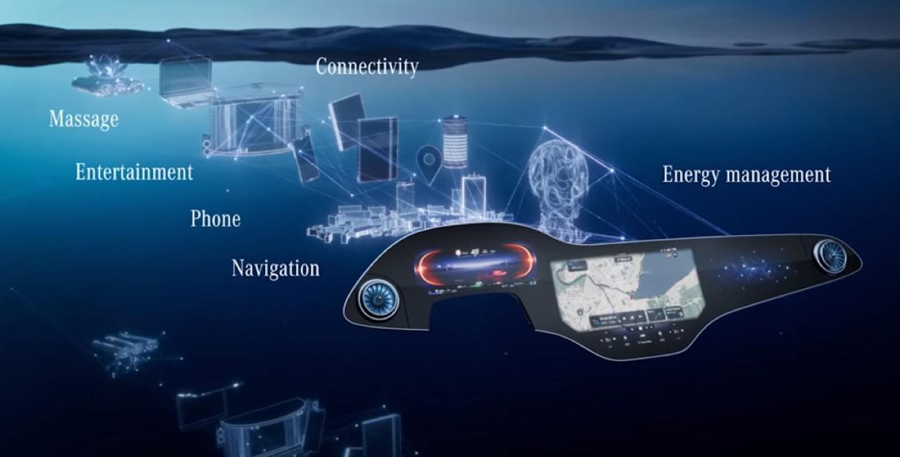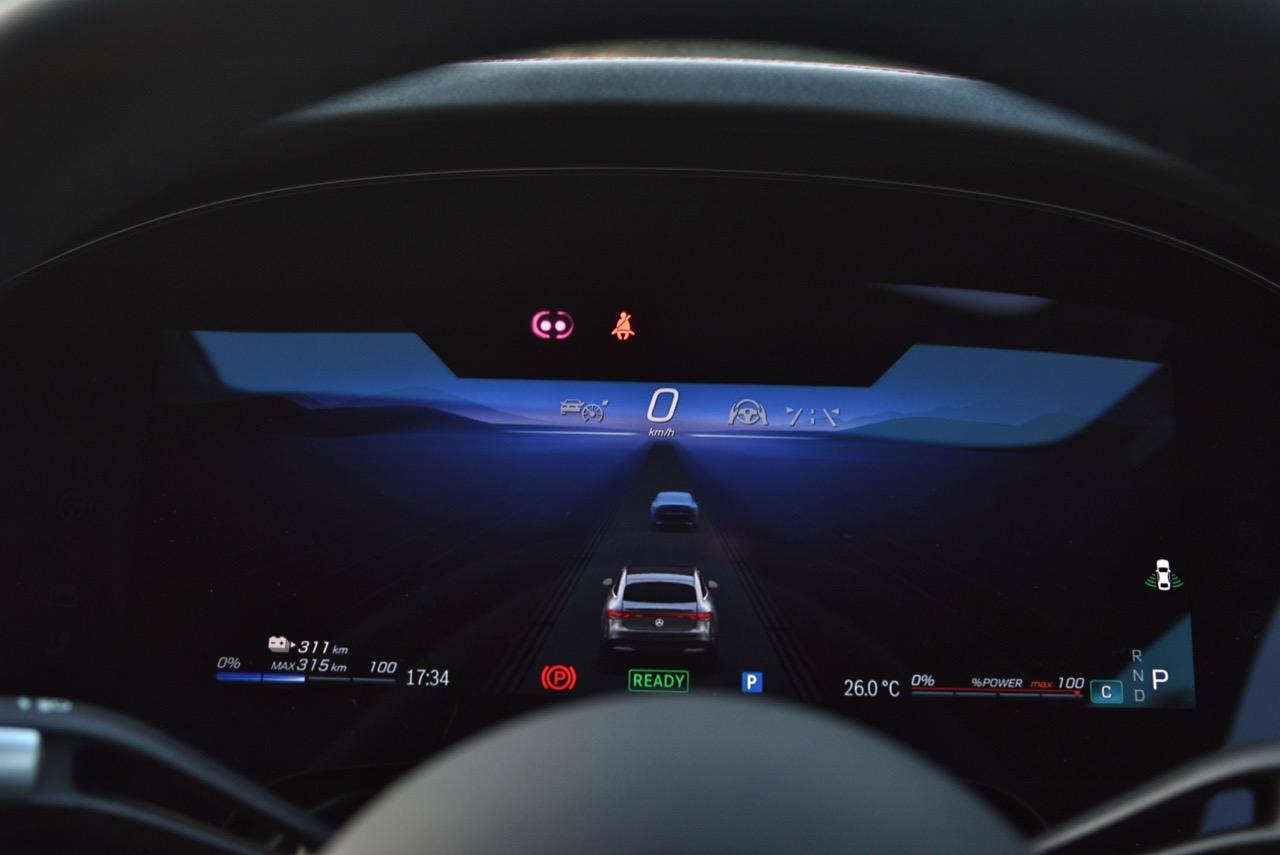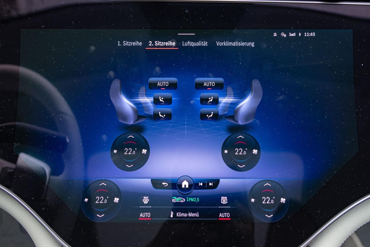 ฟีเจอร์มากมายถูกควบคุมผ่าน Hyperscreen ระบบนำทางออกแบบให้ใช้งานง่ายและรวดเร็ว เมื่อเริ่มมีความคุ้นเคยกับเมนูสั่งงานต่างๆ ต้องใข้เวลาเรียนรู้กันพอสมควร นอกจากนี้ยังมีเมนูโปรดที่กำหนดค่าได้และเก็บฟังก์ชั่นได้ทุกประเภท ระบบสั่งงานด้วยเสียง Hi Mercedes ก็คุ้มค่าที่จะถูกใช้เป็นประจำ มันสามารถจดจำเสียงได้หลายเสียง และรู้ว่าคุณกำลังนั่งอยู่ที่ไหน หากผู้โดยสารด้านหน้าพูดว่า "เปิดระบบการนวด" รถก็จะเปิดระบบนวดตัวสำหรับเบาะที่นั่งในตำแหน่งนั้น หน้าจอผู้โดยสารทำหน้าที่ได้หลายอย่าง ใช้กล้องติดตามการมอง แม้กระทั่งทำให้หน้าจอมืดลงเมื่อคุณจ้องมองมัน ผู้โดยสารสามารถดูข้อมูลการขับ เล่นเพลงของตัวเองผ่านหูฟัง ปรับระบบควบคุมอุณหภูมิ ตั้งค่าเส้นทางของระบบนำทาง และส่งไปยังหน้าจอตรงกลาง หรือแม้แต่เล่นเกมอย่าง Tetris จอแสดงผลสามารถปิดได้ทั้งหมด หรือตั้งค่าเป็นสกรีนเซฟเวอร์ได้หลายแบบ หนึ่งในนั้นมีลวดลายดาวแบบเคลื่อนไหวพร้อมรูปแบบที่ใช้แนวคิด Vision AVTR ด้วยหน้าจอที่ความสว่างสูงสุดและแสงโดยรอบในการตั้งค่าที่แหวกแนวสุดๆ การแสดงผลของ EQS จะดูกระจ่างตาและสว่างไสวแม้ในเวลากลางคืน
