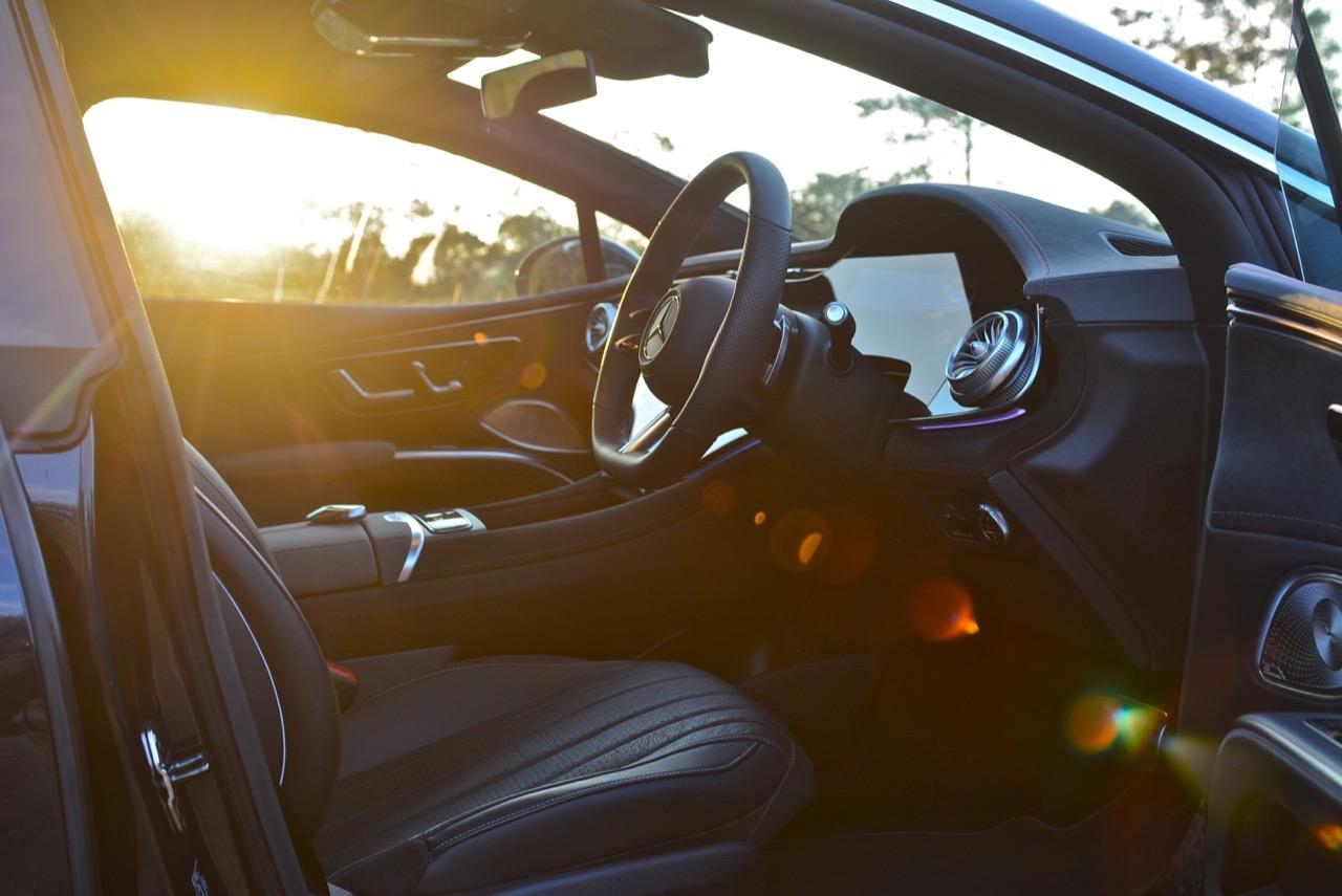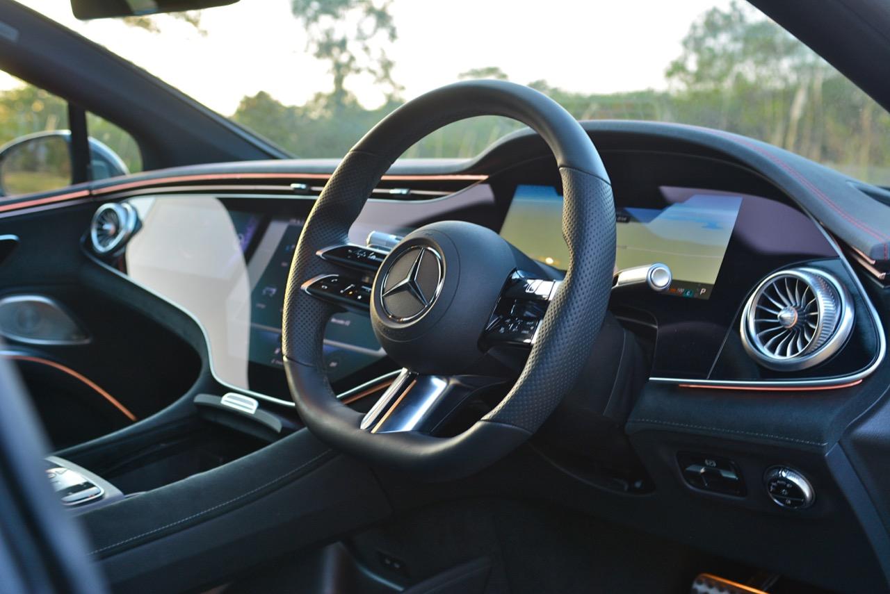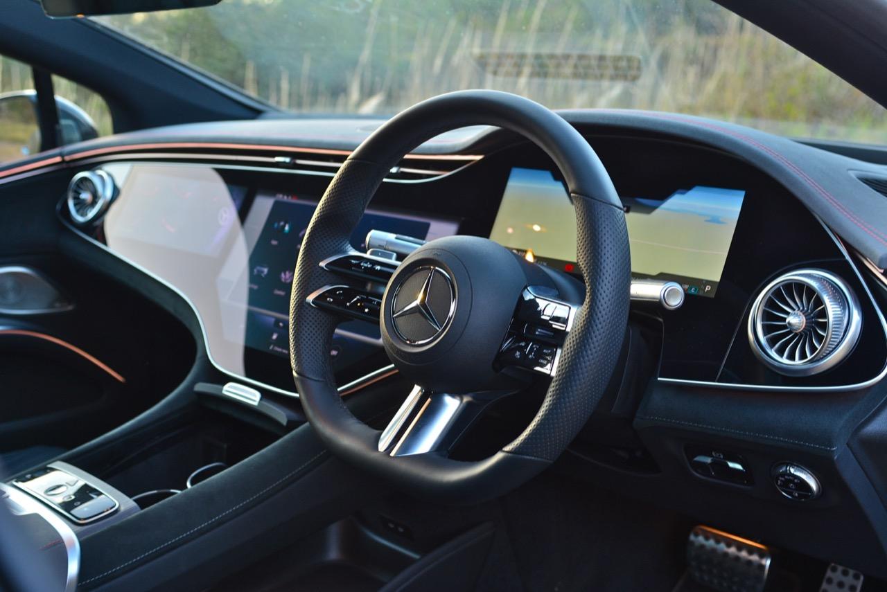 ฟีเจอร์มากมายถูกควบคุมผ่าน Hyperscreen ระบบนำทางออกแบบให้ใช้งานง่ายและรวดเร็ว เมื่อเริ่มมีความคุ้นเคยกับเมนูสั่งงานต่างๆ ต้องใข้เวลาเรียนรู้กันพอสมควร นอกจากนี้ยังมีเมนูโปรดที่กำหนดค่าได้และเก็บฟังก์ชั่นได้ทุกประเภท ระบบสั่งงานด้วยเสียง Hi Mercedes ก็คุ้มค่าที่จะถูกใช้เป็นประจำ มันสามารถจดจำเสียงได้หลายเสียง และรู้ว่าคุณกำลังนั่งอยู่ที่ไหน หากผู้โดยสารด้านหน้าพูดว่า "เปิดระบบการนวด" รถก็จะเปิดระบบนวดตัวสำหรับเบาะที่นั่งในตำแหน่งนั้น หน้าจอผู้โดยสารทำหน้าที่ได้หลายอย่าง ใช้กล้องติดตามการมอง แม้กระทั่งทำให้หน้าจอมืดลงเมื่อคุณจ้องมองมัน ผู้โดยสารสามารถดูข้อมูลการขับ เล่นเพลงของตัวเองผ่านหูฟัง ปรับระบบควบคุมอุณหภูมิ ตั้งค่าเส้นทางของระบบนำทาง และส่งไปยังหน้าจอตรงกลาง หรือแม้แต่เล่นเกมอย่าง Tetris จอแสดงผลสามารถปิดได้ทั้งหมด หรือตั้งค่าเป็นสกรีนเซฟเวอร์ได้หลายแบบ หนึ่งในนั้นมีลวดลายดาวแบบเคลื่อนไหวพร้อมรูปแบบที่ใช้แนวคิด Vision AVTR ด้วยหน้าจอที่ความสว่างสูงสุดและแสงโดยรอบในการตั้งค่าที่แหวกแนวสุดๆ การแสดงผลของ EQS จะดูกระจ่างตาและสว่างไสวแม้ในเวลากลางคืน