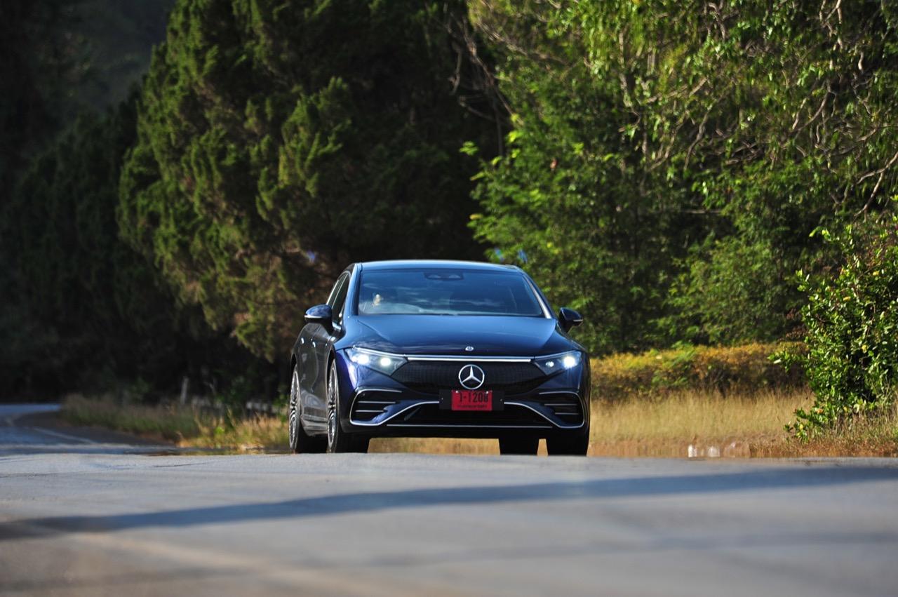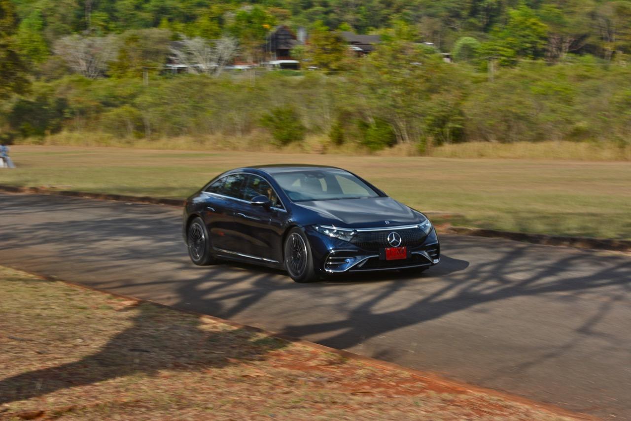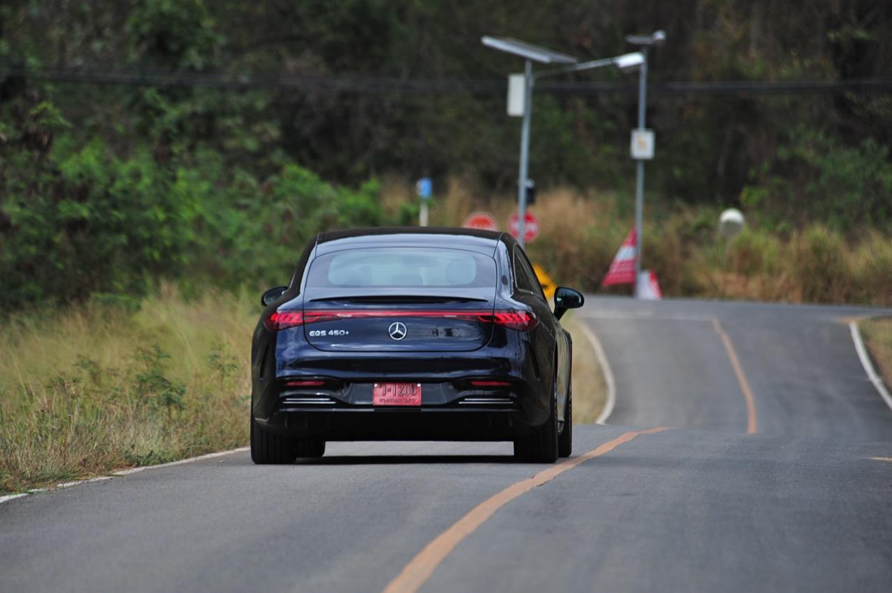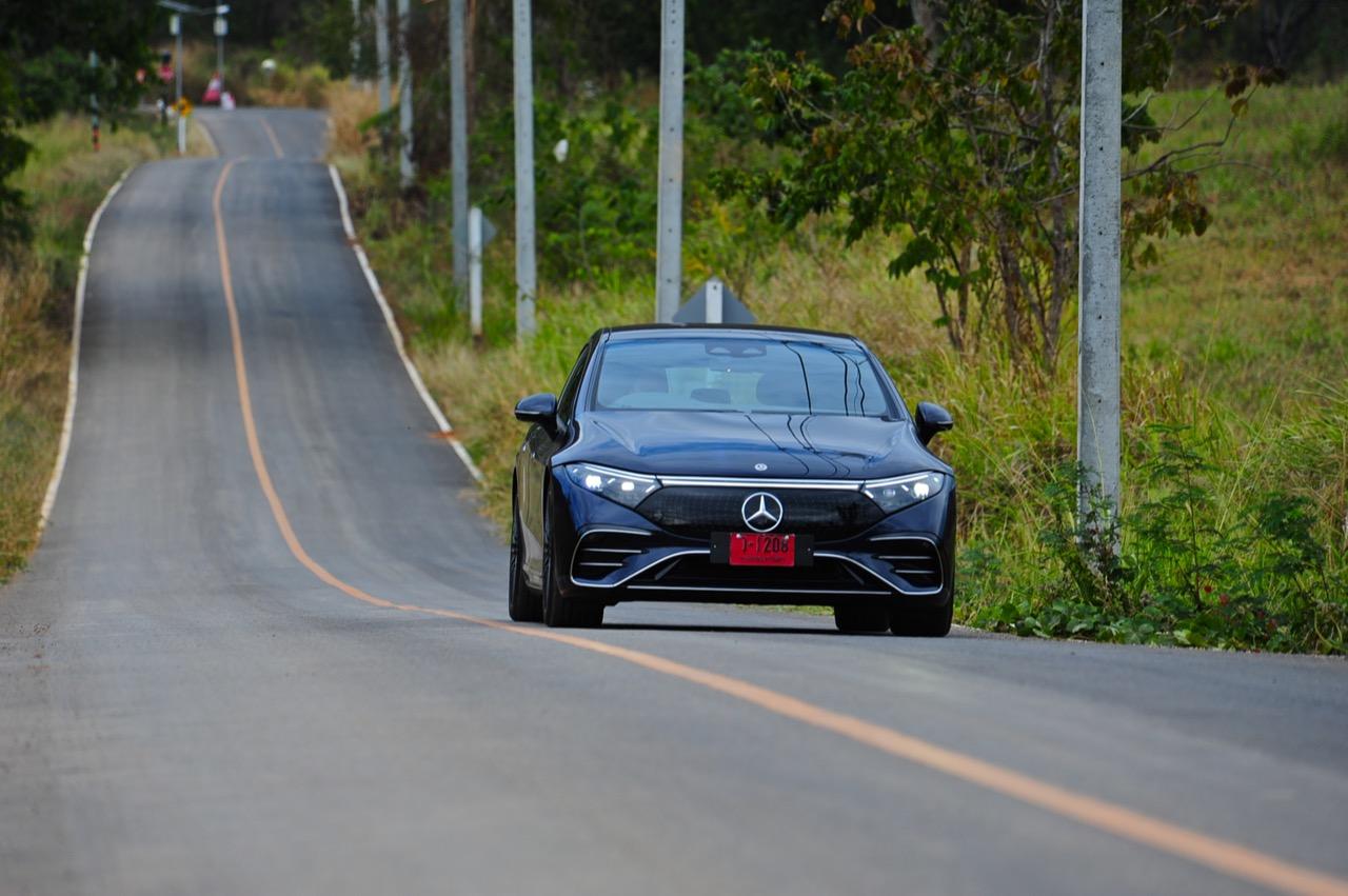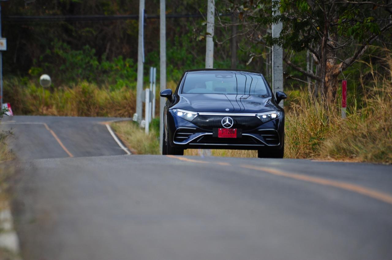 EQS มีระบบกันสะเทือนแบบถุงลม Adaptive Air Suspension หรือ Air Matic พร้อมแดมเปอร์แบบปรับได้ซึ่งมอบการขับขี่ที่ราบรื่นเป็นพิเศษ โดยได้รับความช่วยเหลือจากแก้มยางที่หนาขึ้น ห่อหุ้มล้อขนาด 21 นิ้ว 53.3 cm (9.5Jx21-inch H2 ET41.5) AMG multi-spoke light-alloy wheels aerodynamic optimised painted in high- gloss black with a high -sheen finish ยาง Goodyear EV ไซส์ 265/40R21 รถทดสอบสีน้ำเงินเข้มที่ดูเคร่งขรึม มันแพงและยังมีแค่คันเดียวในประเทศไทย ทำให้ผมเกิดความเครียดเวลาขับ เพราะถ้าชนขึ้นมา สื่ออีกนับสิบที่รออยู่ก็จะไม่ได้ขับ ล้ออัลลอยลายซี่ถี่ มีการออกแบบที่ปรับให้เหมาะกับอากาศ กระจังหน้ามีดาว Mercedes น้อยๆ อยู่หลายสิบดวง กระจกหน้ากว้างและค่อนข้างแบนจากองศาของเสาหน้าที่ถูกออกแบบให้รถมีความลู่ลมมากกว่า S -Class โหมดสปอร์ต ทำให้ระบบกันสะเทือนแข็งขึ้นและ EQS ดูดซับความไม่สมบูรณ์ของถนนในทุกรูปแบบแล้วส่งถ่ายออกมาเป็นความหนักแน่นและหนึบนุ่ม นอกจากนี้ เสียงลมและเสียงยางถูกผลึกอย่างแน่นหนา ทำให้เสียงแปลกปลอมจากภายนอกรถลอดเข้ามาภายในห้องโดยสารได้น้อยมาก การวิ่งด้วยความเร็วสูงที่เงียบเป็นพิเศษ กระจกที่ฉาบฉนวนกันความร้อน ระบบเสียงชั้นดี เบาะหนังนุ่มสบายพร้อมการตกแต่งภายในที่เต็มไปด้วยหนังกลับ Alcantara ในการเดินทางทดสอบระยะไกล บนถนนสายยาวเลียบภูเขาในแถบหมูสี มันให้ความรู้สึกเหมือน S580e ที่ไม่มีเครื่องยนต์