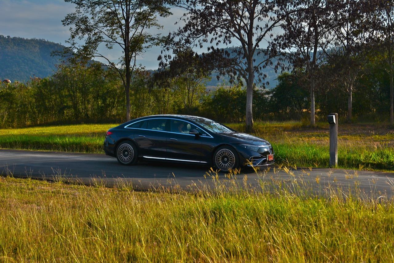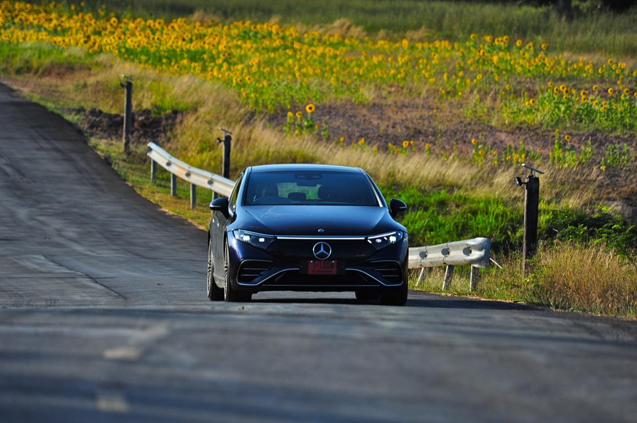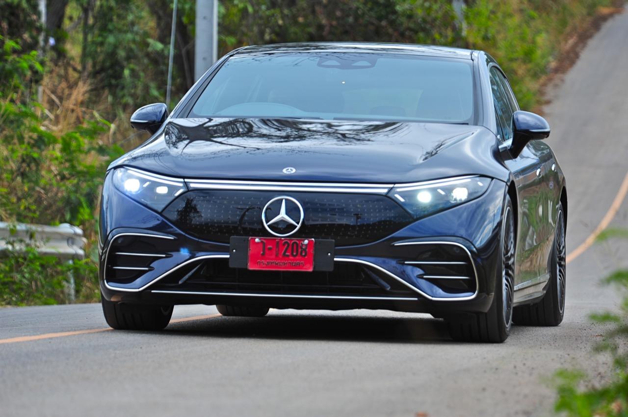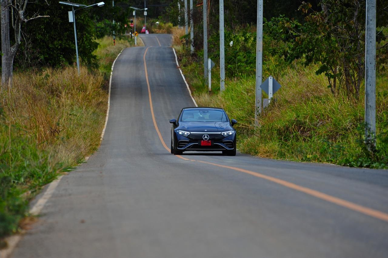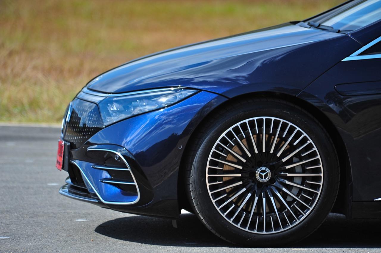 EQS มีระบบกันสะเทือนแบบถุงลม Adaptive Air Suspension หรือ Air Matic พร้อมแดมเปอร์แบบปรับได้ซึ่งมอบการขับขี่ที่ราบรื่นเป็นพิเศษ โดยได้รับความช่วยเหลือจากแก้มยางที่หนาขึ้น ห่อหุ้มล้อขนาด 21 นิ้ว 53.3 cm (9.5Jx21-inch H2 ET41.5) AMG multi-spoke light-alloy wheels aerodynamic optimised painted in high- gloss black with a high -sheen finish ยาง Goodyear EV ไซส์ 265/40R21 รถทดสอบสีน้ำเงินเข้มที่ดูเคร่งขรึม มันแพงและยังมีแค่คันเดียวในประเทศไทย ทำให้ผมเกิดความเครียดเวลาขับ เพราะถ้าชนขึ้นมา สื่ออีกนับสิบที่รออยู่ก็จะไม่ได้ขับ ล้ออัลลอยลายซี่ถี่ มีการออกแบบที่ปรับให้เหมาะกับอากาศ กระจังหน้ามีดาว Mercedes น้อยๆ อยู่หลายสิบดวง กระจกหน้ากว้างและค่อนข้างแบนจากองศาของเสาหน้าที่ถูกออกแบบให้รถมีความลู่ลมมากกว่า S -Class โหมดสปอร์ต ทำให้ระบบกันสะเทือนแข็งขึ้นและ EQS ดูดซับความไม่สมบูรณ์ของถนนในทุกรูปแบบแล้วส่งถ่ายออกมาเป็นความหนักแน่นและหนึบนุ่ม นอกจากนี้ เสียงลมและเสียงยางถูกผลึกอย่างแน่นหนา ทำให้เสียงแปลกปลอมจากภายนอกรถลอดเข้ามาภายในห้องโดยสารได้น้อยมาก การวิ่งด้วยความเร็วสูงที่เงียบเป็นพิเศษ กระจกที่ฉาบฉนวนกันความร้อน ระบบเสียงชั้นดี เบาะหนังนุ่มสบายพร้อมการตกแต่งภายในที่เต็มไปด้วยหนังกลับ Alcantara ในการเดินทางทดสอบระยะไกล บนถนนสายยาวเลียบภูเขาในแถบหมูสี มันให้ความรู้สึกเหมือน S580e ที่ไม่มีเครื่องยนต์