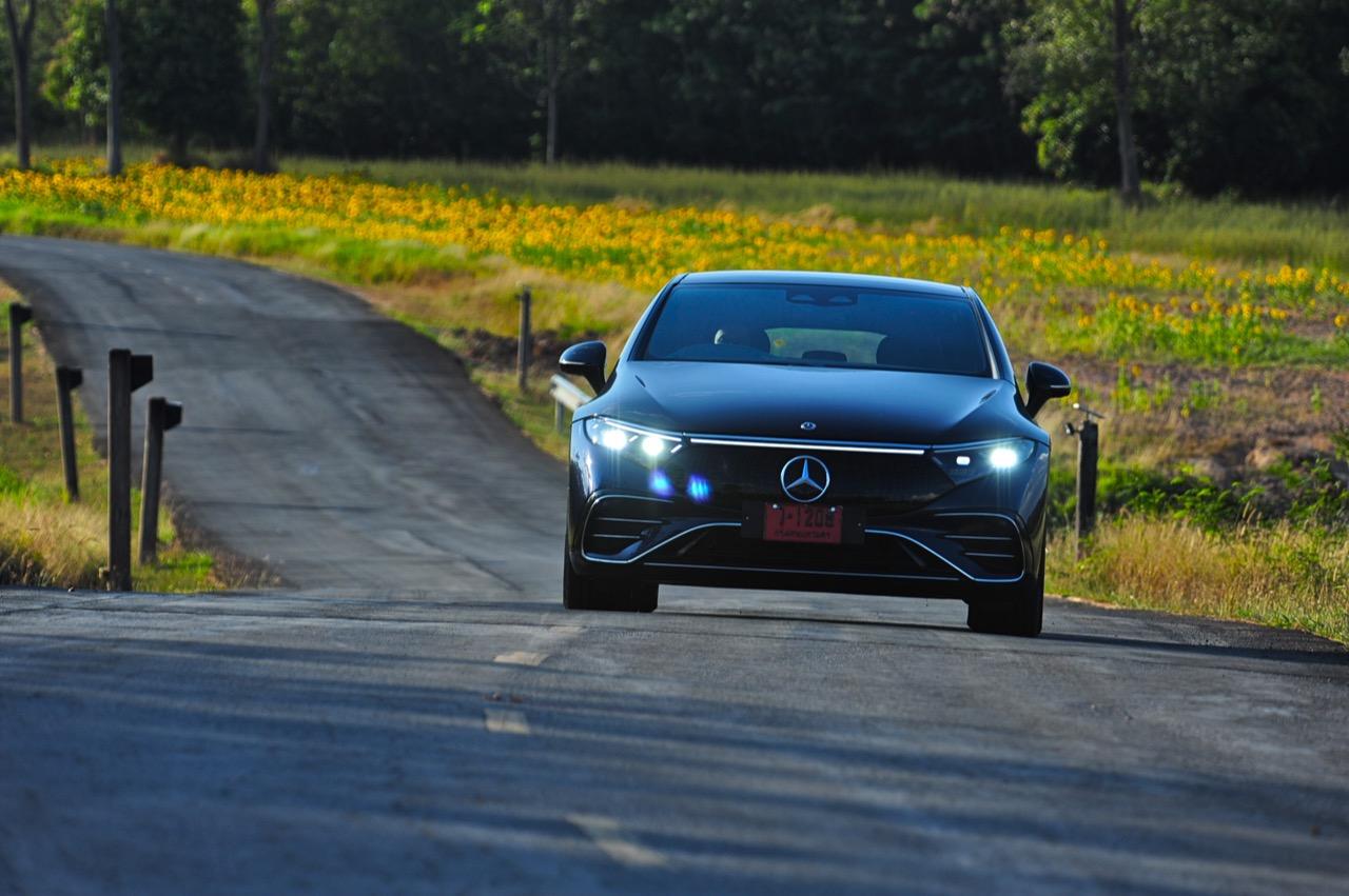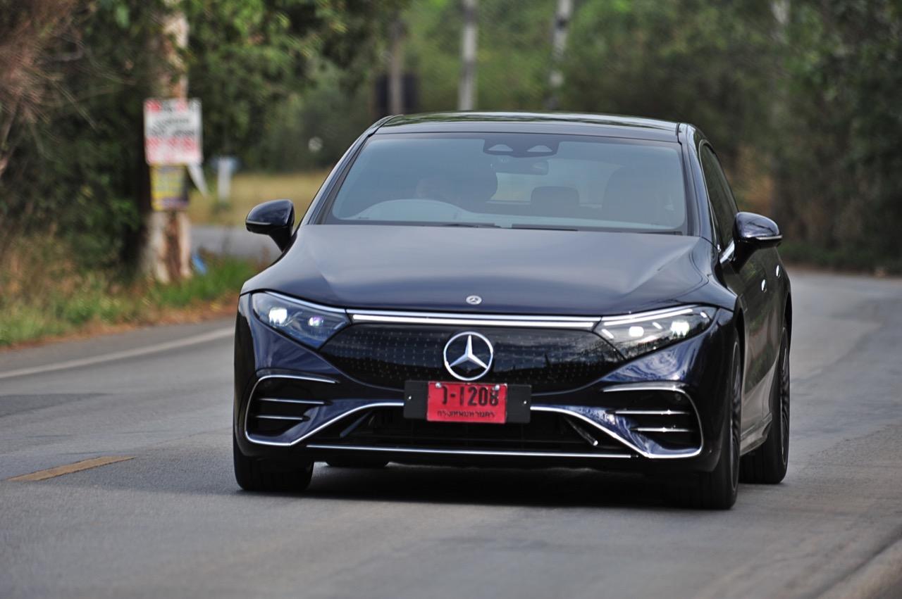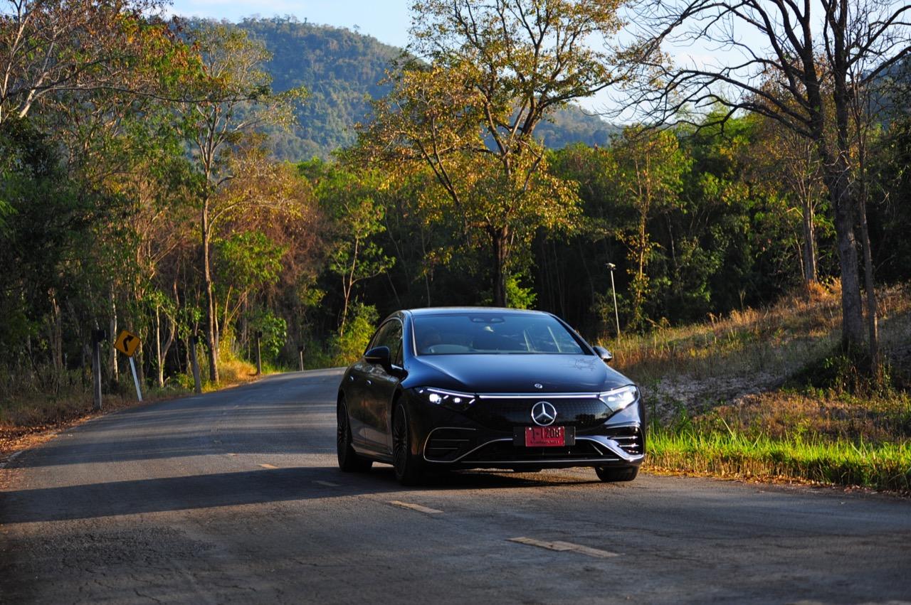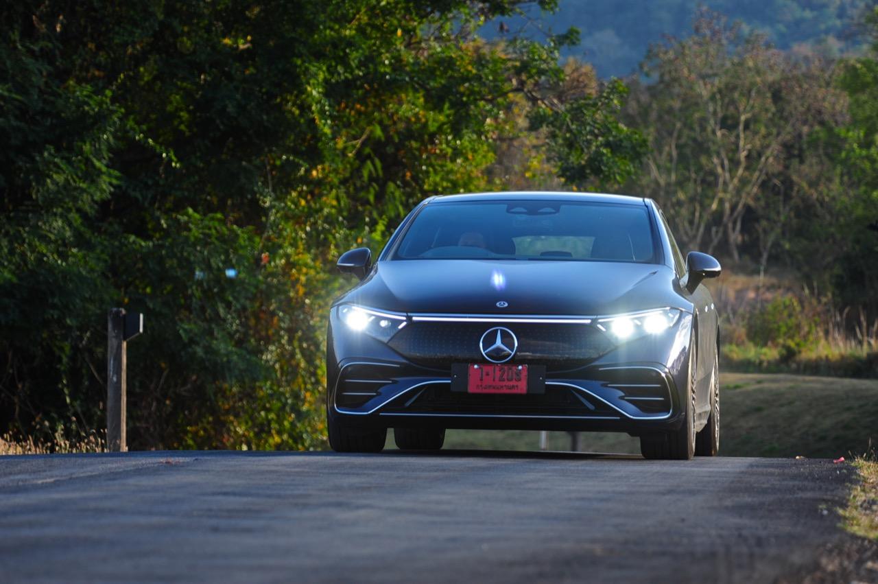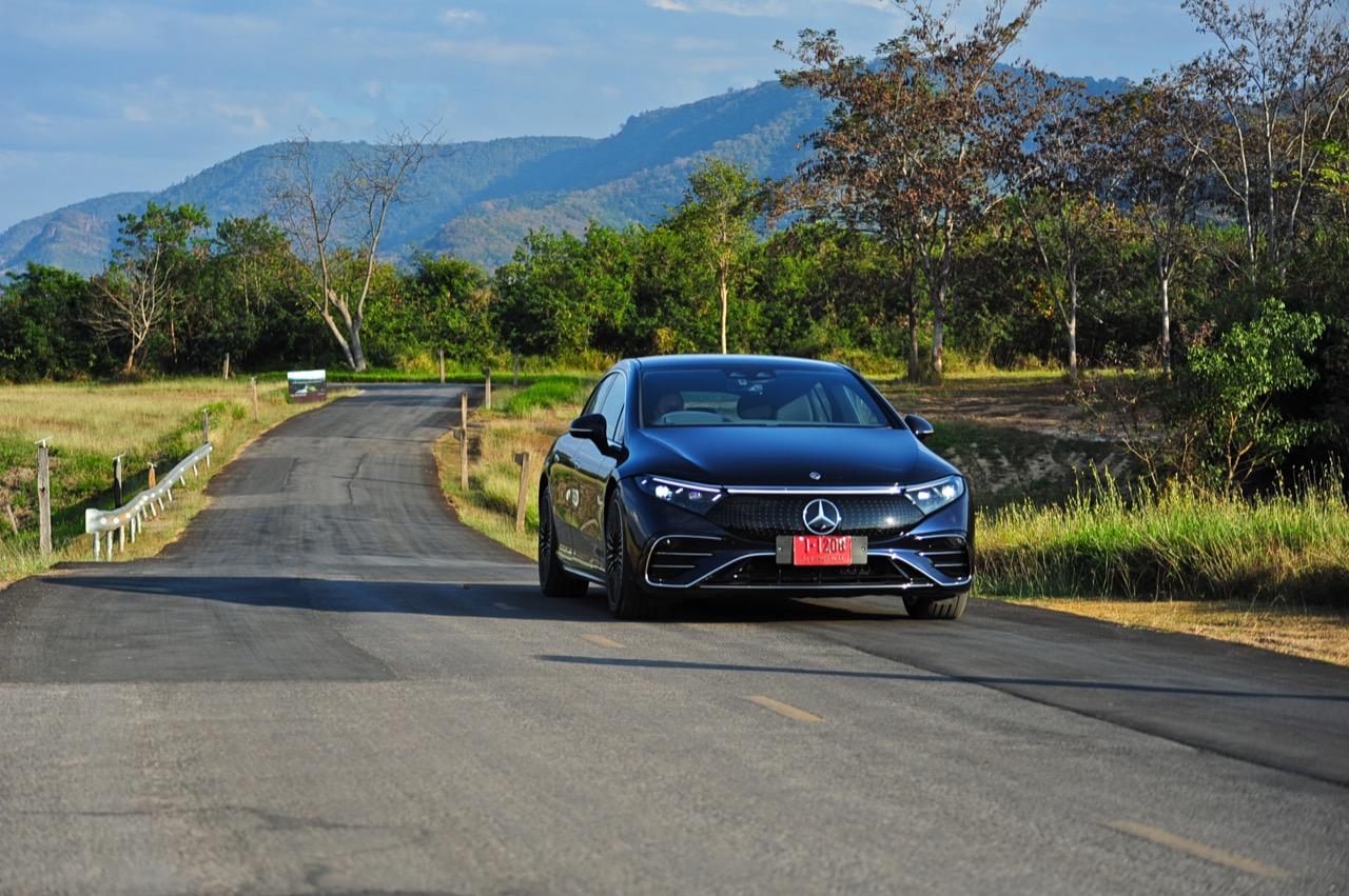 EQS มีระบบกันสะเทือนแบบถุงลม Adaptive Air Suspension หรือ Air Matic พร้อมแดมเปอร์แบบปรับได้ซึ่งมอบการขับขี่ที่ราบรื่นเป็นพิเศษ โดยได้รับความช่วยเหลือจากแก้มยางที่หนาขึ้น ห่อหุ้มล้อขนาด 21 นิ้ว 53.3 cm (9.5Jx21-inch H2 ET41.5) AMG multi-spoke light-alloy wheels aerodynamic optimised painted in high- gloss black with a high -sheen finish ยาง Goodyear EV ไซส์ 265/40R21 รถทดสอบสีน้ำเงินเข้มที่ดูเคร่งขรึม มันแพงและยังมีแค่คันเดียวในประเทศไทย ทำให้ผมเกิดความเครียดเวลาขับ เพราะถ้าชนขึ้นมา สื่ออีกนับสิบที่รออยู่ก็จะไม่ได้ขับ ล้ออัลลอยลายซี่ถี่ มีการออกแบบที่ปรับให้เหมาะกับอากาศ กระจังหน้ามีดาว Mercedes น้อยๆ อยู่หลายสิบดวง กระจกหน้ากว้างและค่อนข้างแบนจากองศาของเสาหน้าที่ถูกออกแบบให้รถมีความลู่ลมมากกว่า S -Class โหมดสปอร์ต ทำให้ระบบกันสะเทือนแข็งขึ้นและ EQS ดูดซับความไม่สมบูรณ์ของถนนในทุกรูปแบบแล้วส่งถ่ายออกมาเป็นความหนักแน่นและหนึบนุ่ม นอกจากนี้ เสียงลมและเสียงยางถูกผลึกอย่างแน่นหนา ทำให้เสียงแปลกปลอมจากภายนอกรถลอดเข้ามาภายในห้องโดยสารได้น้อยมาก การวิ่งด้วยความเร็วสูงที่เงียบเป็นพิเศษ กระจกที่ฉาบฉนวนกันความร้อน ระบบเสียงชั้นดี เบาะหนังนุ่มสบายพร้อมการตกแต่งภายในที่เต็มไปด้วยหนังกลับ Alcantara ในการเดินทางทดสอบระยะไกล บนถนนสายยาวเลียบภูเขาในแถบหมูสี มันให้ความรู้สึกเหมือน S580e ที่ไม่มีเครื่องยนต์