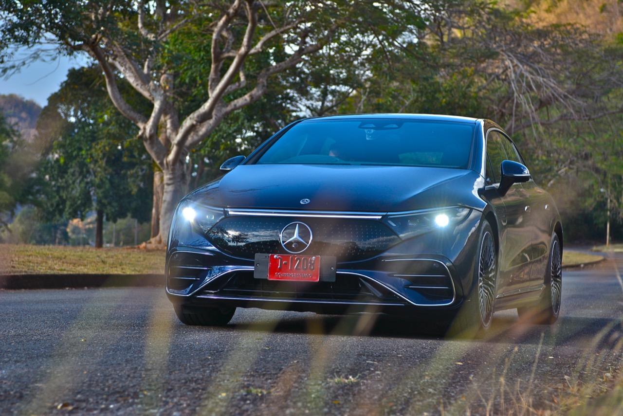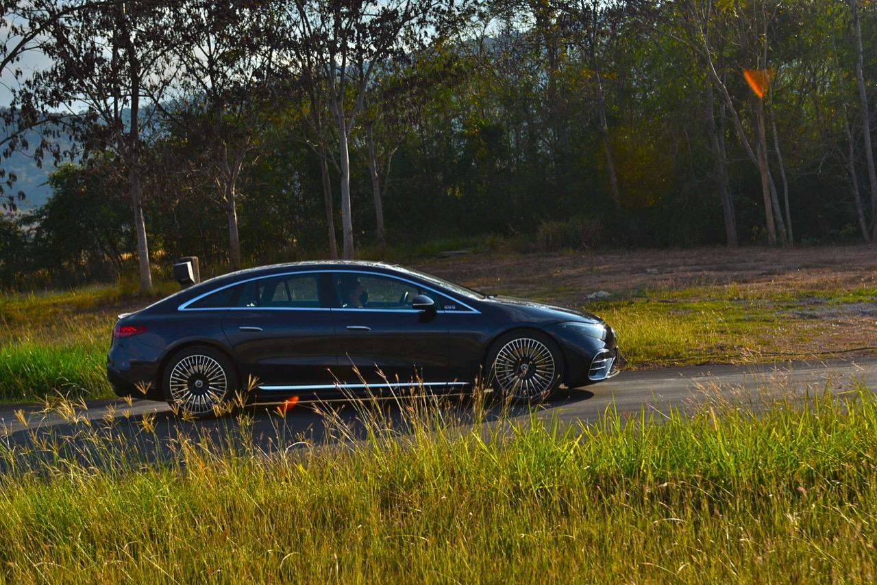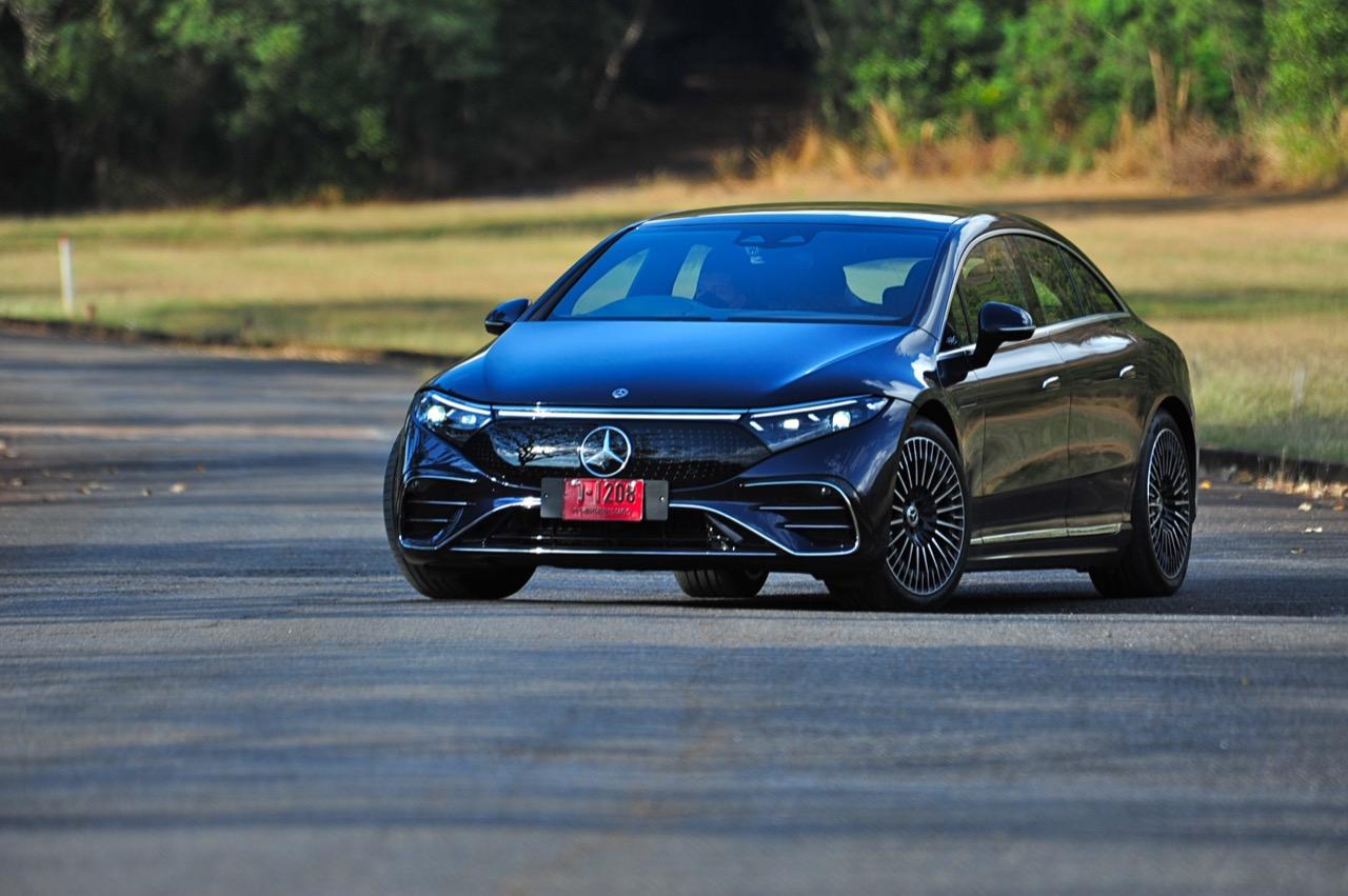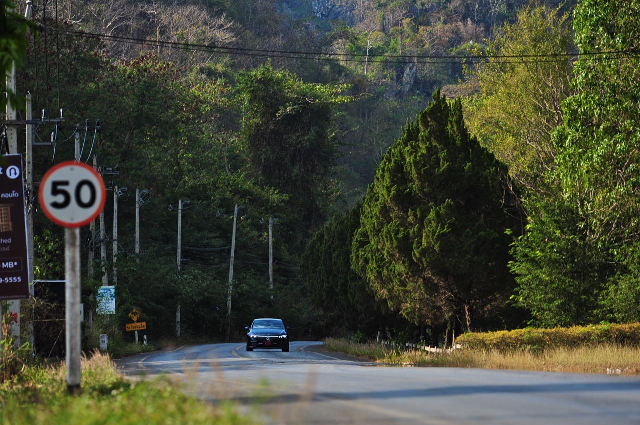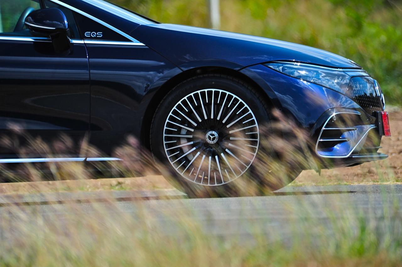 EQS มีระบบกันสะเทือนแบบถุงลม Adaptive Air Suspension หรือ Air Matic พร้อมแดมเปอร์แบบปรับได้ซึ่งมอบการขับขี่ที่ราบรื่นเป็นพิเศษ โดยได้รับความช่วยเหลือจากแก้มยางที่หนาขึ้น ห่อหุ้มล้อขนาด 21 นิ้ว 53.3 cm (9.5Jx21-inch H2 ET41.5) AMG multi-spoke light-alloy wheels aerodynamic optimised painted in high- gloss black with a high -sheen finish ยาง Goodyear EV ไซส์ 265/40R21 รถทดสอบสีน้ำเงินเข้มที่ดูเคร่งขรึม มันแพงและยังมีแค่คันเดียวในประเทศไทย ทำให้ผมเกิดความเครียดเวลาขับ เพราะถ้าชนขึ้นมา สื่ออีกนับสิบที่รออยู่ก็จะไม่ได้ขับ ล้ออัลลอยลายซี่ถี่ มีการออกแบบที่ปรับให้เหมาะกับอากาศ กระจังหน้ามีดาว Mercedes น้อยๆ อยู่หลายสิบดวง กระจกหน้ากว้างและค่อนข้างแบนจากองศาของเสาหน้าที่ถูกออกแบบให้รถมีความลู่ลมมากกว่า S -Class โหมดสปอร์ต ทำให้ระบบกันสะเทือนแข็งขึ้นและ EQS ดูดซับความไม่สมบูรณ์ของถนนในทุกรูปแบบแล้วส่งถ่ายออกมาเป็นความหนักแน่นและหนึบนุ่ม นอกจากนี้ เสียงลมและเสียงยางถูกผลึกอย่างแน่นหนา ทำให้เสียงแปลกปลอมจากภายนอกรถลอดเข้ามาภายในห้องโดยสารได้น้อยมาก การวิ่งด้วยความเร็วสูงที่เงียบเป็นพิเศษ กระจกที่ฉาบฉนวนกันความร้อน ระบบเสียงชั้นดี เบาะหนังนุ่มสบายพร้อมการตกแต่งภายในที่เต็มไปด้วยหนังกลับ Alcantara ในการเดินทางทดสอบระยะไกล บนถนนสายยาวเลียบภูเขาในแถบหมูสี มันให้ความรู้สึกเหมือน S580e ที่ไม่มีเครื่องยนต์
