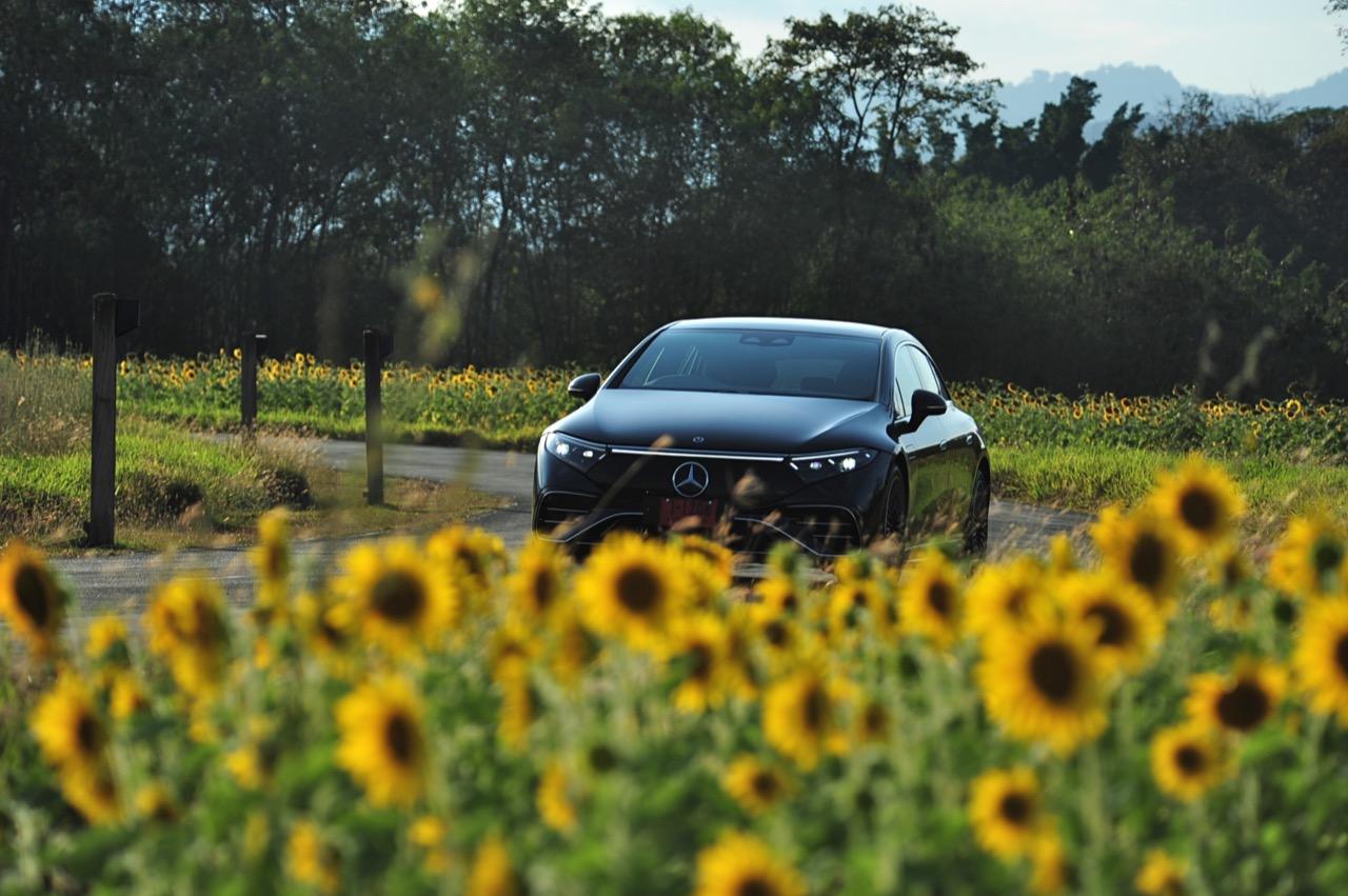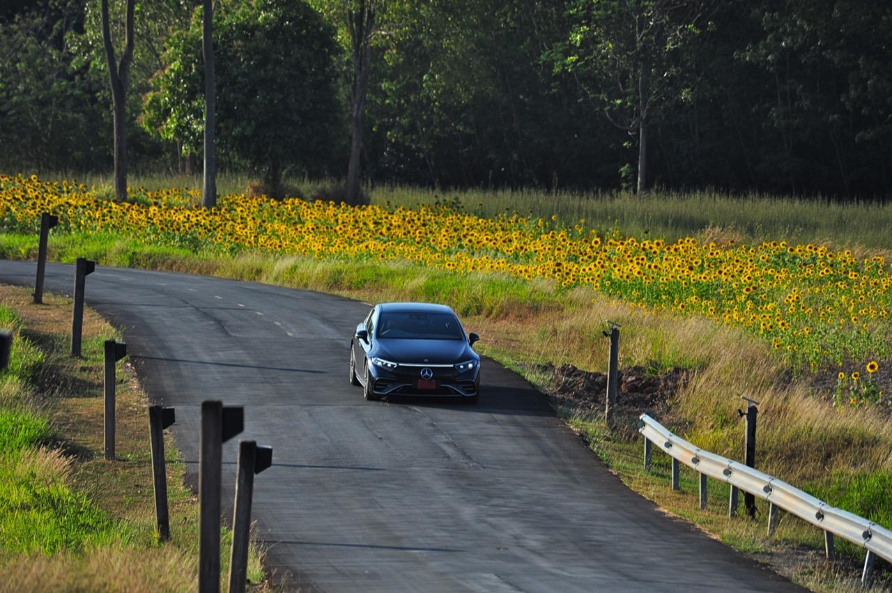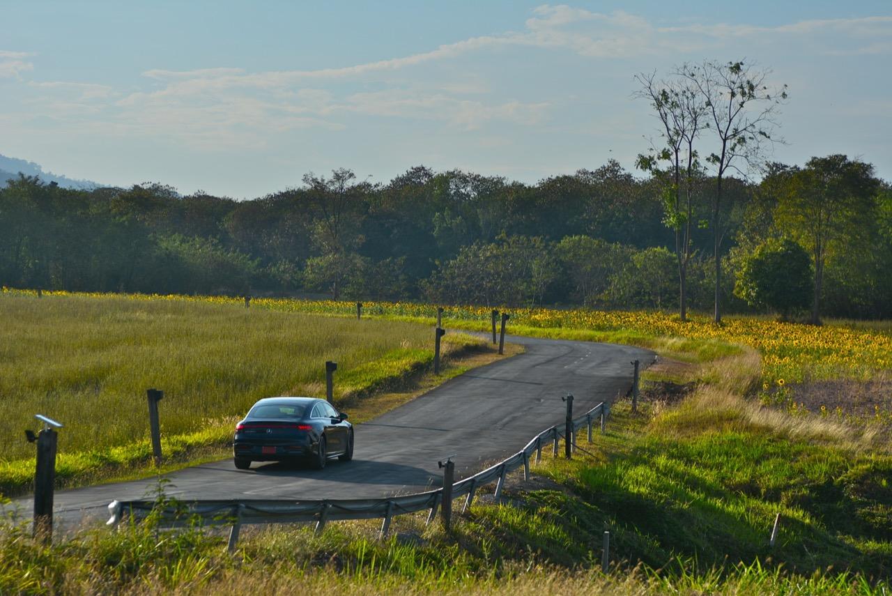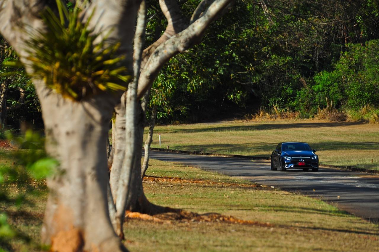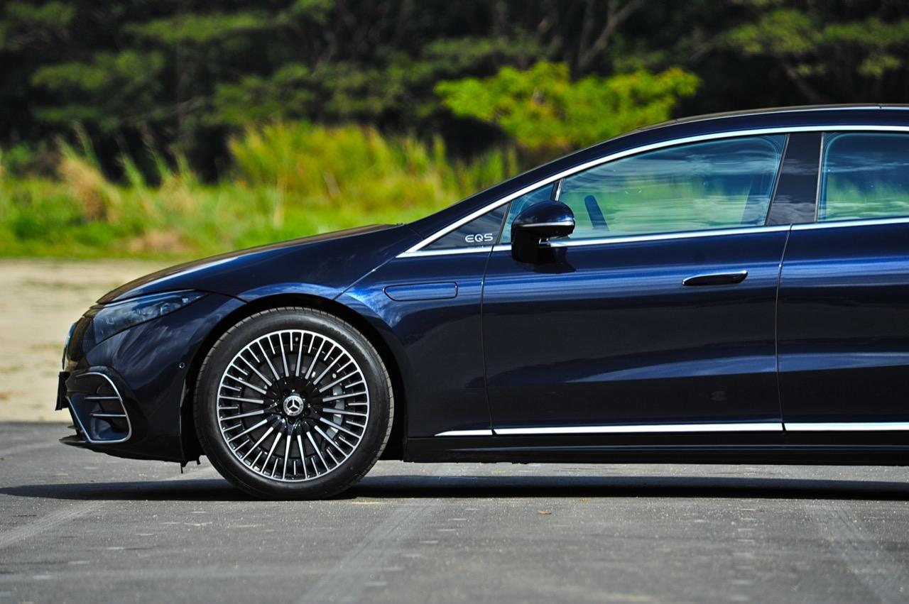 EQS มีระบบกันสะเทือนแบบถุงลม Adaptive Air Suspension หรือ Air Matic พร้อมแดมเปอร์แบบปรับได้ซึ่งมอบการขับขี่ที่ราบรื่นเป็นพิเศษ โดยได้รับความช่วยเหลือจากแก้มยางที่หนาขึ้น ห่อหุ้มล้อขนาด 21 นิ้ว 53.3 cm (9.5Jx21-inch H2 ET41.5) AMG multi-spoke light-alloy wheels aerodynamic optimised painted in high- gloss black with a high -sheen finish ยาง Goodyear EV ไซส์ 265/40R21 รถทดสอบสีน้ำเงินเข้มที่ดูเคร่งขรึม มันแพงและยังมีแค่คันเดียวในประเทศไทย ทำให้ผมเกิดความเครียดเวลาขับ เพราะถ้าชนขึ้นมา สื่ออีกนับสิบที่รออยู่ก็จะไม่ได้ขับ ล้ออัลลอยลายซี่ถี่ มีการออกแบบที่ปรับให้เหมาะกับอากาศ กระจังหน้ามีดาว Mercedes น้อยๆ อยู่หลายสิบดวง กระจกหน้ากว้างและค่อนข้างแบนจากองศาของเสาหน้าที่ถูกออกแบบให้รถมีความลู่ลมมากกว่า S -Class โหมดสปอร์ต ทำให้ระบบกันสะเทือนแข็งขึ้นและ EQS ดูดซับความไม่สมบูรณ์ของถนนในทุกรูปแบบแล้วส่งถ่ายออกมาเป็นความหนักแน่นและหนึบนุ่ม นอกจากนี้ เสียงลมและเสียงยางถูกผลึกอย่างแน่นหนา ทำให้เสียงแปลกปลอมจากภายนอกรถลอดเข้ามาภายในห้องโดยสารได้น้อยมาก การวิ่งด้วยความเร็วสูงที่เงียบเป็นพิเศษ กระจกที่ฉาบฉนวนกันความร้อน ระบบเสียงชั้นดี เบาะหนังนุ่มสบายพร้อมการตกแต่งภายในที่เต็มไปด้วยหนังกลับ Alcantara ในการเดินทางทดสอบระยะไกล บนถนนสายยาวเลียบภูเขาในแถบหมูสี มันให้ความรู้สึกเหมือน S580e ที่ไม่มีเครื่องยนต์