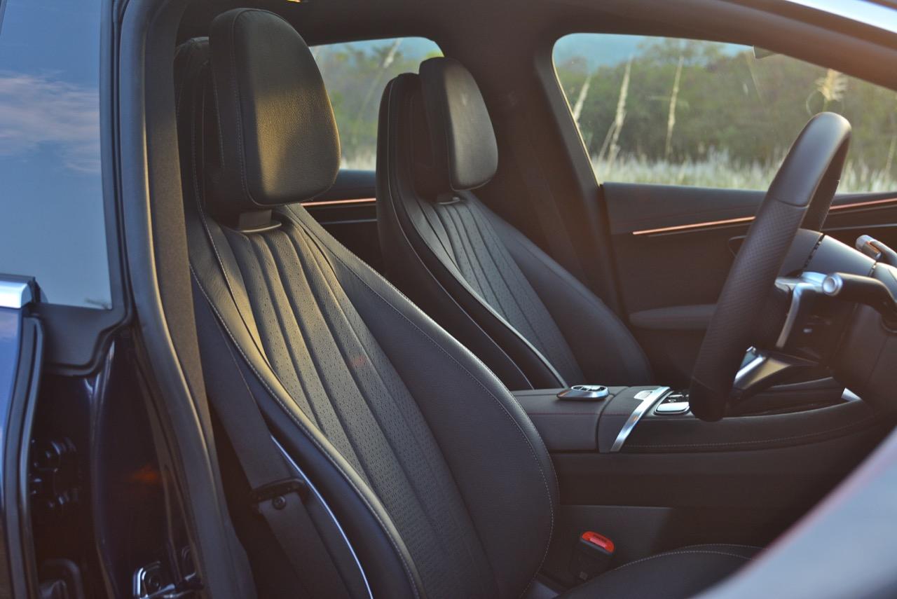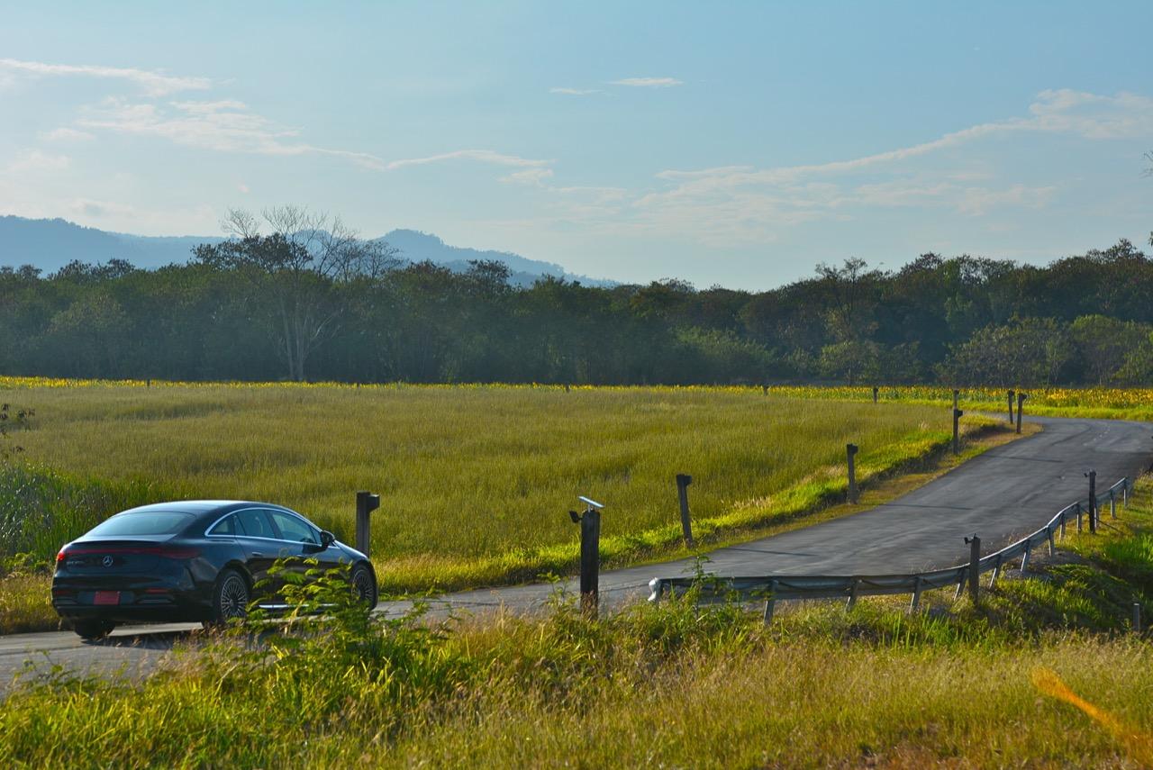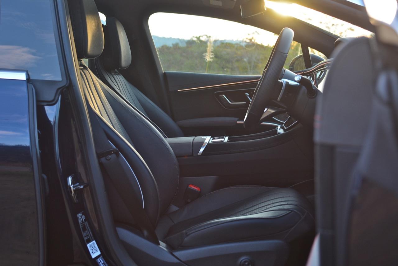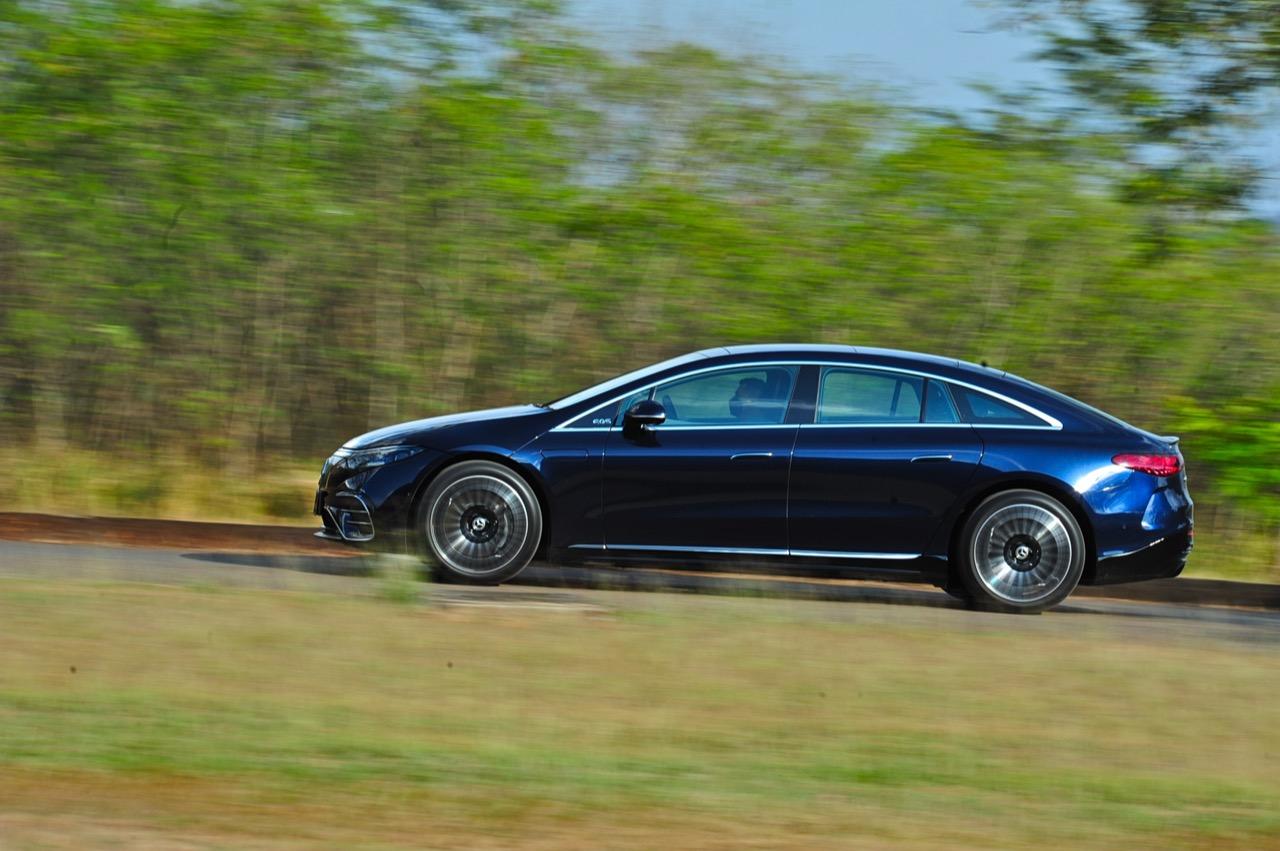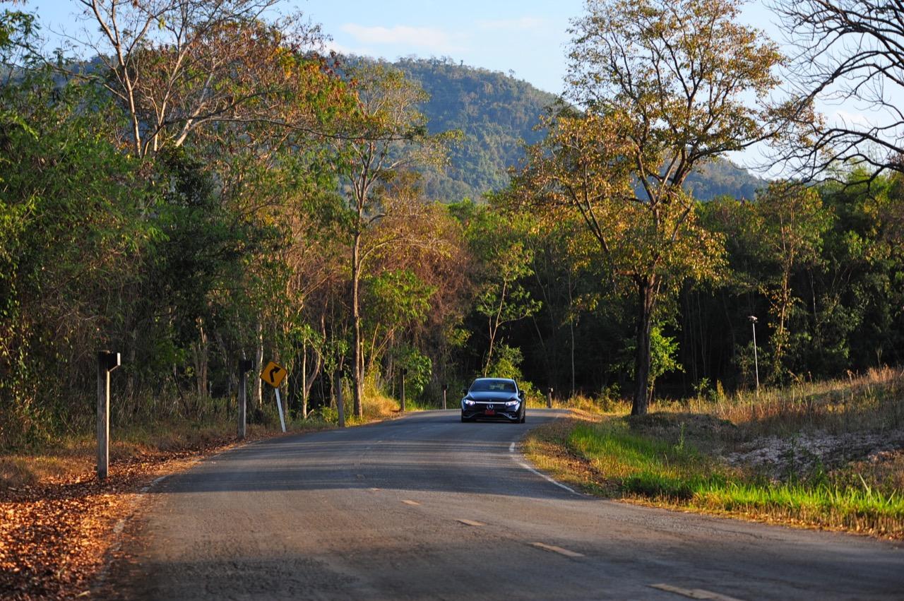 EQS มีระบบกันสะเทือนแบบถุงลม Adaptive Air Suspension หรือ Air Matic พร้อมแดมเปอร์แบบปรับได้ซึ่งมอบการขับขี่ที่ราบรื่นเป็นพิเศษ โดยได้รับความช่วยเหลือจากแก้มยางที่หนาขึ้น ห่อหุ้มล้อขนาด 21 นิ้ว 53.3 cm (9.5Jx21-inch H2 ET41.5) AMG multi-spoke light-alloy wheels aerodynamic optimised painted in high- gloss black with a high -sheen finish ยาง Goodyear EV ไซส์ 265/40R21 รถทดสอบสีน้ำเงินเข้มที่ดูเคร่งขรึม มันแพงและยังมีแค่คันเดียวในประเทศไทย ทำให้ผมเกิดความเครียดเวลาขับ เพราะถ้าชนขึ้นมา สื่ออีกนับสิบที่รออยู่ก็จะไม่ได้ขับ ล้ออัลลอยลายซี่ถี่ มีการออกแบบที่ปรับให้เหมาะกับอากาศ กระจังหน้ามีดาว Mercedes น้อยๆ อยู่หลายสิบดวง กระจกหน้ากว้างและค่อนข้างแบนจากองศาของเสาหน้าที่ถูกออกแบบให้รถมีความลู่ลมมากกว่า S -Class โหมดสปอร์ต ทำให้ระบบกันสะเทือนแข็งขึ้นและ EQS ดูดซับความไม่สมบูรณ์ของถนนในทุกรูปแบบแล้วส่งถ่ายออกมาเป็นความหนักแน่นและหนึบนุ่ม นอกจากนี้ เสียงลมและเสียงยางถูกผลึกอย่างแน่นหนา ทำให้เสียงแปลกปลอมจากภายนอกรถลอดเข้ามาภายในห้องโดยสารได้น้อยมาก การวิ่งด้วยความเร็วสูงที่เงียบเป็นพิเศษ กระจกที่ฉาบฉนวนกันความร้อน ระบบเสียงชั้นดี เบาะหนังนุ่มสบายพร้อมการตกแต่งภายในที่เต็มไปด้วยหนังกลับ Alcantara ในการเดินทางทดสอบระยะไกล บนถนนสายยาวเลียบภูเขาในแถบหมูสี มันให้ความรู้สึกเหมือน S580e ที่ไม่มีเครื่องยนต์
