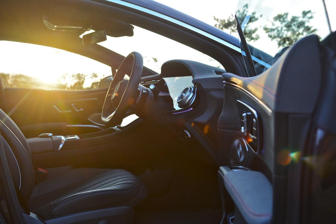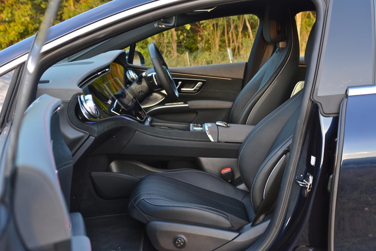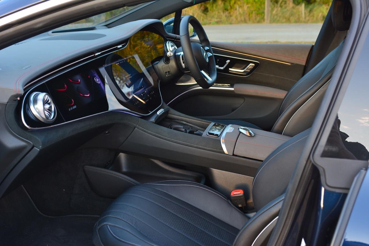 การติดตั้งแผงหน้าปัดมาตรฐานของ EQS450 นั้นคล้ายกับของ S-Class ใหม่ โดยมีแผงหน้าจอสามตำแหน่งที่กว้างขวาง ซึ่งขยายความกว้างของห้องโดยสารให้ดูใหญ่โตเกินความเป็นจริง หน้าจอสัมผัสขนาด 12.8 นิ้ว และคลัสเตอร์เกจมาตรวัดดิจิทัลขนาด 12.3 นิ้ว ที่ปรับการแสดงผลได้อย่างหลากหลาย การออกแบบห้องโดยสารของ EQS แตกต่างจาก S-Class อย่างเห็นได้ชัด รูปทรงปีกของแผงหน้าปัด ช่องระบายอากาศสไตล์เทอร์ไบน์อันน่าทึ่งที่มุมทั้งสองข้างของแดชบอร์ดส่วนบน ช่องระบายอากาศบางเฉียบ พื้นที่เปิดโล่งมากมายใต้คอนโซลกลางสำหรับเก็บของกระจุกกระจิก และแผงประตูที่อุดมไปด้วยสวิชท์ปรับตั้งกระจก ม่านไฟฟ้าและเบาะนั่ง เป็นเอกลักษณ์ของรถรุ่นเรือธงที่จะต้องมีแผงประตูอลังการ การออกแบบห้องโดยสารของ EQS นั้นดูดีที่สุดในโทนสีอ่อน แม้ว่ารถทดสอบใช้หนังสีเทาที่นุ่มนิ่มนั่งสบาย วัสดุพวกไม้มีการเคลือบผิวป้องกันรอยขีดข่วน