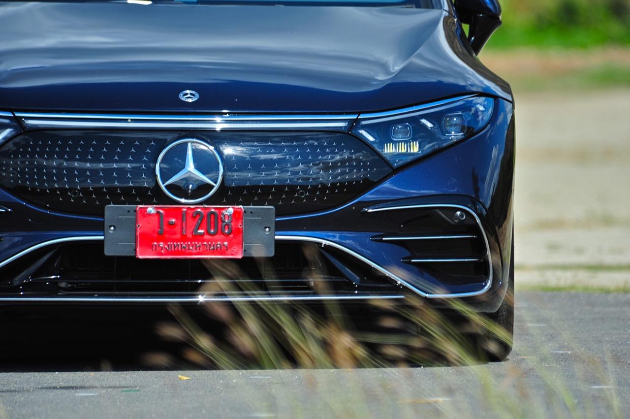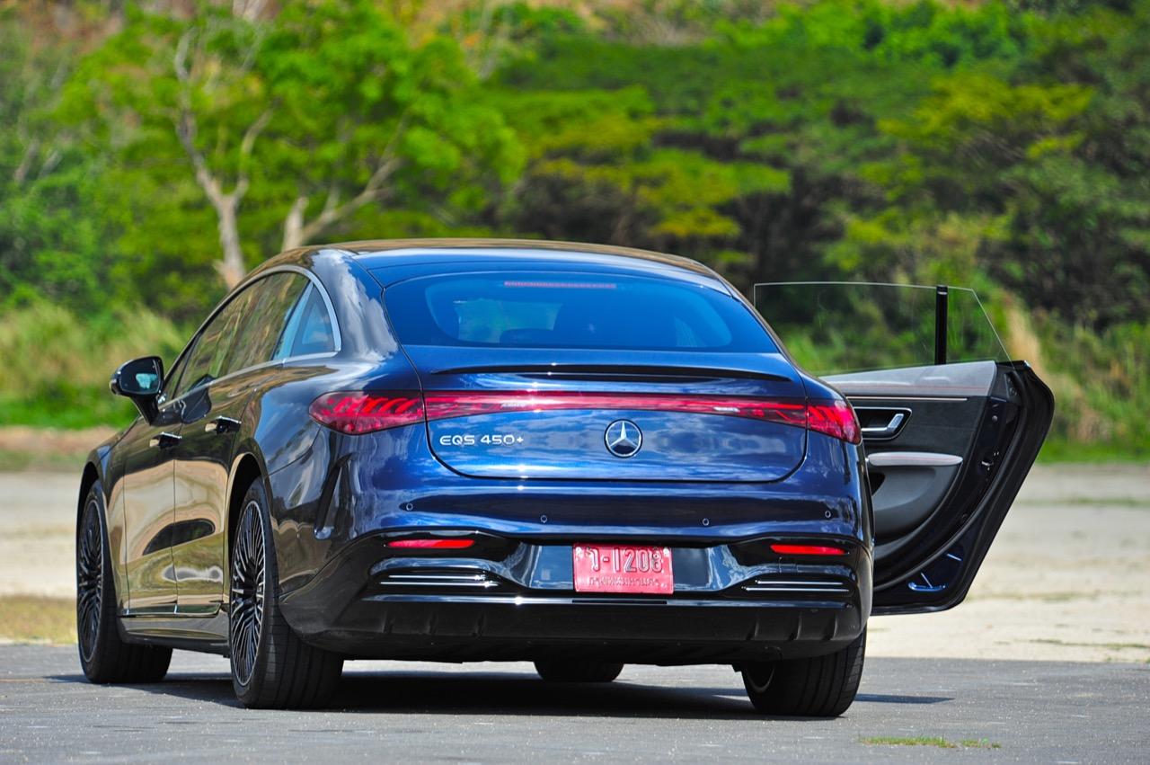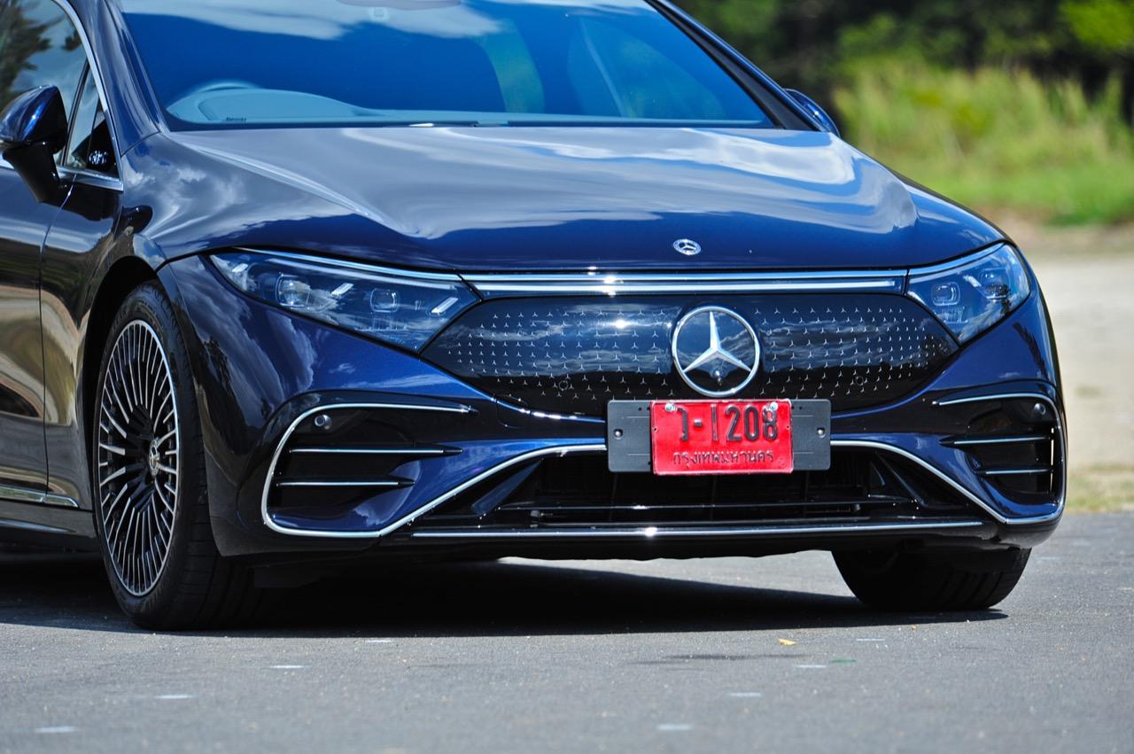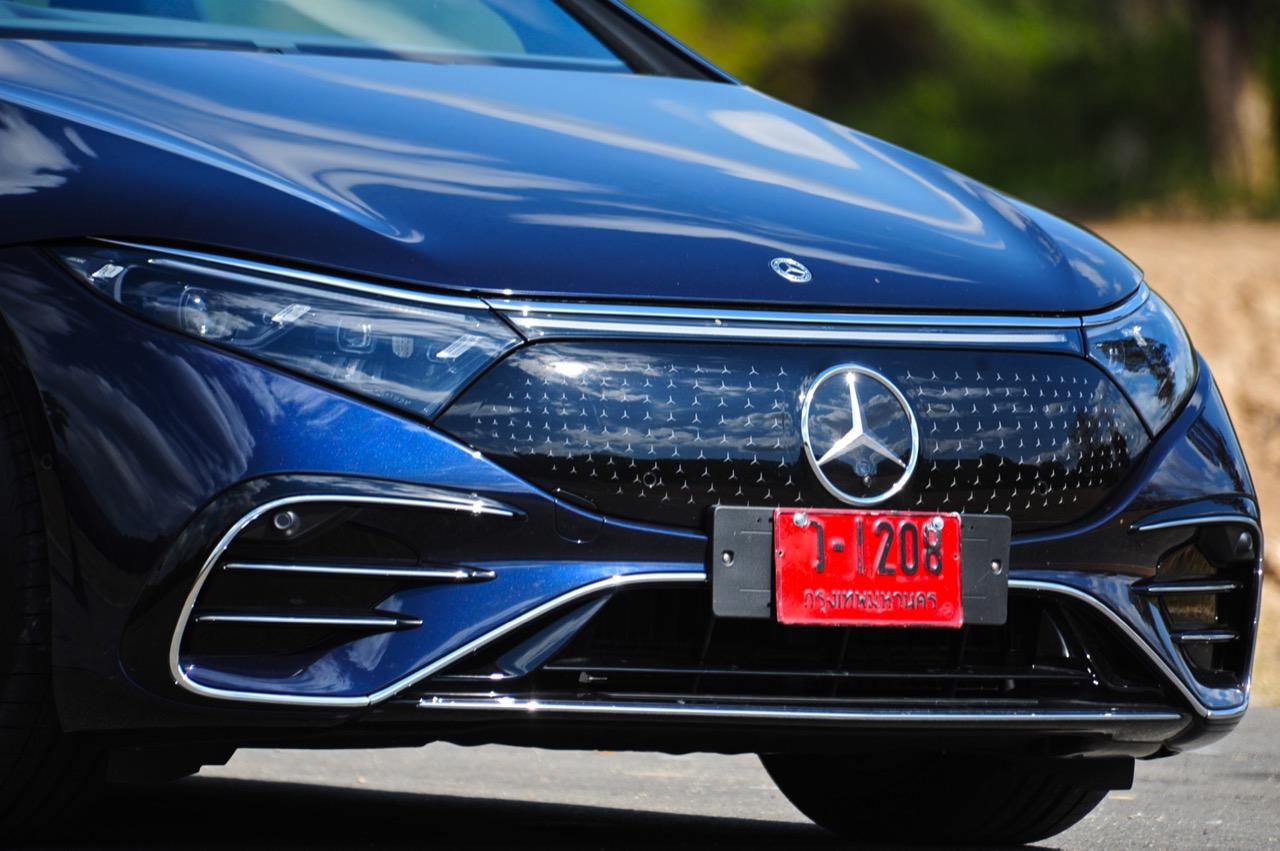 เหตุผลใหญ่ที่ทำให้ EQS มีระยะทำการที่ไกลขนาดนี้ เป็นเพราะหลักแอร์โรไดนามิกส์ท่ีถูกต้อง มันลื่นไหลมากเป็นพิเศษ มีค่าสัมประสิทธิ์แรงเสียดทานอากาศต่ำสุดๆ และน่าจะต่ำที่สุดในโลกด้วยซ้ำ คนที่ชอบรูปลักษณ์ของ EQS อย่างแท้จริงก็คือ คนที่กำลังเปลี่ยนจากรถเครื่องสันดาปไปเป็นมอเตอร์ไฟฟ้า สไตล์ที่โฉบเฉี่ยวบนเรือนร่างที่พลิ้วไหว EQS มีรายละเอียดเจ๋งๆ อยู่เต็มไปหมด เช่น 'กระจังหน้า' ลายดาวและไฟท้าย LED รูปทรงเกลียว สีน้ำเงินเข้มไม่ใช่สีที่ดีที่สุดสำหรับ EQS อย่างแน่นอน และชุดแต่ง AMG Line ก็ทำให้มันดูเอาจริงเอาจังมากกว่าเดิม ช่องรับอากาศขนาดใหญ่ในชุดกันชน AMG แนวหลังคาที่โค้งลงไปยังส่วนท้ายอย่างสวยงาม โดยภาพรวม EQS ทำให้นึกถึงรถต้นแบบในช่วงปี 2000
