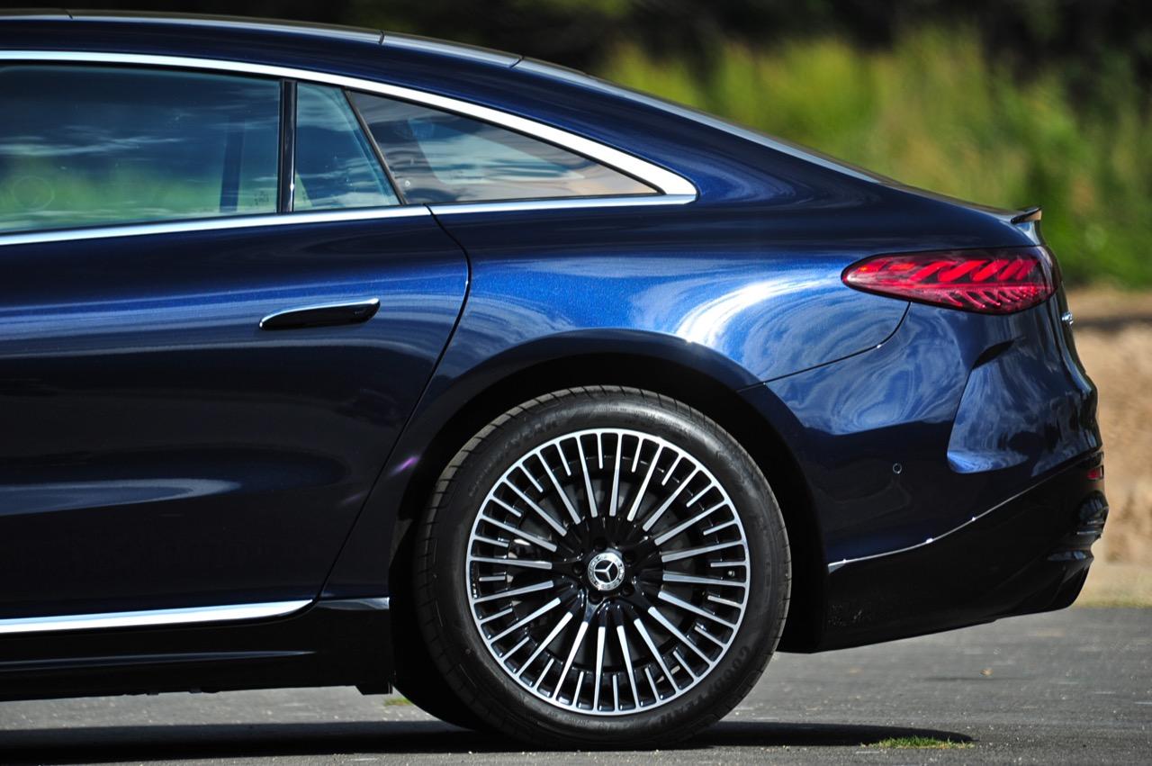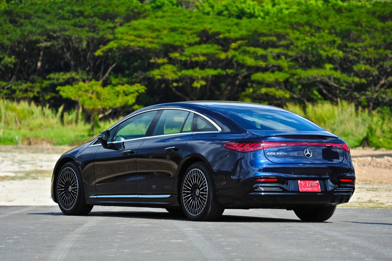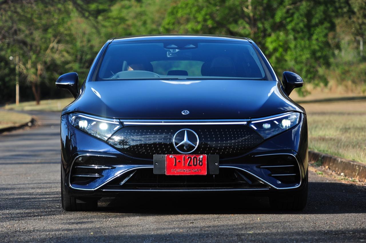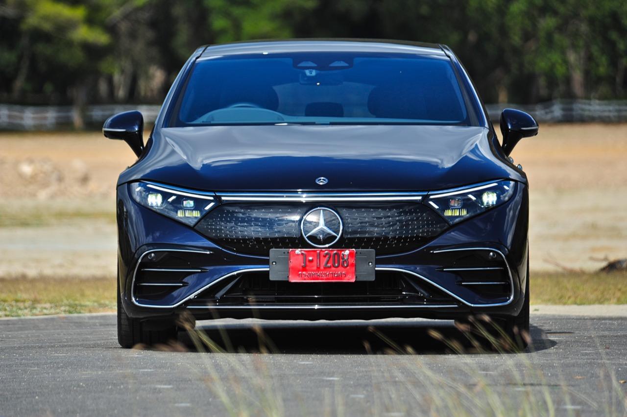 เหตุผลใหญ่ที่ทำให้ EQS มีระยะทำการที่ไกลขนาดนี้ เป็นเพราะหลักแอร์โรไดนามิกส์ท่ีถูกต้อง มันลื่นไหลมากเป็นพิเศษ มีค่าสัมประสิทธิ์แรงเสียดทานอากาศต่ำสุดๆ และน่าจะต่ำที่สุดในโลกด้วยซ้ำ คนที่ชอบรูปลักษณ์ของ EQS อย่างแท้จริงก็คือ คนที่กำลังเปลี่ยนจากรถเครื่องสันดาปไปเป็นมอเตอร์ไฟฟ้า สไตล์ที่โฉบเฉี่ยวบนเรือนร่างที่พลิ้วไหว EQS มีรายละเอียดเจ๋งๆ อยู่เต็มไปหมด เช่น 'กระจังหน้า' ลายดาวและไฟท้าย LED รูปทรงเกลียว สีน้ำเงินเข้มไม่ใช่สีที่ดีที่สุดสำหรับ EQS อย่างแน่นอน และชุดแต่ง AMG Line ก็ทำให้มันดูเอาจริงเอาจังมากกว่าเดิม ช่องรับอากาศขนาดใหญ่ในชุดกันชน AMG แนวหลังคาที่โค้งลงไปยังส่วนท้ายอย่างสวยงาม โดยภาพรวม EQS ทำให้นึกถึงรถต้นแบบในช่วงปี 2000