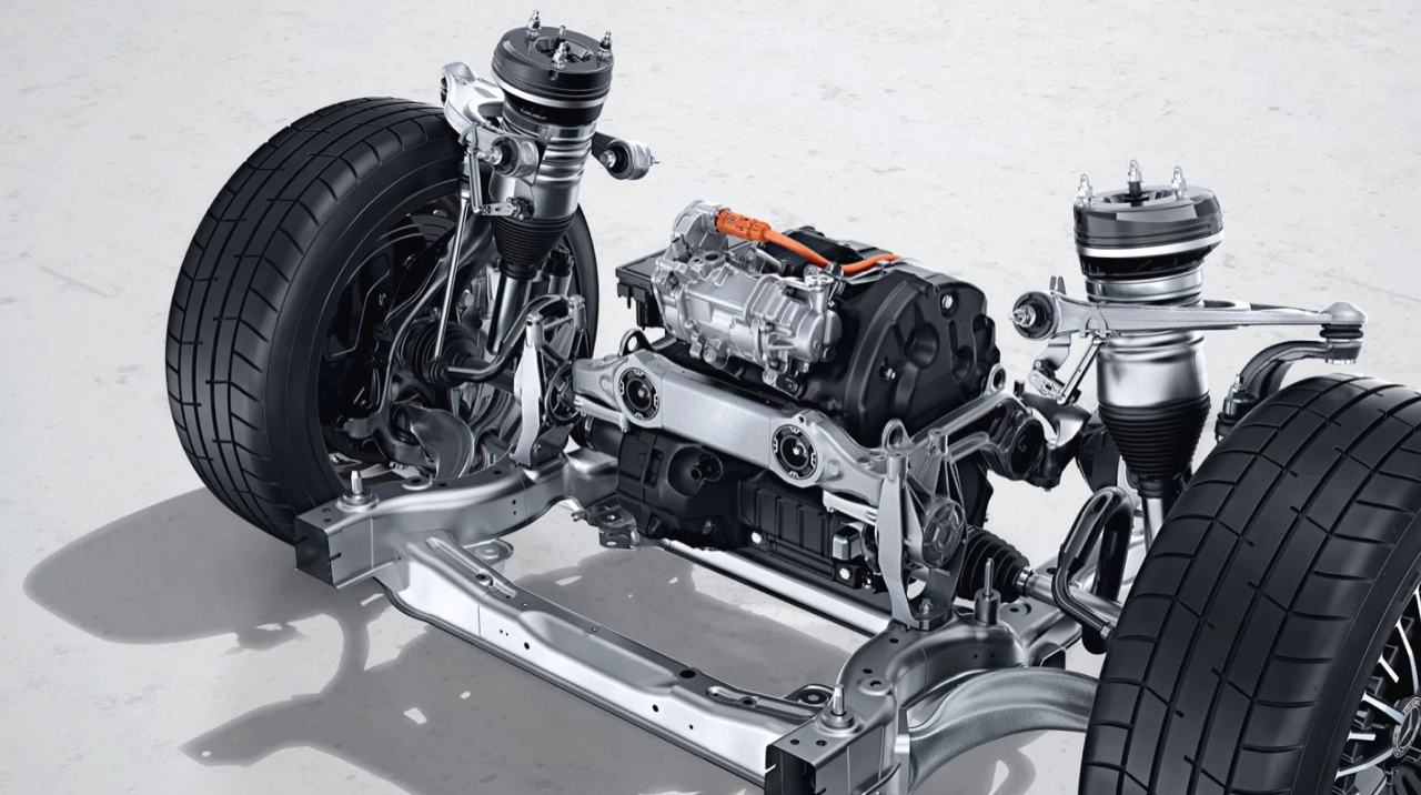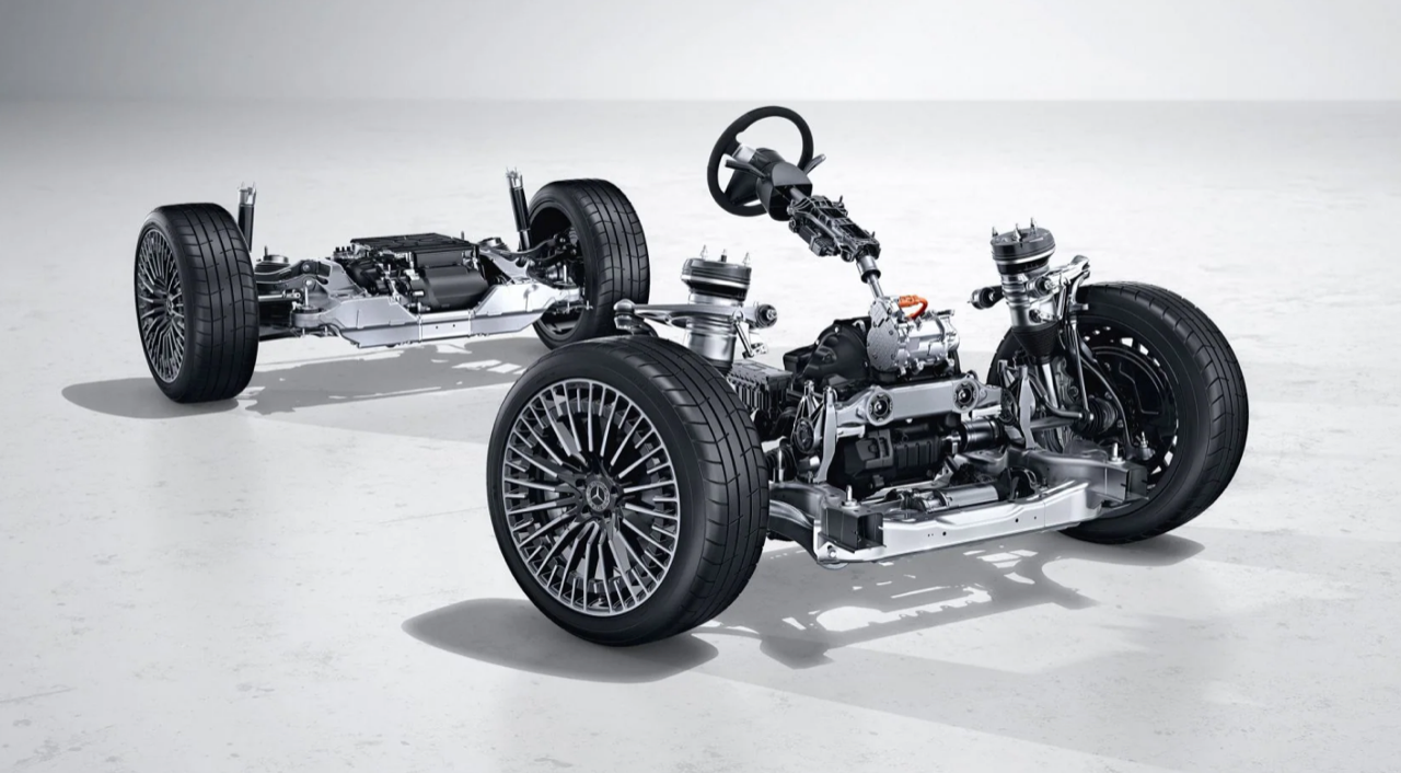 ระบบรองรับแบบ Air Matic ที่ Mercedes+EQ พัฒนาร่วมกับค่าย Bilstein เป็นช่วงล่างแบบถุงลมซึ่งเข้ามาแทนที่สปริงแบบโลหะ การทำงานขึ้นอยู่กับความหนาแน่นของลมในระบบ ถ้าระบบอัดลมมากขึ้น สปริงลมจะแข็งขึ้น และถ้าความหนาแน่นของลมน้อยลง รถก็จะนุ่มนวลขึ้น Air Matic สามารถปรับเปลี่ยนระดับความสูงของตัวรถได้สามระดับ ทั้งปรับให้สัมพันธ์ไปกับความเร็ว และโหมดของการขับเคลื่อน การปรับเปลี่ยนในลักษณะแปรผันต่อเนื่องตลอดเวลา ระบบ Air matic รุ่นใหม่ ทำงานอย่างเนียนจนคนขับและผู้โดยสารไม่สามารถรับรู้ถึงการทำงานที่ต่อเนื่องตลอดเวลา ช่วงล่างแบบถุงลม Air matic เชื่อมต่อกับ ADS+ หรือ Adaptive Damping System+ โช้คอัพถุงลมไฟฟ้าในล้อแต่ละข้าง ทำงานเป็นอิสระตามสภาพของผิวถนน ในโหมด Comfort ช่วงล่างจะปรับระดับความสูงอัตโนมัติลง 10 มิลลิเมตร เมื่อความเร็วทะยานผ่าน 120 กิโลเมตรต่อชั่วโมง โดยระบบจะปรับความสูงให้ลดลงอีก 10 มิลลิเมตร เมื่อความเร็วสูงมากกว่า 160 กิโลเมตรต่อชั่วโมง เพื่อลดแรงต้านทานอากาศและลดค่า CG เมื่อเลือกใช้โหมด Sport ระบบรองรับแบบถุงลมจะลดความสูงลงทันที 20 มิลลิเมตร ผู้ขับสามารถปรับยกความสูงเพิ่มเติมได้ 25 มิลลิเมตร เพื่อเปิดโอกาสให้ผู้โดยสารตอนหลังก้าวออกจากรถได้อย่างสะดวก และเมื่อขับใช้ความเร็วเกิน 40 กิโลเมตรต่อชั่วโมง ระบบยกความสูงจะยกเลิกการทำงานแล้วปรับเข้าสู่ความสูงที่มีความเหมาะสมกับโหมดขับเคลื่อน และสปีดความเร็วที่ใช้ในขณะนั้น