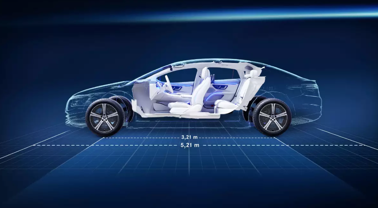 โครงสร้างของตัวถังและแชสซีเป็นแบบ Hybrid Structure มีการนำวัสดุมาผสมกันทั้งเหล็ก อะลูมิเนียมและพลาสติกสังเคราะห์ แชสซีทำจากเหล็กกล้าทนแรงเค้นสูง ส่วนประกอบอื่นบนตัวถังมีการผสมผสานกันระหว่างวัสดุน้ำหนักเบา ทั้งอะลูมิเนียมและพลาสติกรีไซเคิล เช่น ฝากระโปรงอัลลอย ทั้งหน้าและหลัง แก้มข้างกับบานประตูทั้งสี่ คานรับแรงกระแทกบริเวณด้านในของกันชนหน้าและหลัง ซัปเฟรมในจุดต่างๆ มีการเชื่อมต่ออย่างแม่นยำ หนาแน่นและแข็งแรงเพื่อลดอาการบิดตัว หากไม่สนใจในเรื่องของการเลือกวัสดุเพื่อลดน้ำหนัก คาดว่า น้ำหนักตัวของ EQS จะพุ่งจนถึง 3,000 กิโลกรัมอย่างแน่นอน เนื่องจากแบตเตอรี่มีขนาดใหญ่ ซึ่งทำให้ระยะการใช้งานไกลมากกว่า 650-700 กิโลเมตร แบตฯวางอยู่บนพื้นรถ มีน้ำหนักเฉียดๆ 1 ตันเลยทีเดียว