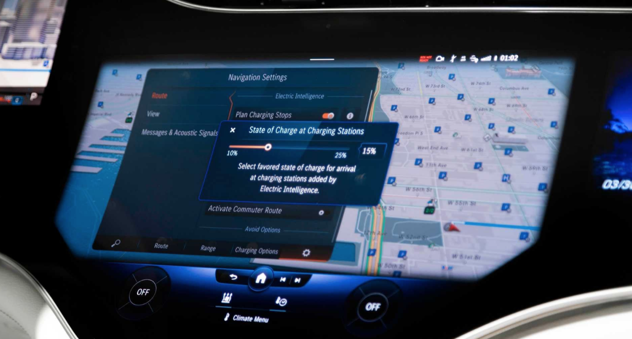 การนำทางด้วย Electric Intelligence ระบบนำทางแบบใหม่ที่ทันสมัย ทำหน้าที่วางแผนเส้นทางที่เร็วและสะดวกที่สุด รวมถึงการหยุดชาร์จโดยอิงจากปัจจัยต่างๆ ทำการคำนวณปริมาณไฟในแบตฯและตอบสนองต่อการจราจรติดขัดแบบไดนามิก หรือรูปแบบการขับที่เปลี่ยนไป คุณลักษณะเฉพาะของ EQS คือการแสดงภาพในระบบสาระบันเทิง (MBUX Mercedes-Benz User Experience) แสดงผลความจุและระดับของแบตเตอรี่ว่าเพียงพอหรือไม่ที่จะกลับไปยังจุดเริ่มต้นโดยไม่ต้องชาร์จ แสดงผลสถานีชาร์จตามเส้นทางที่ขับผ่าน การตั้งค่าในการคำนวณเส้นทาง ในขณะที่สถานีชาร์จบางสถานีสามารถเลือกหรือยกเว้นได้โดยคนขับ นอกจากนี้ ค่าใช้จ่ายในการชาร์จโดยประมาณต่อการหยุดการชาร์จจะถูกคำนวณสำหรับคนขับในการชาร์จแต่ละครั้ง