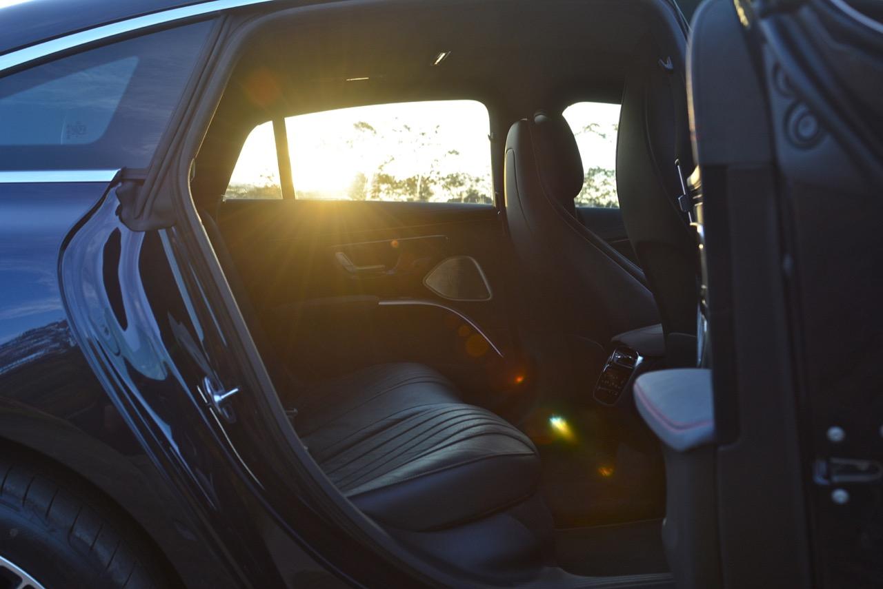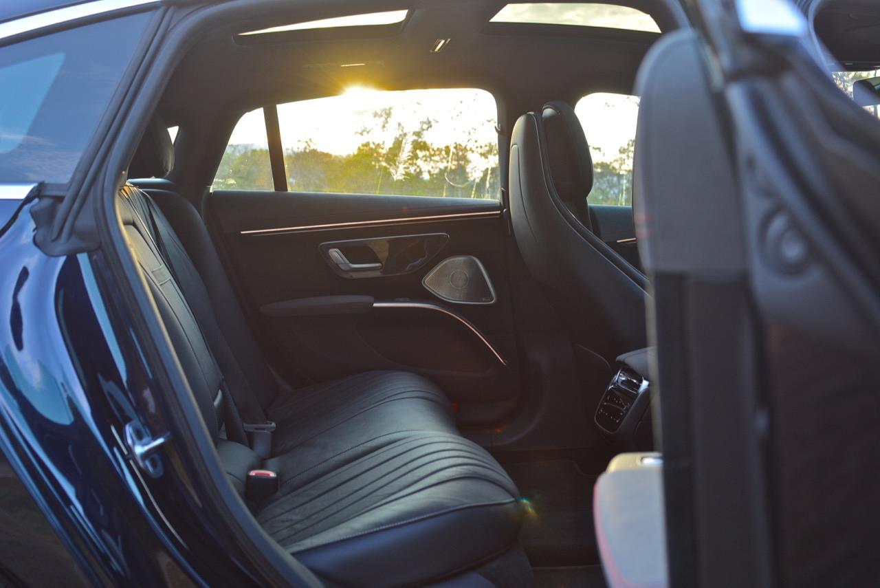 ไม่เหมือนกับ S-Class หรือคู่แข่งอย่าง e-Tron GT และ Porsche Taycan เจ้า EQS มีฝาท้ายขนาดใหญ่ที่ด้านหลังและเปิดออกได้ด้วยมุมยกที่สูงสุดๆ พื้นที่เก็บสัมภาระมีขนาดใหญ่มาก เบาะหลังพับได้เกือบราบเรียบ แม้ว่าจะมีการกระแทกเล็กน้อยเมื่อเบาะนั่งมาบรรจบกับท้ายรถ ข้อเสียอย่างหนึ่งของประตูและหลังคาซันรูฟแบบพาโนรามาก็คือ การตัดส่วนท้ายของห้องโดยสารด้านหลัง เบาะหลังของ EQS มีพื้นที่วางขาในปริมาณที่ดีและการพับเบาะแบบราบได้ก็เป็นประโยชน์ แต่ผู้โดยสารที่สูงกว่าเสาไฟฟ้าอาจพบว่ากระบาลของตัวเองเกือบจะชนกับแผงหลังคา ซึ่งเป็นสิ่งที่จะไม่เกิดขึ้นใน S-Class S580e เบาะนั่งด้านหลังแบบปรับไฟฟ้าพร้อมระบบทำความร้อน การระบายอากาศ และพนักพิงศีรษะที่นุ่มเป็นพิเศษทำให้คนนั่งรู้สึกได้ถึงความผ่อนคลาย