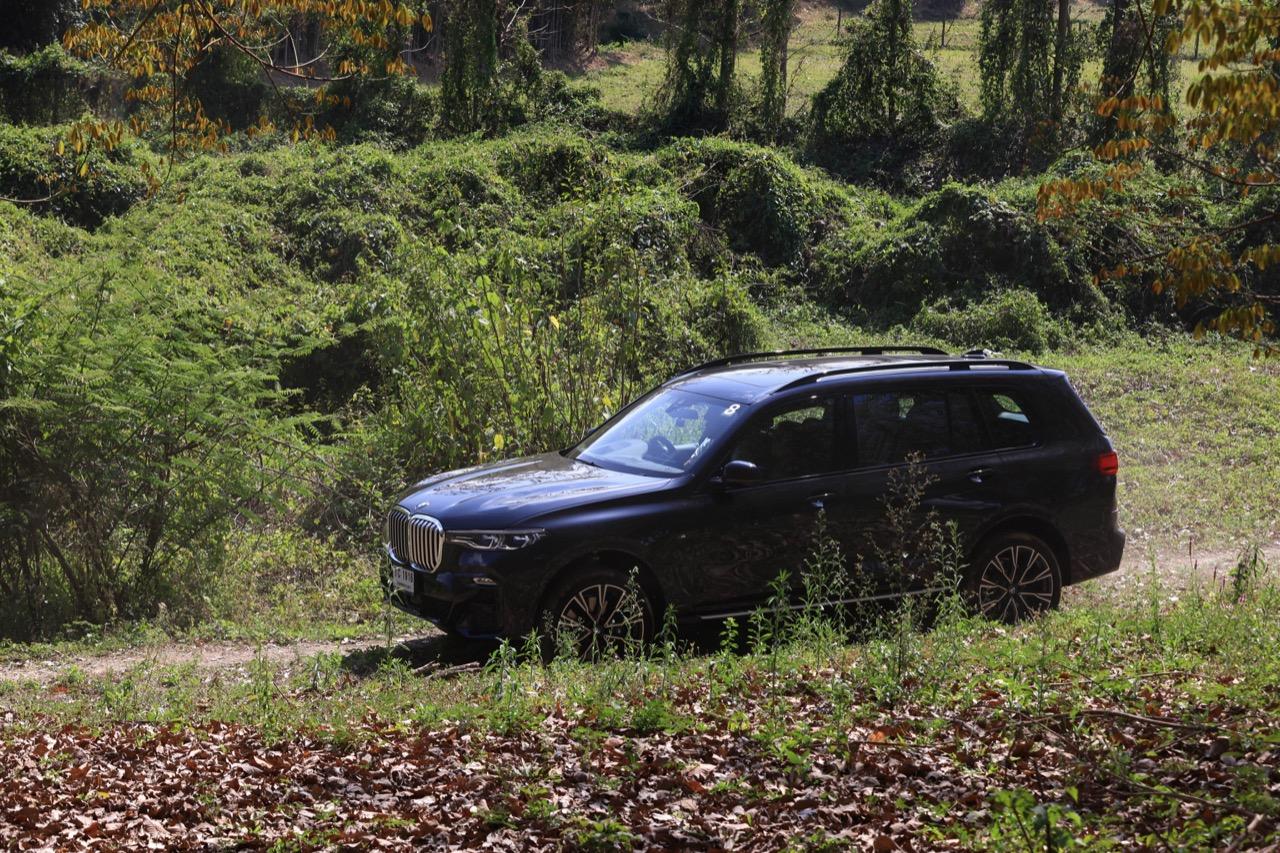 ย่านความเร็วสูงนอกเมืองและบนถนนในชนบทที่คดเคี้ยวเส้นทางจากเชียงรายขึ้นไปบนดอยช้าง ระยะทางสั้นๆ แค่ไม่ถึง 70 กิโลเมตร แต่มีโค้งขึ้นลงเขาที่สูงชันและพับไปพับมาแทบจะตลอดเส้นทาง X7 เป็นหนึ่งใน SUV ที่ถูกจัดระเบียบให้วิ่งได้เนียนที่สุดเมื่อเทียบกับรถเอสยูวียักษ์ในระดับเดียวกัน แม้จะมีขนาดใหญ่ แต่ Sport Mode ให้การตอบสนองราวกับแฮตช์แบ็กพลังสูง Adaptive เป็นโหมดที่ครอบคลุมการใช้งาน ให้ความสบายโดยซอฟต์แวร์จะปรับแต่งเครื่องยนต์ เกียร์ และช่วงล่าง รวมถึงน้ำหนักของพวงมาลัยให้อยู่ในค่ากลางๆ ที่เหมาะกับเส้นทางภูเขา แต่ผมกลับให้ความสนใจไปที่การปลดปล่อยพลังงานในรูปของแรงบิด 700 นิวตันเมตร มากกว่าความนวลเนียนของ Adaptive Mode ระบบกันสะเทือนแบบถุงลมให้ความรู้สึกแข็งกว่า GLS350d เล็กน้อยตามสไตล์ของ BMW ขับสบายเมื่อต้องลุยทางวิบาก หรือต้องไหลขึ้นลงผิวทางที่ไม่เรียบ ความเงียบของรถกับความนุ่มนวลบนทางลาดยาง คล้ายการล่องเรือบนไฮเวย์ เสียงลมและเสียงรบกวนจากยางที่บดลงไปบนถนนในย่านความเร็วต่ำแทบไม่มีเลย การเพิ่ม Driving Assistant Professional ของ BMW จะทำให้ระบบเร่งความเร็ว เบรก และบังคับให้รถอยู่ในเลนถือเป็นการขับที่ผ่อนคลายมากจนเกินไป ความสบายของระบบช่วยขับทำให้นักขับหลายคนติดใจ แต่ขอควบคุมรถเองในโหมดสูงสุดแล้วปล่อยให้รถสำแดงประสิทธิภาพที่แท้จริงออกมาในระหว่างการขับทดสอบสั้นๆ ดูจะดีกว่าไปยึดติดกับความสบายที่พยายามมอบให้คุณอยู่ตลอดเวลา