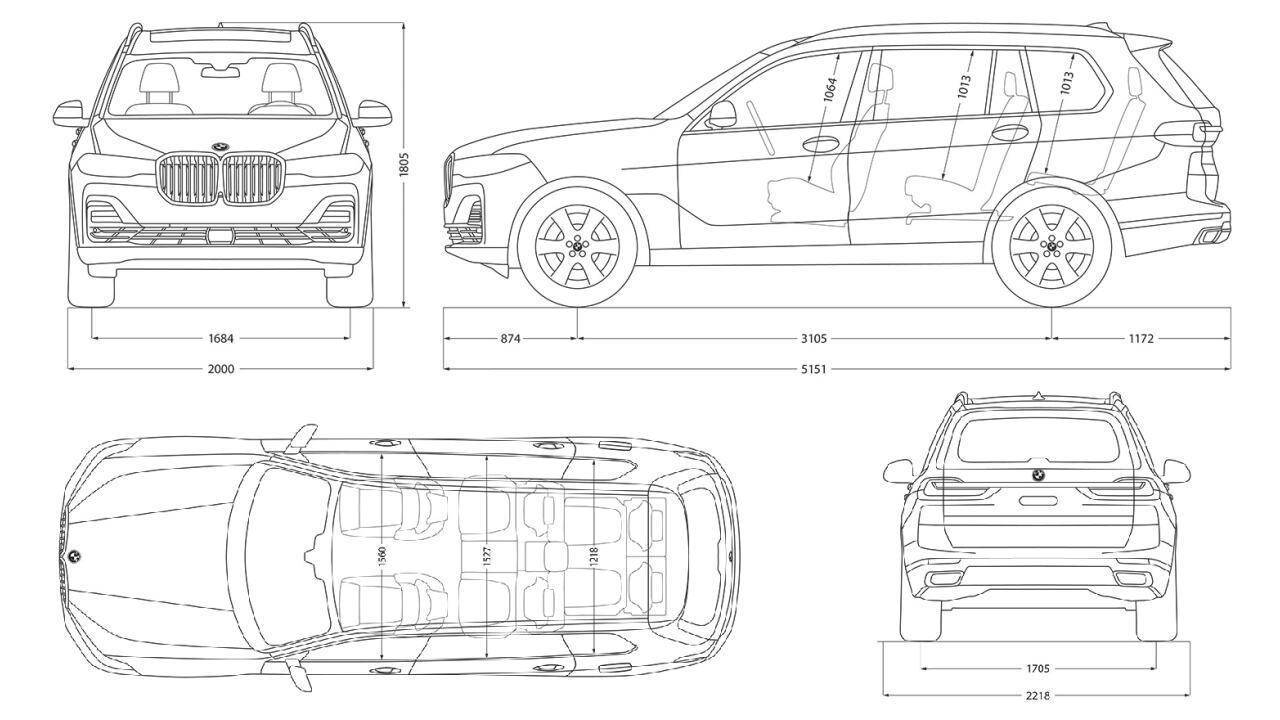มิติตัวถังของ BMW X7 xDRIVE 40d M Sport มีความยาว 5,151 มิลลิเมตร กว้าง 2,000 มิลลิเมตร สูง 1,805 มิลลิเมตร ความยาวฐานล้อ 3,105 มิลลิเมตร ระยะห่างล้อหน้า 1,684 มิลลิเมตร ระยะห่างล้อหลัง 1,705 มิลลิเมตร ระยะโอเวอร์แฮงก์หน้า 874 มิลลิเมตร ระยะโอเวอร์แฮงก์หลัง 1,172 มิลลิเมตร BMW X7 (G07) 40d (340 Hp) xDrive MHEV Steptronic น้ำหนักมากถึง 2,470 กิโลกรัม พื้นที่เก็บสัมภาระ 750 ลิตร เมื่อยังไม่พับเบาะแถว 2-3 และเมื่อพับเบาะสองแถว พื้นที่จะเพิ่มเป็น 1,050 ลิตร