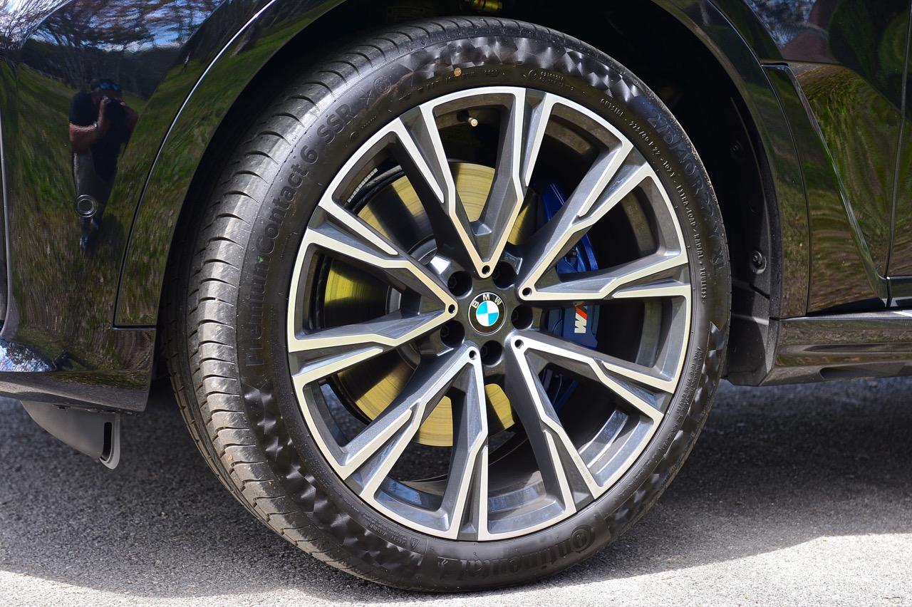 ดีไซน์ภายนอก ด้วยรูปทรงที่ใหญ่โต แต่กลับมีความสง่างามและดุดัน X7 xDrive 40d M Sport ใหม่ ถ่ายทอดเรือนร่างตั้งแต่ยังเป็นรถต้นแบบในงาน IAA Motor Show 2017 ที่เมืองแฟรงค์เฟิร์ต ผ่านปรัชญาการออกแบบที่ล้ำสมัยและเป็นเอกลักษณ์ เสริมรูปลักษณ์สปอร์ตด้วยชุดแต่ง M Sport รอบคัน เช่นกันชนหน้า-หลัง กาบบันได อุปกรณ์ตกแต่งพวกเบรก M performance แบบ 4 พอตหน้า ระบบท่อไอเสีย M Sport มอบเสียงเครื่องยนต์กังวาน สอดประสานกับพละกำลังและความสง่างามของตัวรถ และเติมบุคลิกความแรงอย่างลงตัวด้วยล้อ M ขนาดใหญ่ ขอบ 22 นิ้ว ลาย Y-spoke แบบสลับสี ล้อหน้า 9.5 J x 22 ยาง continental premium contact 6 ไซส์ 275/40 R22 Y XL ล้อหลัง 10.5 J x 22 ยาง continental premium contact 6 ไซส์ 315/35 R22