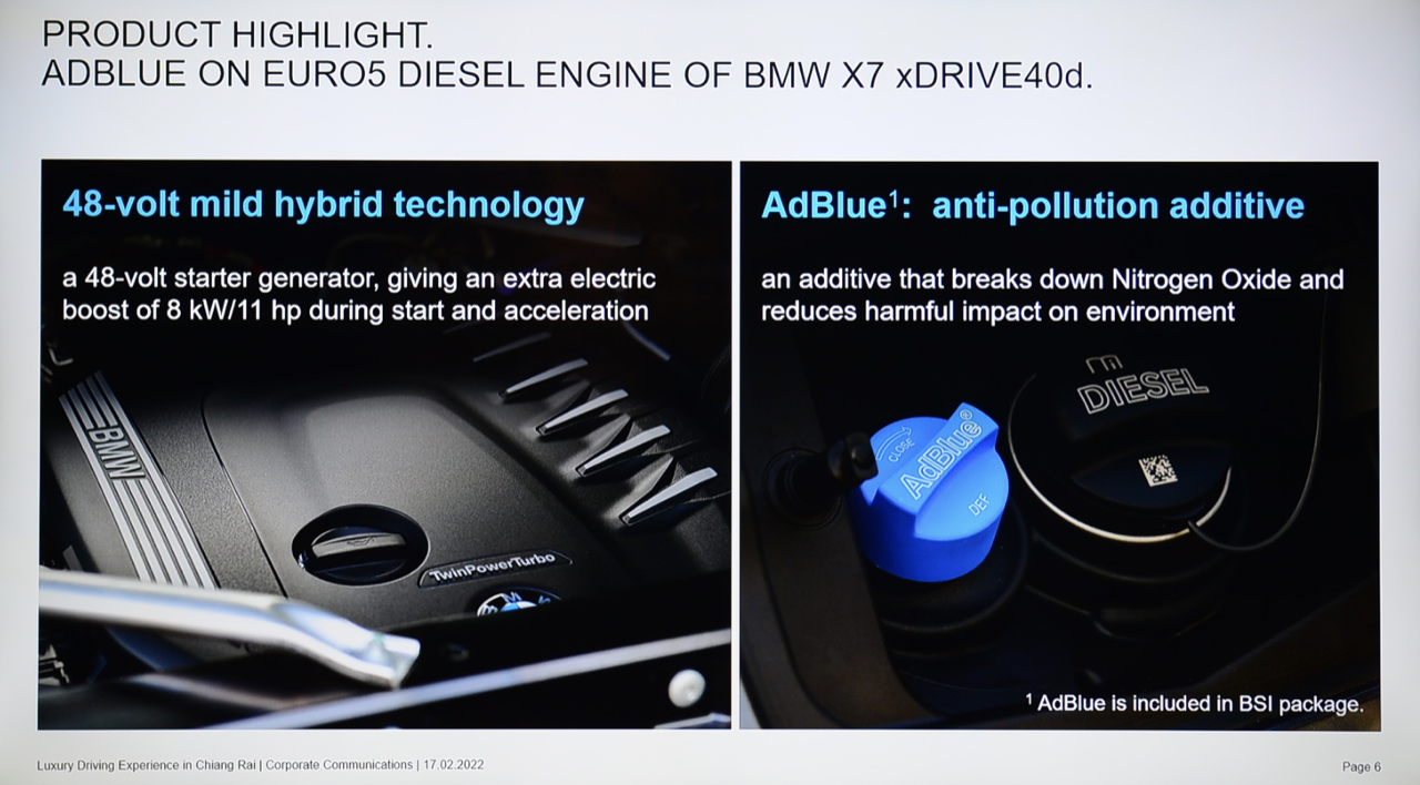 X7 xDrive 40d M Sport ใหม่ ยังเป็นรถยนต์รุ่นแรกที่ประกอบขึ้น ที่โรงงาน BMW Manufacturing (Thailand) co. ltd ในจังหวัดระยอง เป็นรถยนต์อเนกประสงค์แบบฟูลไซส์ พร้อมเทคโนโลยี Mild Hybrid ขนาด 48 โวลต์ ทำงานร่วมกับเครื่องยนต์ดีเซล ผ่านมาตรฐานยูโร 5 รองรับสารเติมแต่ง AdBlue ช่วยลดการปล่อยมลพิษได้มากกว่าเครื่องยนต์ดีเซลทั่วไป ระบบ Mild Hybrid ใช้การทำงานของมอเตอร์ไฟฟ้า มีกำลังไฟขนาด 48 โวลต์ มาช่วยเสริมพละกำลังการขับเคลื่อนของเครื่องยนต์เพิ่มขึ้นอีกถึง 8 กิโลวัตต์ / 11 แรงม้า โดยเฉพาะในช่วงออกตัวและจังหวะของการเร่งความเร็วไม่ว่าจะเพื่อการแซงหรือเป็นการออกตัวอย่างรวดเร็วจากจุดหยุดนิ่ง เครื่องยนต์ดีเซลรุ่นใหม่ล่าสุด ถูกปรับปรุงทั้งระบบอัดอากาศ ระบบฉีดจ่ายเชื้อเพลิง การตอบสนองตามโหมดต่างๆ เครื่องยนต์ดีเซลแถวเรียง 3.0 ลิตร ทวินเทอร์โบ สามารถลดไนโตรเจนออกไซด์ในไอเสียด้วยสาร AdBlue ระบบ Mild Hybrid 48 โวลต์ ทำให้ X7 xDRIVE 40d มีน้ำหนักเครื่องยนต์ที่ลดลง