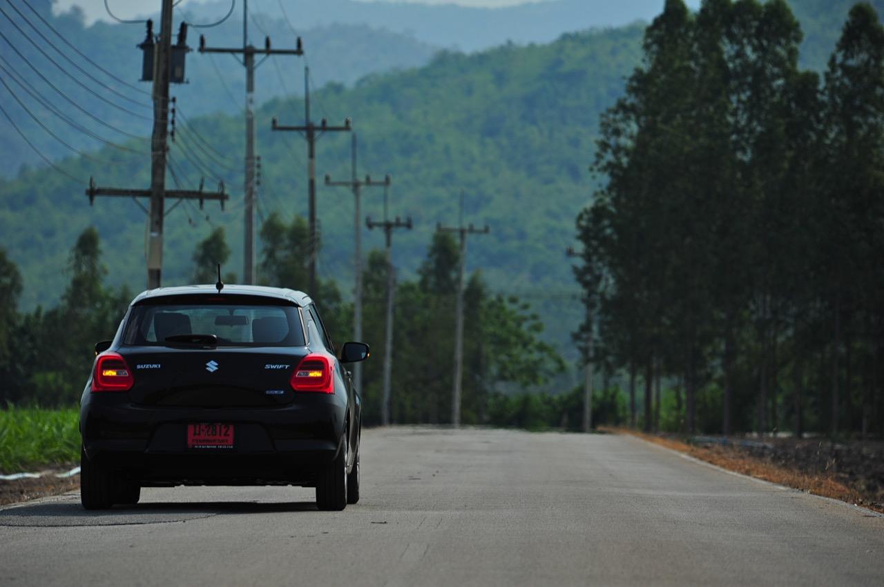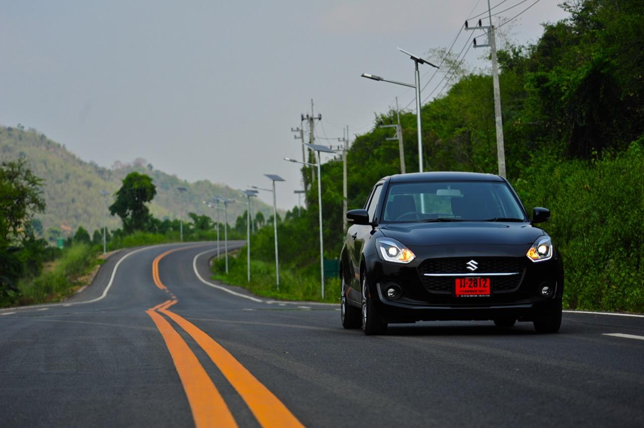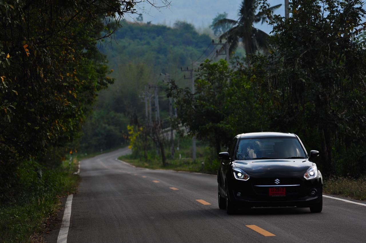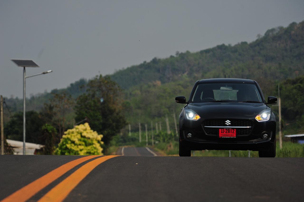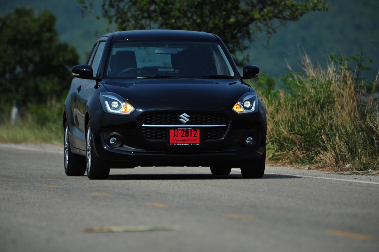 ออกทางไกล ลากไปทดสอบกันถึงอำเภอหนองปรือ ในจังหวัดกาญจนบุรี ระบบรองรับของ Swift หน้าเป็นแมคเฟอร์สัน สตรัท สปริง โช้คอัพและกันโคลง ส่วนช่วงล่างหลังเป็นแบบทอร์ชันบีมคานแข็ง การปรับเซตช่วงล่างให้ความรู้สึกดี กระชับและนิ่มนวลในเมือง ขับเร็วๆ ก็ยังเกาะถนน อาการร่อนหรือโคลงเมื่อหวดกันหนักๆน้อยจนทำให้มั่นใจแม้จะมีขนาดเล็ก ระยะยืดและยุบตัวที่มากไปนิดของโช้คอัพ ควรระวังรอยต่อพวกคอสะพานหรือที่กั้นถนนเพื่อลดความเร็ว ขับทางไกลช่วงล่างให้ความสบายตัว ซึมซับแรงสั่นสะเทือนได้ดีพอๆ กับ Mazda 2 1.3 ล้ออัลลอยขอบ 16 นิ้ว ยัดยาง 185/55R16 เป็นยางหน้าแคบที่เน้นลดอัตราสิ้นเปลือง เจ้าของบางคนอาจมองว่าเล็กเกินไป ชอบยางไซส์ 195 หรือ 205 มากกว่า เนื่องจากชอบการยึดเกาะแบบหนึบๆ เมื่อเปลี่ยนยางให้มีหน้าสัมผัสใหญ่ขึ้น การยึดเกาะกับผิวถนนก็จะเพิ่มขึ้น แต่แลกกลับด้วยอัตราสิ้นเปลืองที่ลดลง หรือพูดกันตรงๆ ก็คือมันจะกินน้ำมันมากขึ้นอีกนิด บางคนก็เอาไปใส่โช้คและสปริงที่มีคุณภาพดีกว่าของโรงงาน โดยพยายามรักษาขนาดของล้อเอาไว้ไม่ให้ใหญ่เกินไป ปรากฏว่าวิ่งในโค้งดีกว่าเดิมแต่ก็จะมีอาการกระด้างอยู่บ้าง เนื่องจากโช้คเดิม เซตค่ามากลางๆ ให้ขับเร็วได้มั่นใจและวิ่งนุ่มนวลพอได้