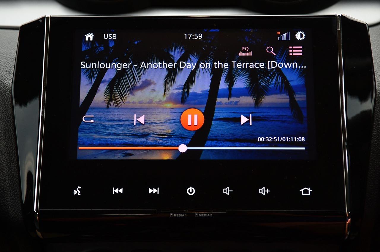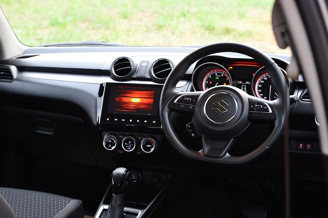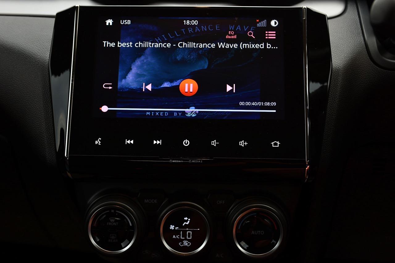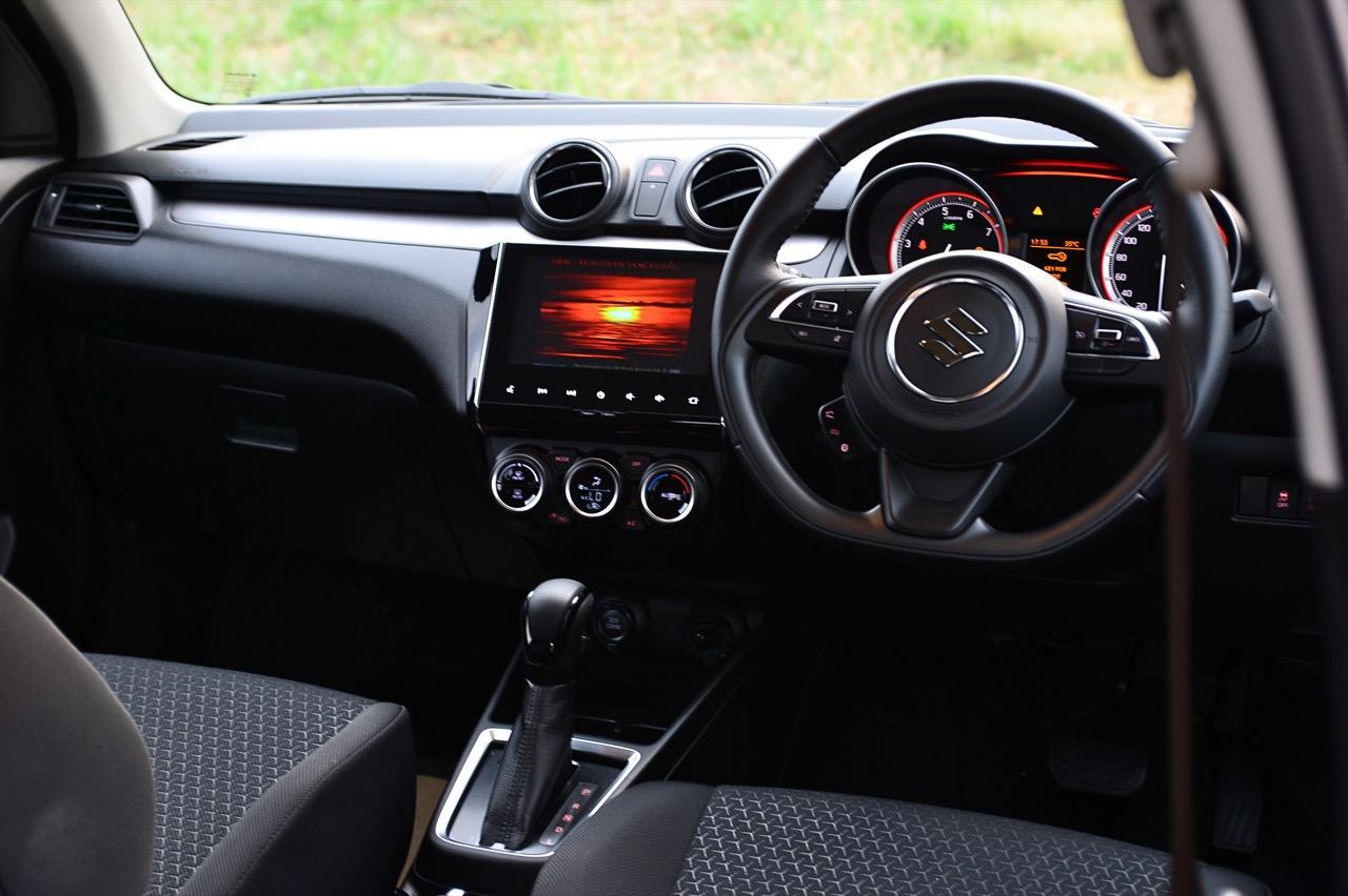 งานตกแต่งภายในที่ทันสมัยน่าใช้งานของ Suzuki SWIFT GLX จัดอุปกรณ์อำนวยความสะดวกมาให้ใช้งานเยอะพอสมควร จอภาพมอนิเตอร์ระบบสัมผัสขนาด 8 นิ้ว มีฟังก์ชันกล้องมองหลังพร้อมเส้นระนาบในการกะระยะที่คมชัดใช้ได้ จอภาพควบรวมถึงการต่อเชื่อม AUX-USB iPOD MP3 WMA Bluetooth รองรับ apple carplay และ android auto ที่จัดมาให้ครบพร้อม ช่องจ่ายไฟ 12 V สำหรับการชาร์จอุปกรณ์ต่างๆ หากไม่ชอบใช้งานจอภาพก็เลือก Swift รุ่น GL ไปเลยจะประหยัดเงินได้หลายหมื่น แต่ถ้าอยากได้จอภาพพร้อมระบบนำทางเนวิเกเตอร์ที่เปิดใช้งานผ่าน apple carplay ก็ต้องเลือกรุ่น GLX กล้องมองหลังที่ติดมาให้ เพิ่มความปลอดภัยเวลาขับถอยหลัง ส่วนฟังก์ชันต่างๆ ที่ใส่มาให้ในจอภาพระบบสัมผัสก็มีความครอบคลุมในการใช้งาน เครื่องเสียงลำโพงมีคุณภาพพอใช้ได้ ฟังก์ชันปรับเสียง ทำให้เสียงเพลงที่เล่นผ่านอุปกรณ์ต่างๆ ใช้ได้เลยทีเดียว แต่ถ้าอยากให้คมชัดและกระหึ่มมากกว่าของเดิมจากโรงงานก็ต้องดิ้นรนไปร้านเครื่องเสียงเพื่ออัปเกรดกันเอาเอง