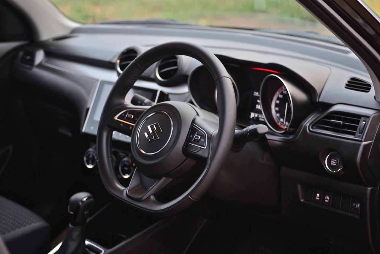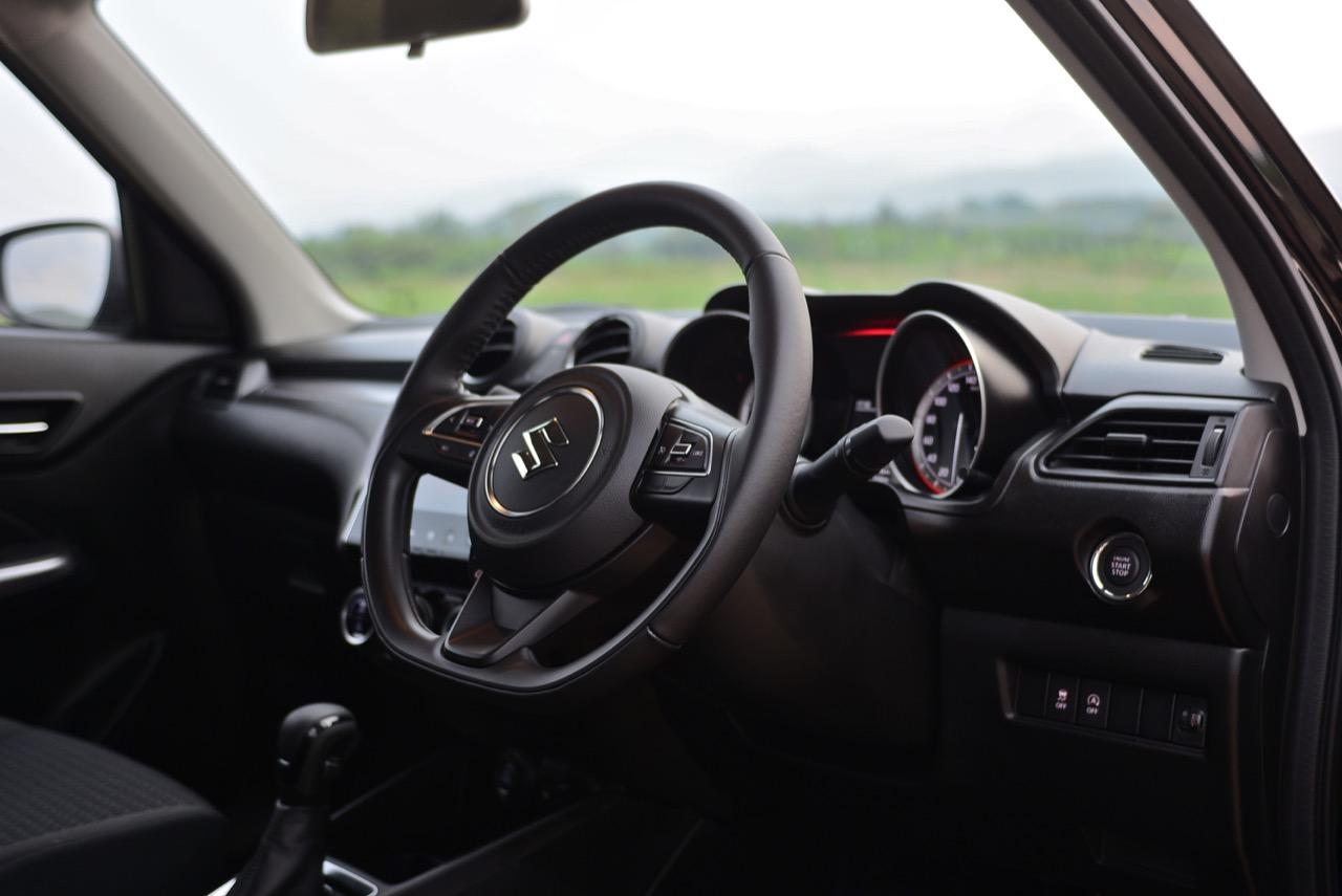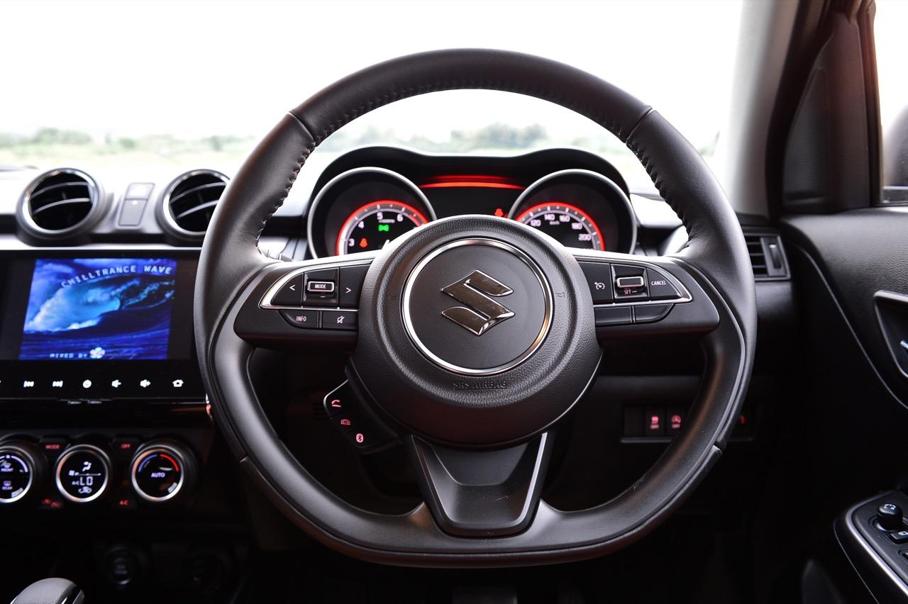 พวงมาลัยของ Swift 1.2 GLX CVT ออกแบบใหม่หมดโดยใช้รูปทรงและวัสดุที่ดีขึ้น พวงมาลัยทรงสามก้านแบบฐานตัดหรือ D-shape หุ้มหนังแท้ ก้านพวงมาลัยด้านซ้ายมีสวิตช์ปรับตั้งความเร็วอัตโนมัติ Cruise Control ก้านวงด้านซ้ายติดตั้งสวิตช์สั่งงานระบบเครื่องเสียง รวมถึงปุ่มรับหรือวางสายโทรศัพท์บลูทูธ แม้จะยังไม่มีแป้นเปลี่ยนเกียร์เหมือน Swift RX II เจเนอเรชันที่ 2 แต่ปุ่มแตรทรงกลมกับพวงมาลัยฐานตัดนั้นทำออกมาได้สวยงามน่าใช้งาน พวงมาลัยของ Swift GLX CVT ออกแบบให้สามารถปรับได้ 4 ทิศทาง เช่น ปรับระดับความสูง-ต่ำ หรือปรับระยะใกล้-ไกลของพวงมาลัยให้ครอบคลุมสรีระของคนขับ รูปทรงของพวงมาลัยและวัสดุที่ใช้ถือว่าทำออกมาได้ดี