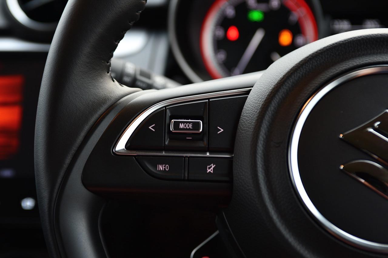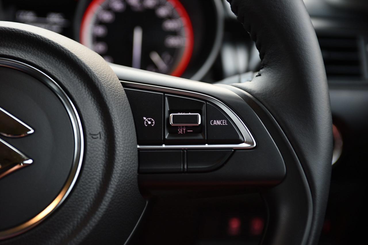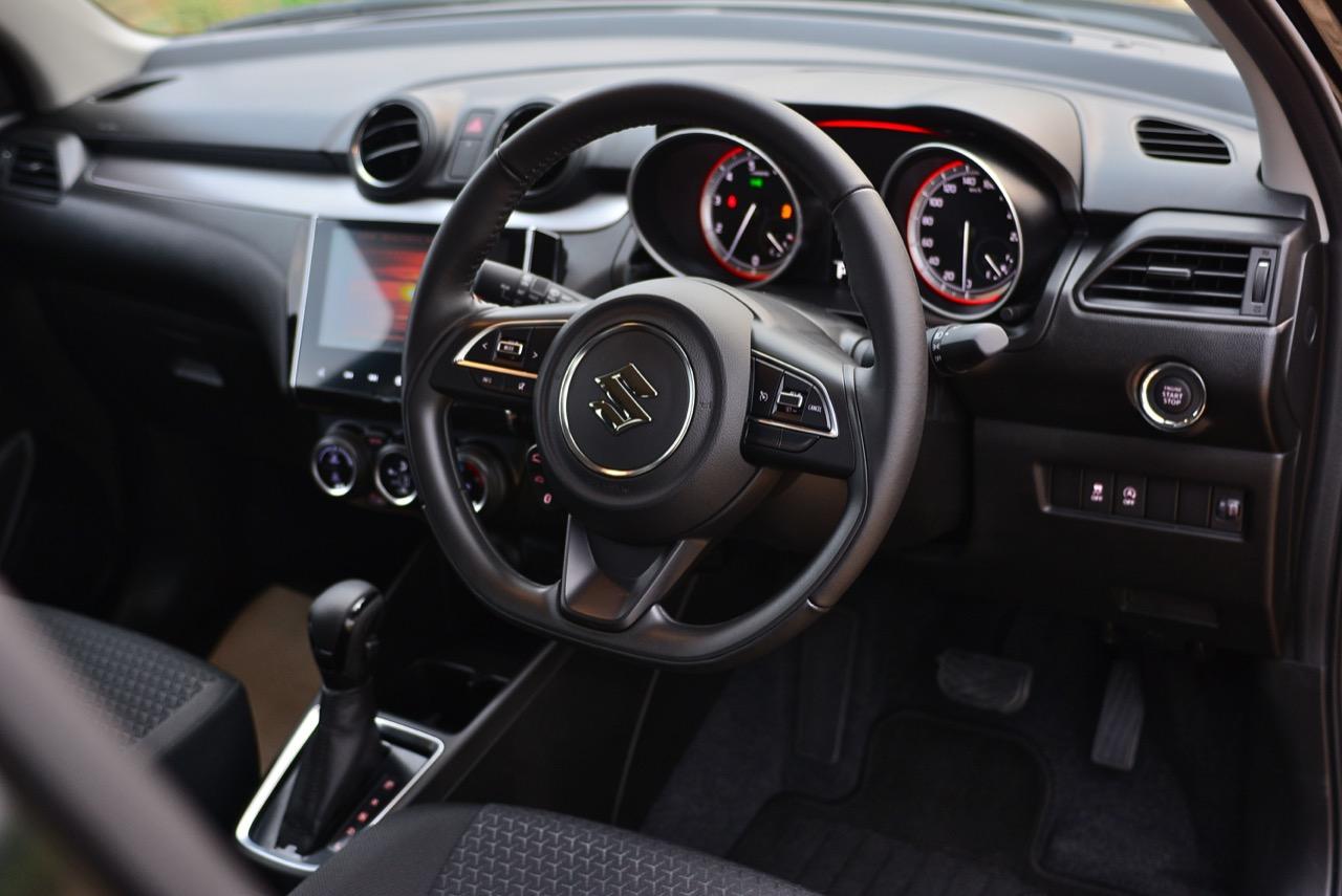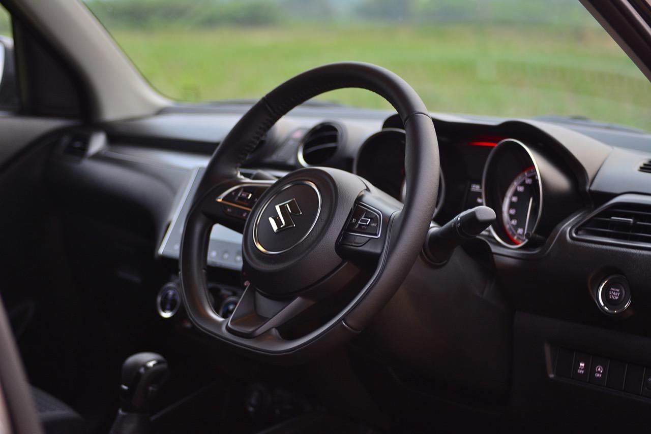 พวงมาลัยของ Swift 1.2 GLX CVT ออกแบบใหม่หมดโดยใช้รูปทรงและวัสดุที่ดีขึ้น พวงมาลัยทรงสามก้านแบบฐานตัดหรือ D-shape หุ้มหนังแท้ ก้านพวงมาลัยด้านซ้ายมีสวิตช์ปรับตั้งความเร็วอัตโนมัติ Cruise Control ก้านวงด้านซ้ายติดตั้งสวิตช์สั่งงานระบบเครื่องเสียง รวมถึงปุ่มรับหรือวางสายโทรศัพท์บลูทูธ แม้จะยังไม่มีแป้นเปลี่ยนเกียร์เหมือน Swift RX II เจเนอเรชันที่ 2 แต่ปุ่มแตรทรงกลมกับพวงมาลัยฐานตัดนั้นทำออกมาได้สวยงามน่าใช้งาน พวงมาลัยของ Swift GLX CVT ออกแบบให้สามารถปรับได้ 4 ทิศทาง เช่น ปรับระดับความสูง-ต่ำ หรือปรับระยะใกล้-ไกลของพวงมาลัยให้ครอบคลุมสรีระของคนขับ รูปทรงของพวงมาลัยและวัสดุที่ใช้ถือว่าทำออกมาได้ดี