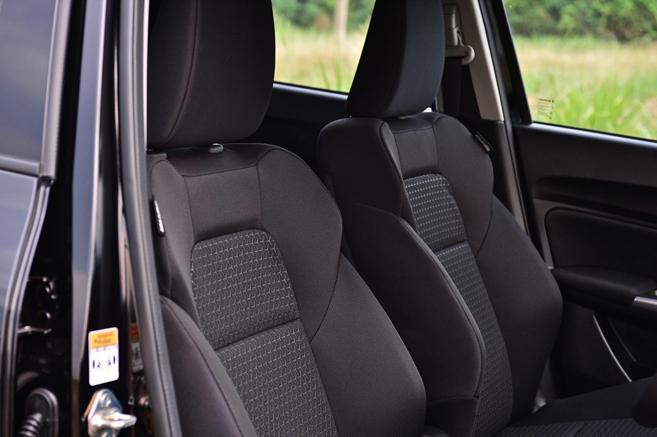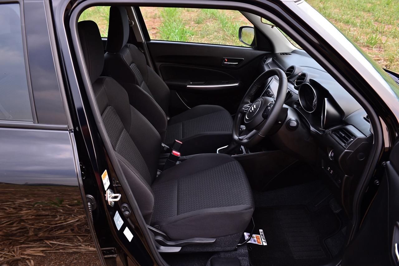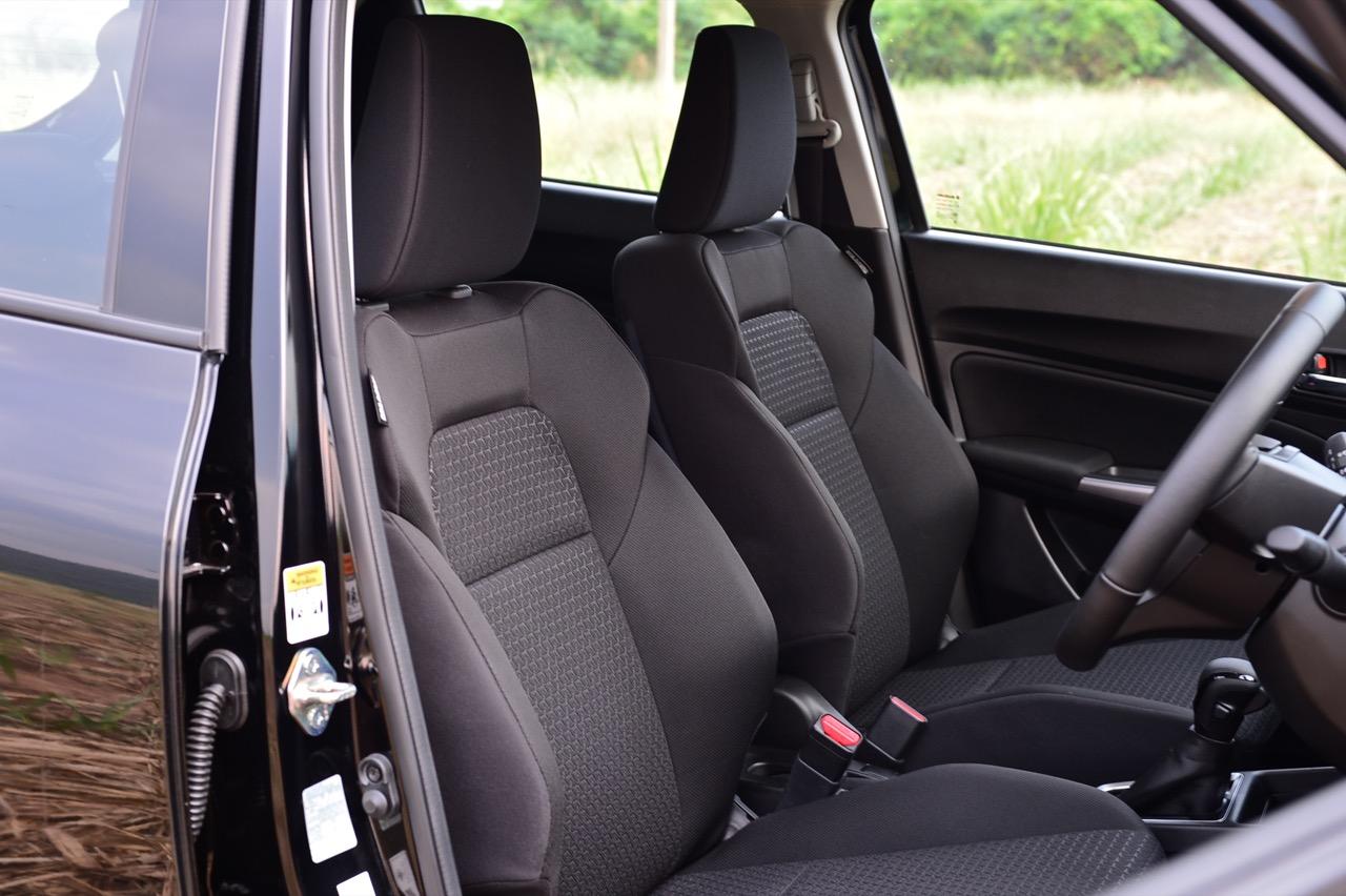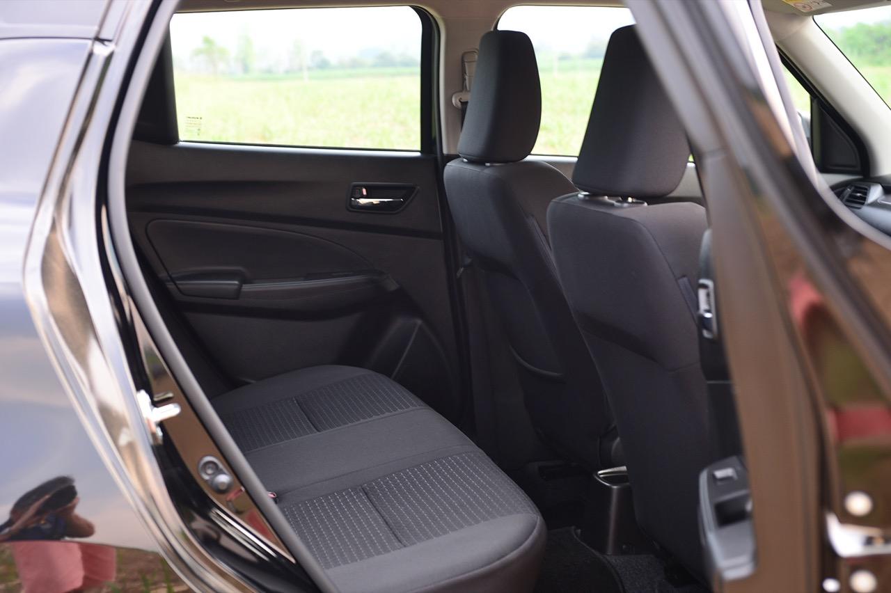 เบาะนั่งของ Swift GLX สอดรับกับสรีระได้ดี เบาะหุ้มด้วยผ้าสีดำ มีลวดลายแฉกเล็กๆ ที่ทำให้ดูแปลกตา เบาะคู่หน้าปรับด้วยมือ เบาะหลังปรับพับแบบแยกกันได้สองส่วน พื้นที่ของเบาะหลัง แม้จะเป็นถขนาดเล็ก เมื่อลองนั่งดูก็พบว่าไม่ได้ทำให้รู้สึกอึดอัดแต่อย่างใด การใช้งานรถเล็กที่ส่วนใหญ่มักจะขับไปไหนมาไหนคนเดียว แต่ถ้าต้องขนผู้โดยสารอีก 3-4 คนก็ยังสามารถทำได้ แม้จะไม่สบายตัวเพราะต้องนั่งเบียดกัน แต่ก็ยังดีกว่านั่งไม่ได้ พื้นที่วางเท้ากับพื้นที่เหนือศีรษะของเบาะผู้โดยสารตอนหลัง การออกแบบที่เน้นความโปร่งโล่ง ทำให้ผู้โดยสารที่เบาะหลังสองตำแหน่งนั่งโดยสารทางไกลได้โดยไม่สร้างปัญหาเมื่อยเนื้อปวดตัวเท่าไหร่นัก ทรงของเบาะคู่หน้าแบบสปอร์ตมีความสวยงามน่าใช้ แต่วัสดุพวกผ้าสีดำที่ใช้หุ้มต้องมีการใส่ใจดูแลเรื่องความสะอาดมากกว่าเบาะหนัง เบาะคนขับสามารถกดปรับลงต่ำได้มากกว่ารุ่นที่แล้วเล็กน้อย ส่วนเบาะผู้โดยสารตอนหลัง ปรับพับได้ 60:40 เพื่อเพิ่มพื้นที่ในการขนสัมภาระ เบาะหลังแม้จะออกแบบให้นั่งได้สามคนพร้อมเข็มขัดนิรภัย 3 ตำแหน่ง แต่คนนั่งตรงกลางต้องเป็นเด็กเล็กเท่านั้น หากเป็นผู้ใหญ่มานั่งมีหวังได้เมื่อยกันน่าดู เบาะหลังสำหรับผู้ใหญ่ที่ออกแบบให้นั่งได้สบายขึ้น เนื่องจากความลาดเอนของเบาะหลังนั้นมากกว่ารุ่นที่แล้วซึ่งตั้งชันมากจนนั่งไม่ค่อยจะสบายตัวเท่าที่ควร