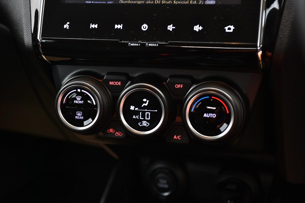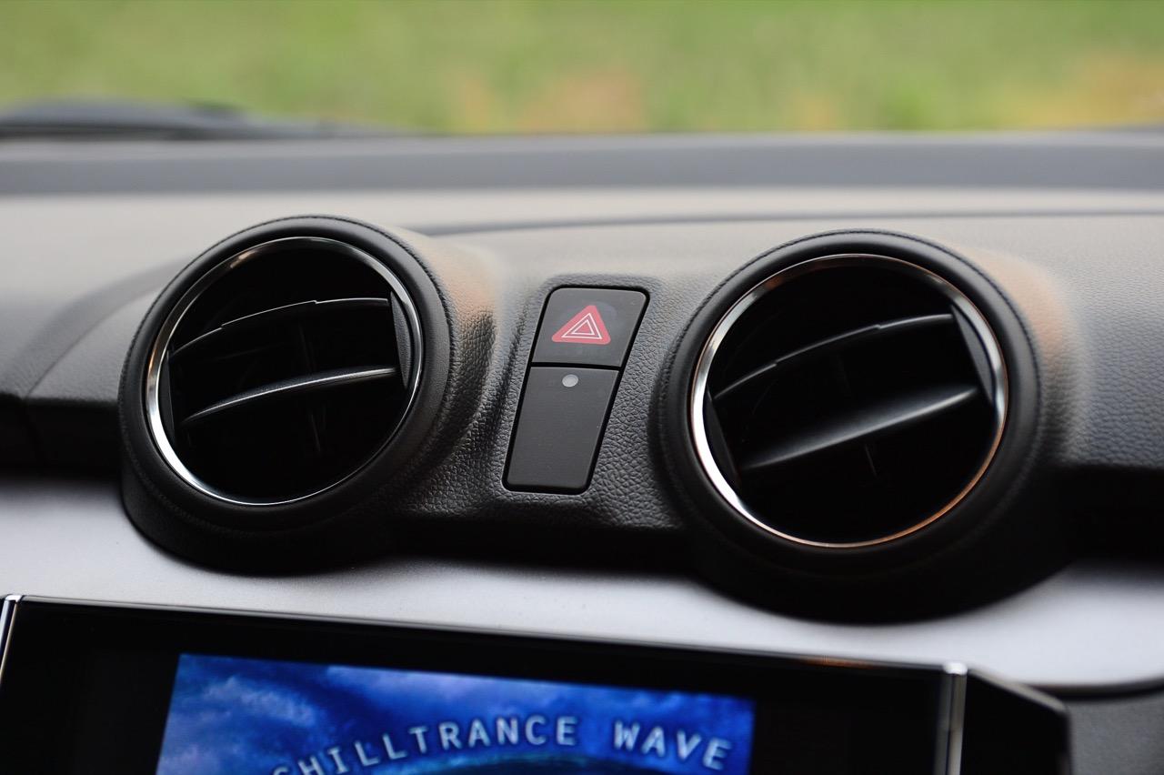 แผงควบคุมอุณหภูมิภายในห้องโดยสารสวยงามน่าใช้ งานตกแต่งภายในของ Swift มีดีไซน์ที่ทันสมัย วัสดุพวกพลาสติก ผ้าและหนังสังเคราะห์ มีผิวสัมผัสที่ไม่แย่จนเกินไป แม้จะมีราคาแค่ 6 แสนบาท แต่วัสดุภายในไม่ได้ดูแย่เหมือนรถบางยี่ห้อ โดยเฉพาะพลาสติกภายในนั้นถือว่าทำออกมาดูดีมีราคา แผงคอนโซลคาดกลางด้วยพลาสติกสีขาว ส่วนชุดควบคุมอุณหภูมิออกแบบให้เป็นสวิตช์ทรงกลมที่ใช้ปรับตั้งระดับความแรงของพัดลมแอร์ สวิตช์ควบคุมทิศทางของพัดลมแอร์ และสวิตช์เพิ่มหรือลดน้ำยาแอร์ กึ่งกลางของแผงควบคุมอุณหภูมิใช้จอภาพทรงกลมเล็กๆ เป็นหน้าจอดิจิทัลคอยแจ้งเตือนการทำงานของระบบปรับอากาศในห้องโดยสาร ระบบแอร์ของ Swift GLX มีแผงกรองฝุ่นขนาดเล็กติดตั้งมาให้ใช้งาน