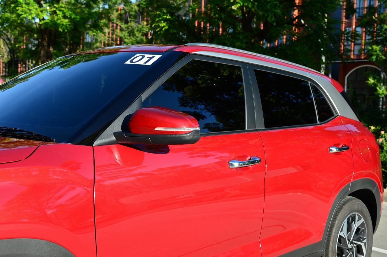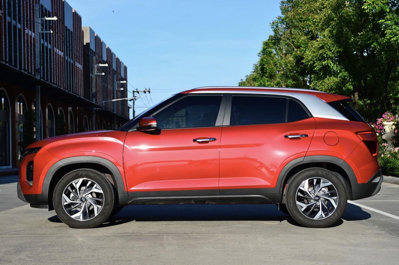 ด้านข้างจะสังเกตเห็นเสาหน้าที่ค่อนข้างตั้งชันมากกว่ารถคู่แข่ง กระจกมองข้างมีไฟเลี้ยวที่ออกแบบรูปทรงเชื่อมโยงกับไฟท้ายแบบบูมเมอแรง ด้านข้างจากแนวของเสาหน้าไล่ไปจนถึงเสาท้ายใช้สีเงินตัดกับตัวถังสีแดง มือจับที่เปิดบานประตูโครเมี่ยม ขอบซุ้มล้อติดตั้งพลาสติกกันกระแทกสีดำสไตล์เอสยูวี ล้ออัลลอย Diamond cut ขนาด 17 นิ้ว ยาง kumho solus HS63 ไซล์ 215/60/R17 96H ฝาถังเชื้อเพลิงทรงกลม มิติตัวถังของ Hyundai Creta SEL มีขนาดความยาว 4,315 มิลลิเมตร กว้าง 1,790 มิลลิเมตร สูง 1,630 มิลลิเมตร ความยาวฐานล้อ 2,610 มิลลิเมตร ความสูงจากพื้นถึงใต้ท้องรถ 200 มิลลิเมตร ระยะห่างล้อหน้า 1,572 มิลลิเมตร ระยะห่างล้อหลัง 1,576 มิลลิเมตร น้ำหนัก 1,150 กิโลกรัม ความจุถังเชื้อเพลิง 40 ลิตร