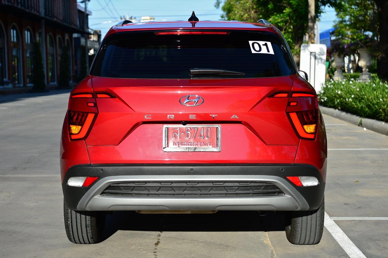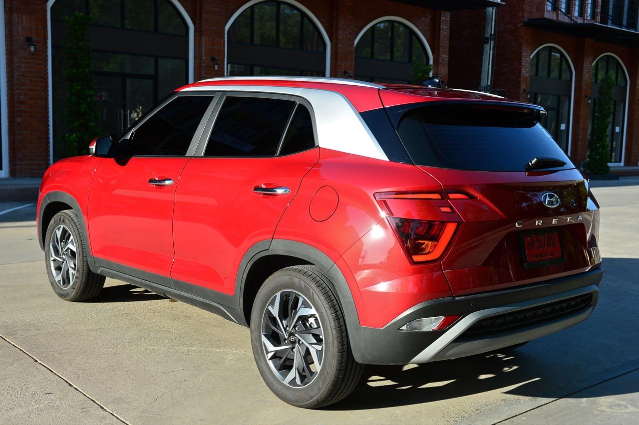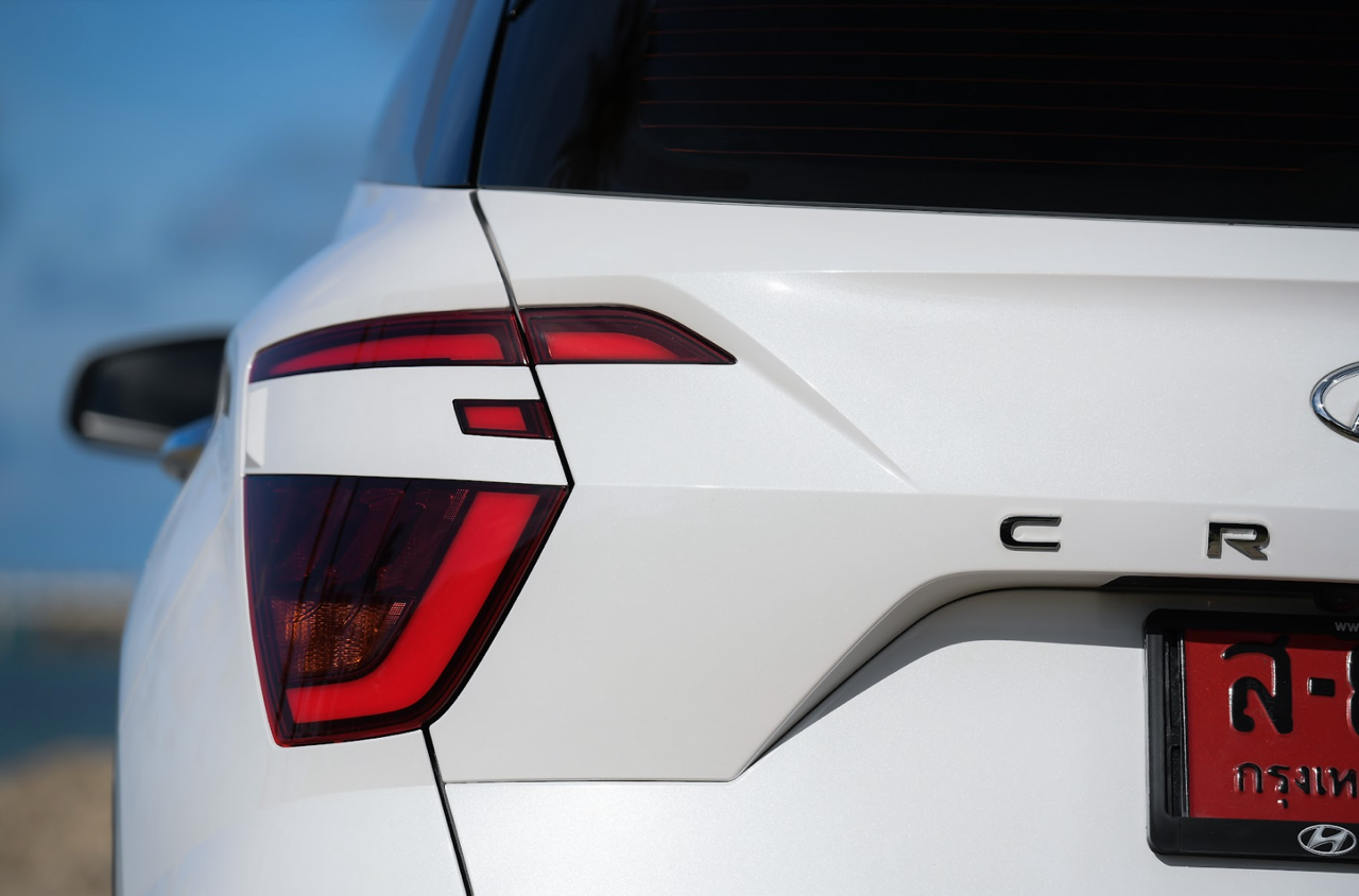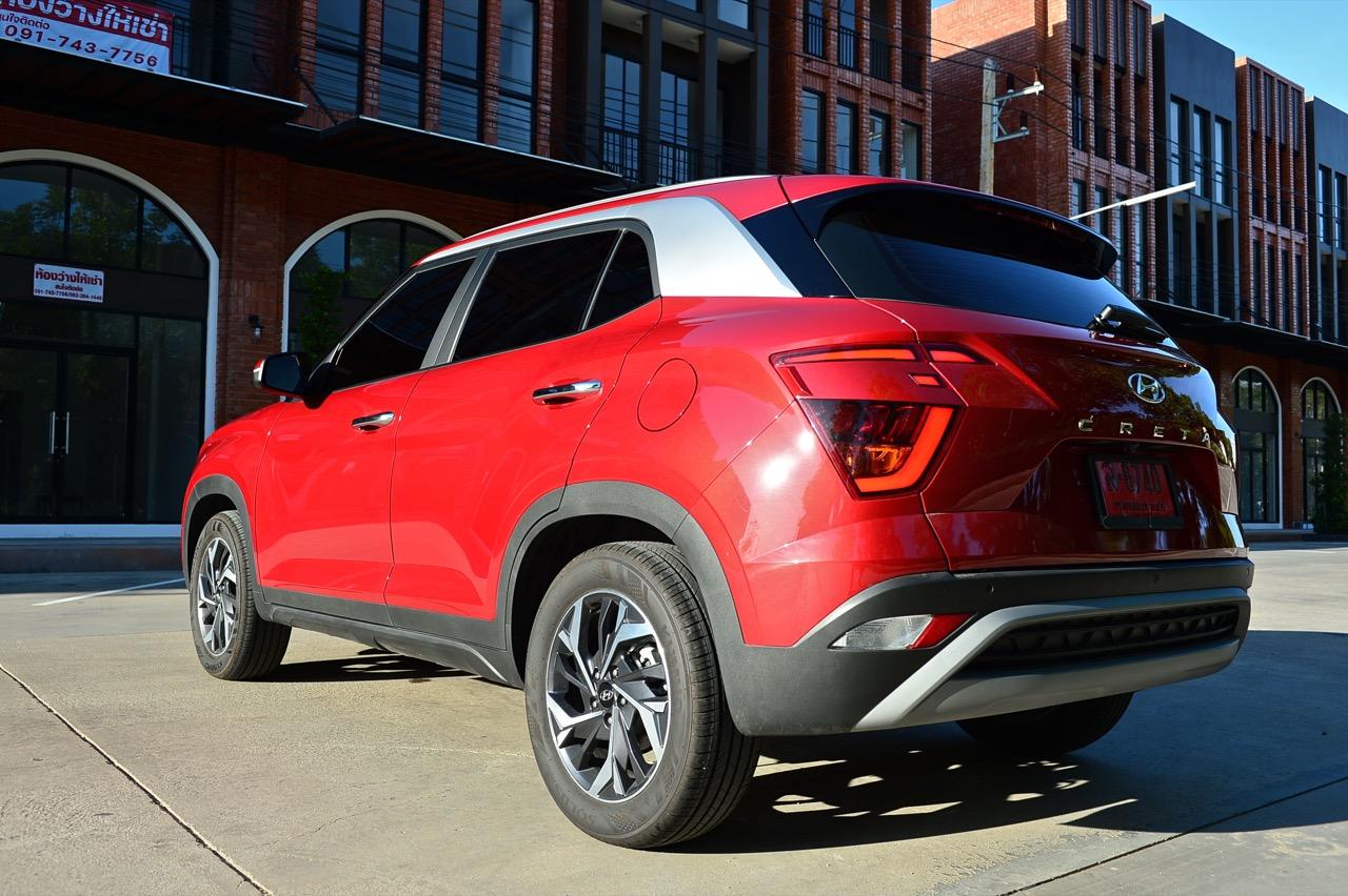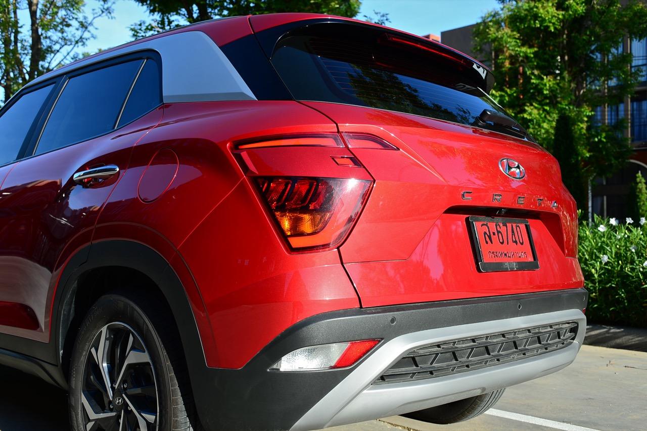บั้นท้ายดูกลมๆ จากการออกแบบทรงด้านข้างและรูปแบบของไฟท้าย สัดส่วนของกระจกบานฝาท้ายที่โค้งและกินพื้นที่ไปจนถึงขอบของเสาท้ายเป็นอีกจุดที่ Hyundai ออกแบบได้ดี ไฟท้ายทรงบูมเมอแรงที่แตกต่างไปจากไฟท้ายของรถคู่แข่งและมีรูปแบบเฉพาะตัว ดีไซน์สวยงามใช้ได้แต่ดูเล็กไปนิดและไม่มีเส้นเชื่อมระหว่างตำแหน่งไฟท้ายทั้งสองข้าง ขอบของฝาท้ายด้วยเสริมมุมมองให้บั้นท้ายของ Creta เฉียบคมขึ้นมาอีกนิด ฝาท้ายเปิด-ปิดด้วยมือ ไม่มีระบบฝาท้ายไฟฟ้าซึ่งน่าเสียดายอยู่เหมือนกันเพราะถ้าให้ฝาท้ายไฟฟ้ามาจะครบกว่านี้มาก