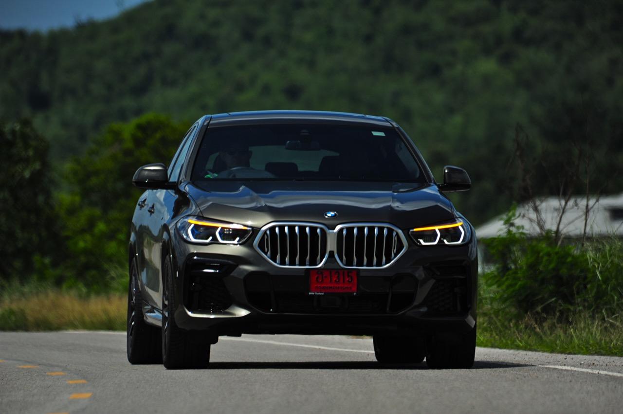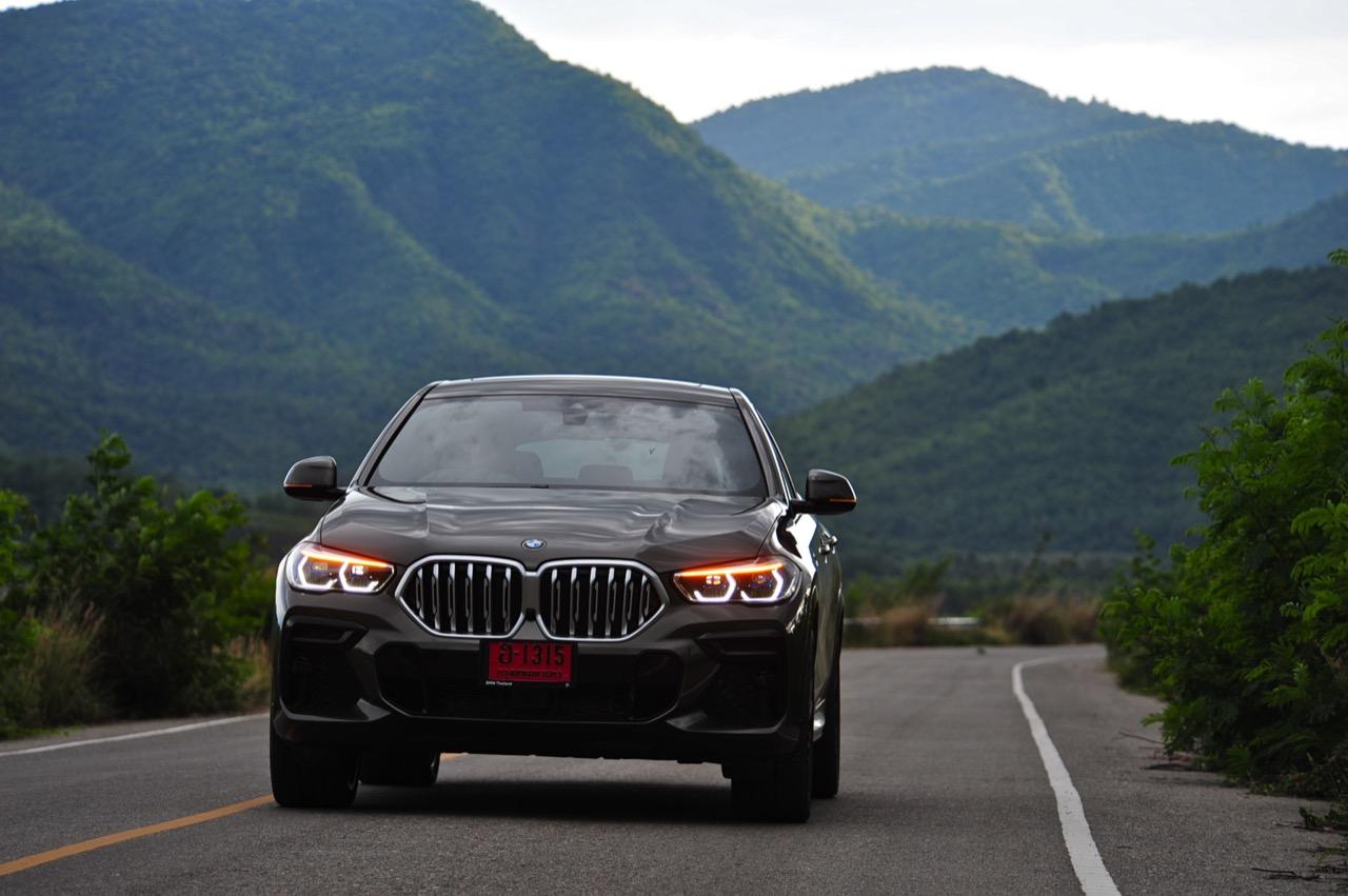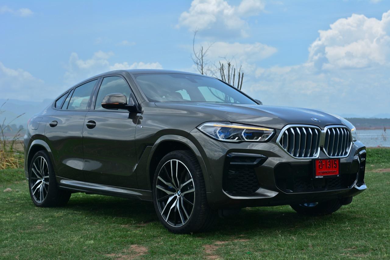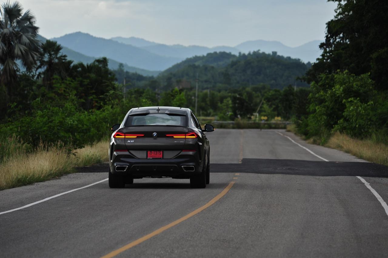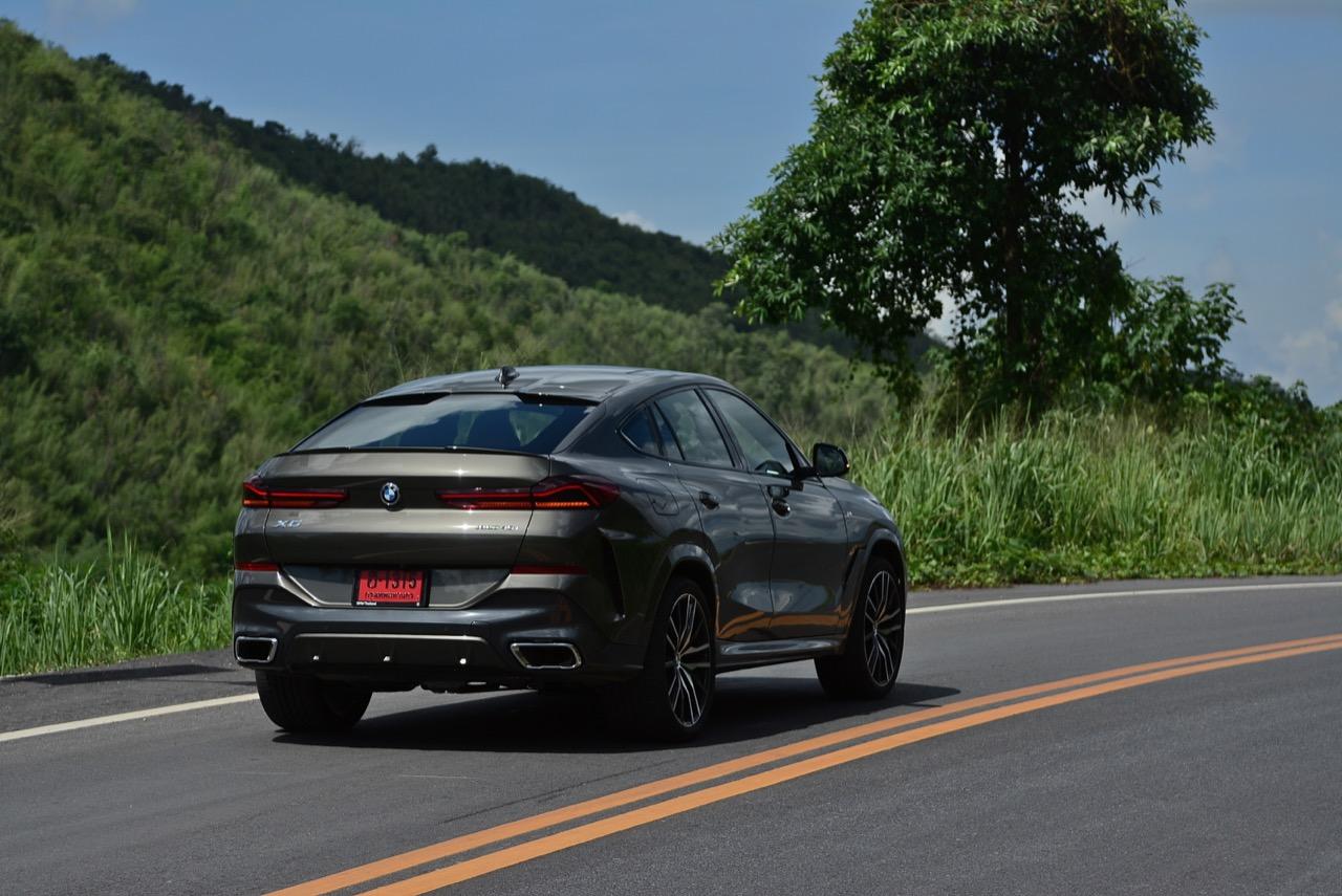 ชุดแต่ง M Sport ทำให้ X6 ที่ใหญ่ขึ้นในทุกมิติยกเว้นความสูง หน้าตาที่ดูดุดันเกินความเป็นรถ SAV ออกแบบคล้ายกับเครื่องจักรขนาดใหญ่ที่พร้อมจะกระโจนไปข้างหน้า กระจังหน้าที่มีไฟอยู่ข้างในทำให้มันคล้ายหุ่น transformers และทำให้รถที่วิ่งอยู่ข้างหน้าในช่องทางด้านขวาหลบเข้าซ้ายกันอย่างจ้าละหวั่น ล้อ 22 นิ้วใหญ่โตสมกับขนาดความกว้างของซุ้มล้อ บั้นท้ายมีชิ้นส่วนของระบบ Aero Dynamic อยู่เต็มไปหมดแต่ไม่ยักกะรกรุงรัง คุณสามารถมองเห็นช่องระบายอากาศที่แก้มข้าง ซึ่งทำหน้าที่ให้อากาศไหลผ่าน (อย่างราบรื่น) ราวกับซุปเปอร์คาร์ กระจังหน้าที่ปิดได้เอง ทำหน้าที่ลดแรงต้านของอากาศให้เหลือน้อยที่สุด เช่นเดียวกับห้องโดยสารที่อุดมไปด้วยของเล่นไฮเทค เครื่องยนต์เบนซิน 3.0 ลิตร ตัวเดียวกับ X5 45e (แต่ไม่มีมอเตอร์ไฟฟ้า) มีแรงบิดเหลือเฟือสำหรับการใช้งาน ทั้งขับปกติและขับเร็วจี๋ การที่มันเป็นรถประกอบไทย ทำให้ค่าตัวเมื่อบวกกับอัตราภาษีที่ร้อนแรงลดลงไปถึง 1.8 ล้านบาท น้ำหนัก 2 ตัน มีความอวบเกือบจะเท่ากับ Mercedes-G Wagon แชสซีอะลูมิเนียม กับกันโคลง Active Roll Stabilization พิสูจน์แล้วว่าเกาะถนนเป็นเยี่ยม ซึ่งเดี๋ยวได้รู้กันตอนขับทางไกล