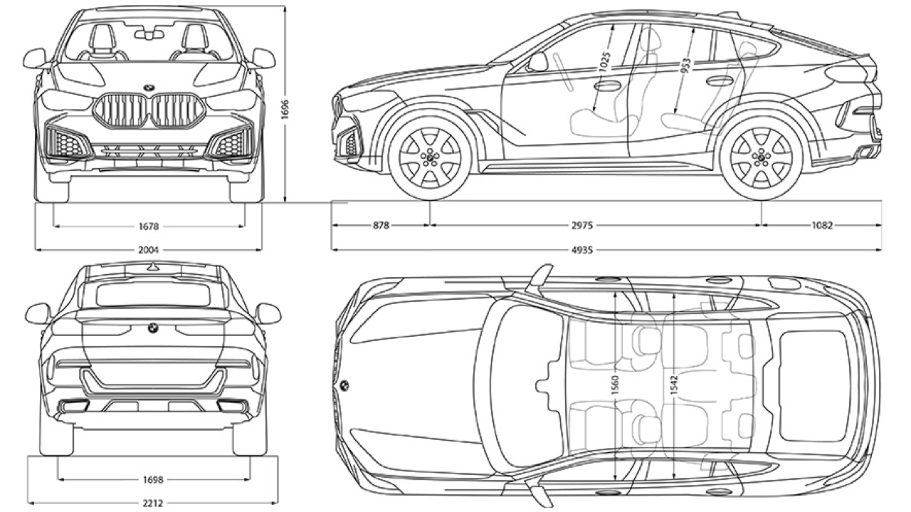 มิติตัวถังของ BME X6 xDRIVE 40i M Sport มีขนาดความยาว 4,935 มิลลิเมตร กว้าง 2,004 มิลลิเมตร สูง 1,696 มิลลิเมตร ความยาวฐานล้อ 2,975 มิลลิเมตร ความกว้างล้อหน้า 1,678 มิลลิเมตร ความกว้างล้อหลัง 1,698 มิลลิเมตร ระยะโอเวอร์แฮงก์หน้า 878 มิลลิเมตร ระยะโอเวอร์แฮงก์หลัง 1,082 มิลลิเมตร ค่าสัมประสิทธิแรงเสียดทานอากาศ (เมื่อปิดกระจัง) cd 0.34 ระยะเลี้ยวกลับรถ 12.6 เมตร น้ำหนักตัวรถทั้งคัน 2,055 กิโลกรัม น้ำหนักรถสูงสุด (โหลด) 2,975 กิโลกรัม น้ำหนักบรรทุกสูงสุด 740 กิโลกรัม ความจุถังเชื้อเพลิง 83 ลิตร