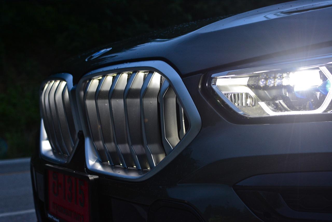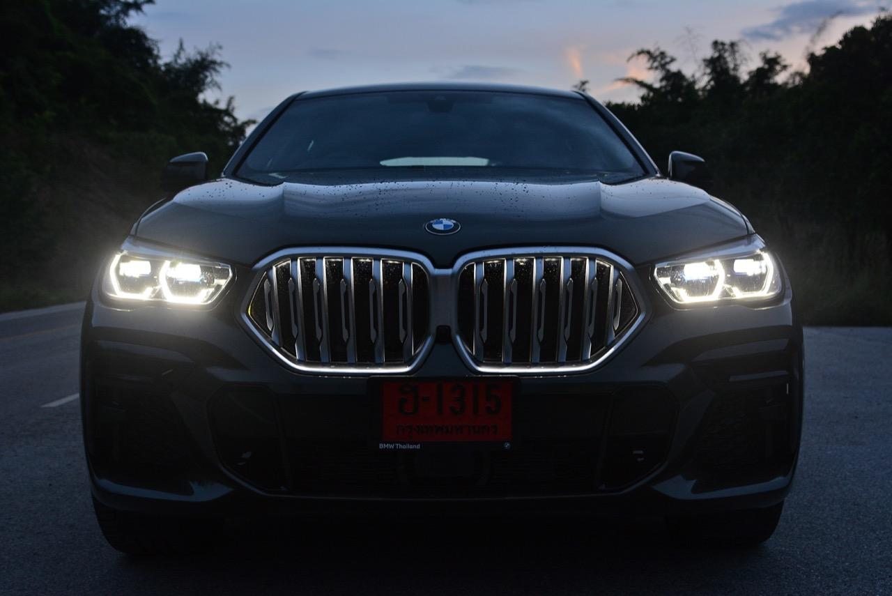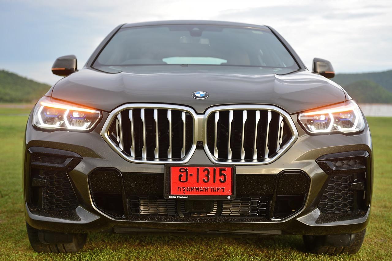 BMW X6 เดินทางมาถึงเจเนอเรชันที่ 3 ด้วยรหัสตัวถัง G06 รถทดสอบรุ่น xDRIVE 30d M Sport สี Manhattan Green Metallic ราคาตัวประกอบไทย อยู่ที่ 5,499,000 บาท ยิ่งดูใกล้ๆ ก็ยิ่งทำให้นึกถึงแฮตช์แบ็กทรงล้ำอนาคตที่ถูกขยายสัดส่วนทั้งความกว้าง ความยาว ส่วนความสูงลดลงเล็กน้อย ไฟหน้าและกระจังหน้าที่เป็นเอกลักษณ์ของรุ่นนั้นสวยงามดุดันมากกว่าเดิม เทคโนโลยีที่ก้าวล้ำของหลอดไฟ LED ที่ทำงานร่วมกับเซนเซอร์ในระบบส่องสว่างแบบอัตโนมัติด้วยระบบไฟ BMW Laserlight ภายในกรอบไฟหน้าตกแต่งด้วยพลาสติกสีฟ้าที่มีรูปทรงคล้ายก้างปลา กระจังหน้าพร้อมระบบเปิด-ปิดอัตโนมัติ เมื่อเครื่องยนต์มีอุณหภูมิต่ำ กระจังจะปิดเพื่อกั้นไม่ให้กระแสลมไหลผ่าน ซึ่งทำให้แรงต้านอากาศลดลง กระจังจะเปิดออกเองโดยอัตโนมัติ เมื่อเซนเซอร์ตรวจพบว่าอุณหภูมิของห้องเครื่องยนต์อยู่ในเกณฑ์ที่จะต้องระบายความร้อนอย่างรวดเร็ว กันชน M ใน X6 รุ่นปี 2022 ออกแบบช่องรับอากาศขนาดใหญ่ และมีรูปแบบที่ปรับเปลี่ยนไปจากกันชนของ X6 รุ่นปี 2019 บริเวณใต้กระจังหน้าและด้านข้างของชุดกันชนทั้งสองฝั่ง มีช่องรับอากาศทรงรังผึ้ง ไฟตัดหมอกไม่มีความจำเป็นอีกต่อไป เนื่องจากระบบไฟ BMW Laserlight ในโหมดอัตโนมัตินั้นสว่างมาก ขณะที่สภาพอากาศไม่ดี ชุดไฟหน้าแบบใหม่ จะเพิ่มความสว่างขณะขับบนถนนที่กำลังมีหมอกลงจัด ช่วยเปิดทัศนวิสัยด้านหน้าขณะขับท่ามกลางความมืด ฝนตกหนัก หรือในสภาพอากาศที่เลวร้าย