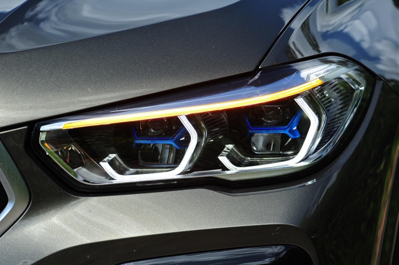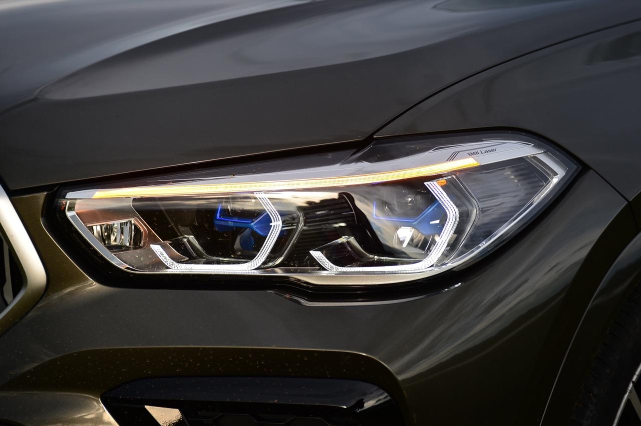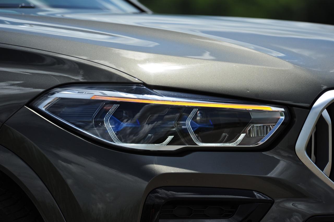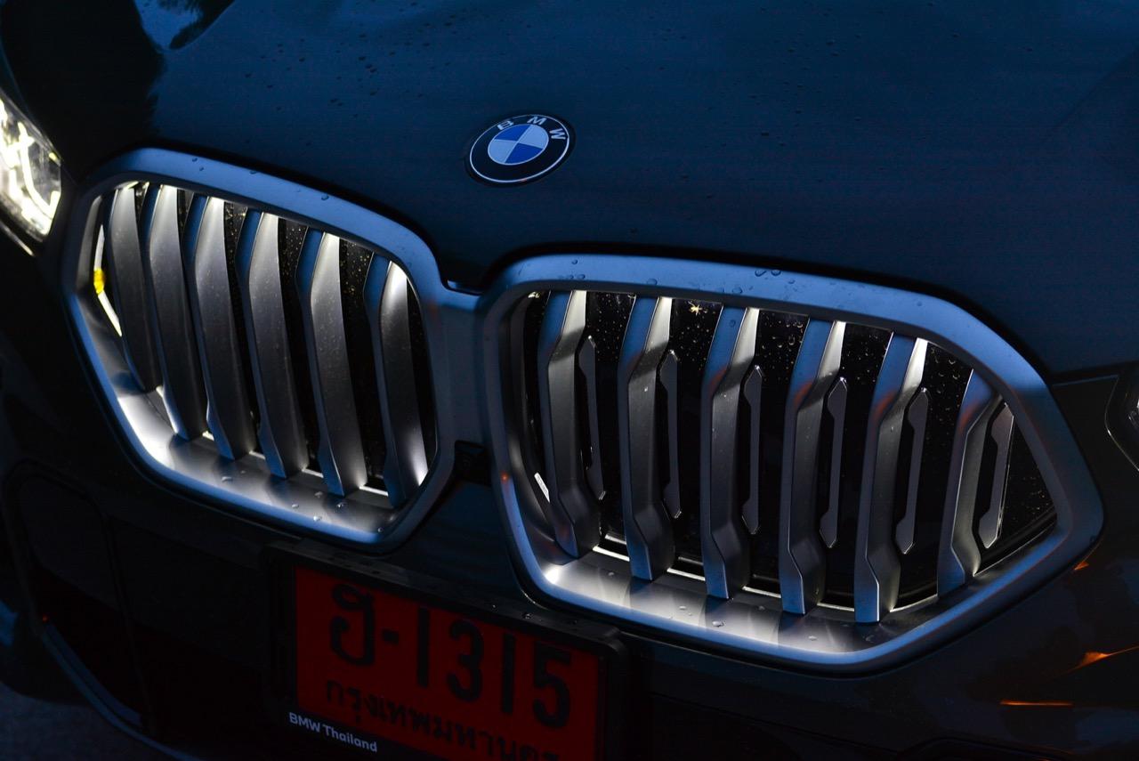 BMW X6 เดินทางมาถึงเจเนอเรชันที่ 3 ด้วยรหัสตัวถัง G06 รถทดสอบรุ่น xDRIVE 30d M Sport สี Manhattan Green Metallic ราคาตัวประกอบไทย อยู่ที่ 5,499,000 บาท ยิ่งดูใกล้ๆ ก็ยิ่งทำให้นึกถึงแฮตช์แบ็กทรงล้ำอนาคตที่ถูกขยายสัดส่วนทั้งความกว้าง ความยาว ส่วนความสูงลดลงเล็กน้อย ไฟหน้าและกระจังหน้าที่เป็นเอกลักษณ์ของรุ่นนั้นสวยงามดุดันมากกว่าเดิม เทคโนโลยีที่ก้าวล้ำของหลอดไฟ LED ที่ทำงานร่วมกับเซนเซอร์ในระบบส่องสว่างแบบอัตโนมัติด้วยระบบไฟ BMW Laserlight ภายในกรอบไฟหน้าตกแต่งด้วยพลาสติกสีฟ้าที่มีรูปทรงคล้ายก้างปลา กระจังหน้าพร้อมระบบเปิด-ปิดอัตโนมัติ เมื่อเครื่องยนต์มีอุณหภูมิต่ำ กระจังจะปิดเพื่อกั้นไม่ให้กระแสลมไหลผ่าน ซึ่งทำให้แรงต้านอากาศลดลง กระจังจะเปิดออกเองโดยอัตโนมัติ เมื่อเซนเซอร์ตรวจพบว่าอุณหภูมิของห้องเครื่องยนต์อยู่ในเกณฑ์ที่จะต้องระบายความร้อนอย่างรวดเร็ว กันชน M ใน X6 รุ่นปี 2022 ออกแบบช่องรับอากาศขนาดใหญ่ และมีรูปแบบที่ปรับเปลี่ยนไปจากกันชนของ X6 รุ่นปี 2019 บริเวณใต้กระจังหน้าและด้านข้างของชุดกันชนทั้งสองฝั่ง มีช่องรับอากาศทรงรังผึ้ง ไฟตัดหมอกไม่มีความจำเป็นอีกต่อไป เนื่องจากระบบไฟ BMW Laserlight ในโหมดอัตโนมัตินั้นสว่างมาก ขณะที่สภาพอากาศไม่ดี ชุดไฟหน้าแบบใหม่ จะเพิ่มความสว่างขณะขับบนถนนที่กำลังมีหมอกลงจัด ช่วยเปิดทัศนวิสัยด้านหน้าขณะขับท่ามกลางความมืด ฝนตกหนัก หรือในสภาพอากาศที่เลวร้าย