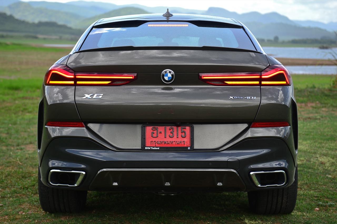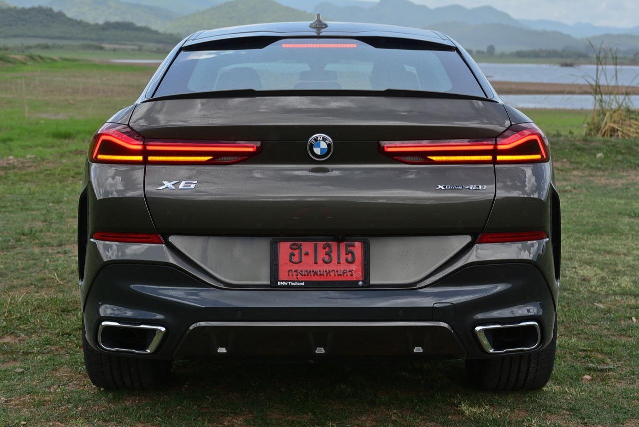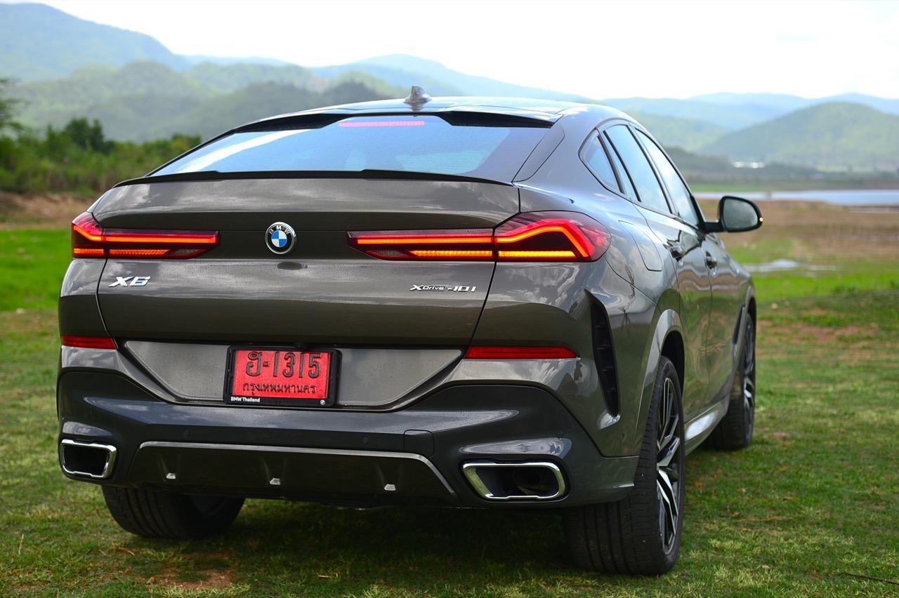 รูปลักษณ์ที่ดุดันของ X6 ใหม่ ส่วนหนึ่งเกิดจากความใหญ่โตของตัวถังกับล้อ M ขนาด 22 นิ้ว เติมช่องเปิดบริเวณแก้มข้างที่เด่นชัด ห่อรัดด้วยยางสปอร์ตสมรรถนะสูง เพื่อทำให้ได้ประโยชน์จากการเพิ่มระดับของการยึดเกาะ เส้นหลังคาไหลลาดลงด้านหลัง ซึ่งลงท้ายด้วยความละเอียดอ่อน สปอยเลอร์ชิ้นเล็กๆ แปะติดกับขอบของฝาท้าย ซุ้มล้อหลังที่แผ่กว้างผสมผสานเข้ากับส่วนโค้งเว้าของการออกแบบกันชนหลัง บั้นท้ายของ X6 เป็นแบบแยกส่วนสองชั้นที่ใช้งานได้จริง มีการเพิ่มเติมความสวยงามด้วยการออกแบบไฟท้ายทรงยาวที่ขนานในแนวนอนไปกับขอบของฝาท้าย บั้นท้ายของมันยังได้รับการปรับปรุงประสิทธิภาพในด้านอากาศพลศาสตร์ ส่วนที่ลงตัวและซับซ้อนมากที่สุดก็คือ ฝาท้ายแนวของกันชนหลัง และแถบครีบรีดอากาศบริเวณชายล่างของกันชนหลัง ไฟท้าย LED รูปตัว L บางเฉียบ ประดับด้านบนของฝาท้ายโดยอยู่สูงเหนือท่อไอเสียทรงเหลี่ยม ซึ่งรวมอยู่ในแผงดิฟฟิวเซอร์ เป็นงานออกแบบที่ลงตัวและสวยงามไร้ที่ติ จุดนี้ BMW ทำออกมาได้ดีกว่าบั้นท้ายของรถคู่แข่ง