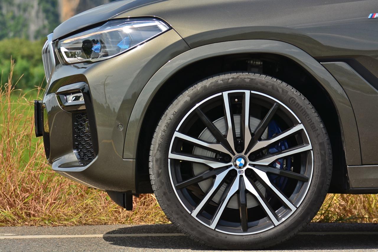 ล้ออะลูมิเนียมลายใหม่ของ M ล้อหน้าขนาดความกว้าง 9.5 J x 22" ห่อรัดด้วยยางสปอร์ต Continental Premium Contact 6 ไซส์ยางหน้า 275/35 R22 ส่วนล้อหลังเล่นใหญ่ขึ้นมาอีกนิดที่ 10.5 J x 22" ไซส์ยางหลัง ล่อกันถึง 315/30 R22 เปลี่ยนยางแต่ละครั้ง ต่อให้รวยเห็นบิลค่ายางอาจมีสะดุ้ง X6 xDRIVE 40i คันทดสอบ มีน้ำหนักตัวมากถึง 2,055 กิโลกรัม ต้องยัดเบรกประสิทธิภาพสูงของ BMW M Performance Brakes คาลิปเปอร์เบรกหน้า M แบบ 4 พอต สีน้ำเงิน พร้อมจานเบรกขนาด 400 มิลลิเมตร เบรกหลังแบบซิงเกิลพอต เส้นผ่าศูนย์กลางจานเบรกหลัง 370 มิลลิเมตร